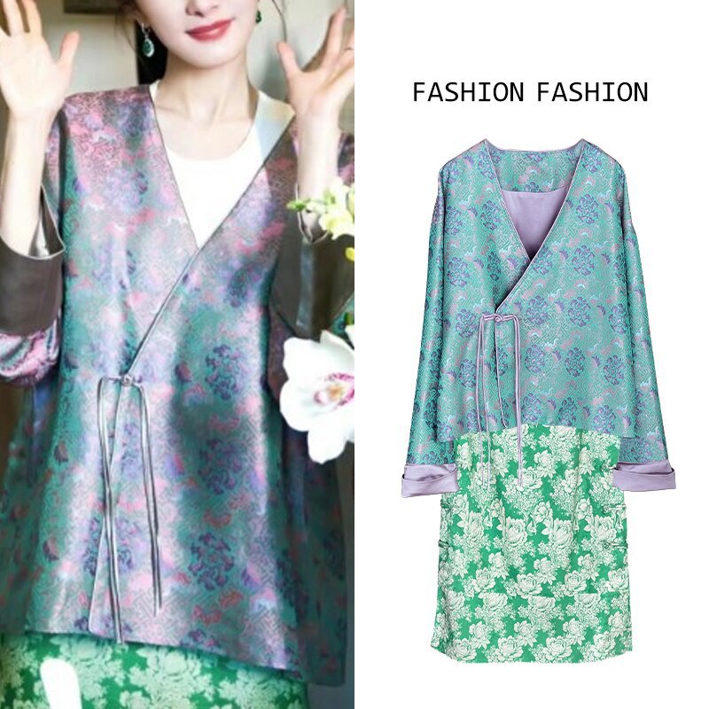 [제작 중] 2023 중국 차 의류 여성 국가 스타일 자카드 새틴 셔츠 원피스 세트스토어 가기