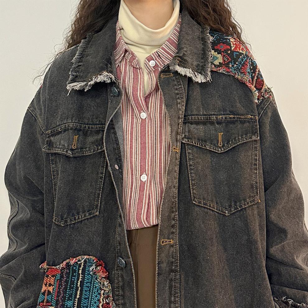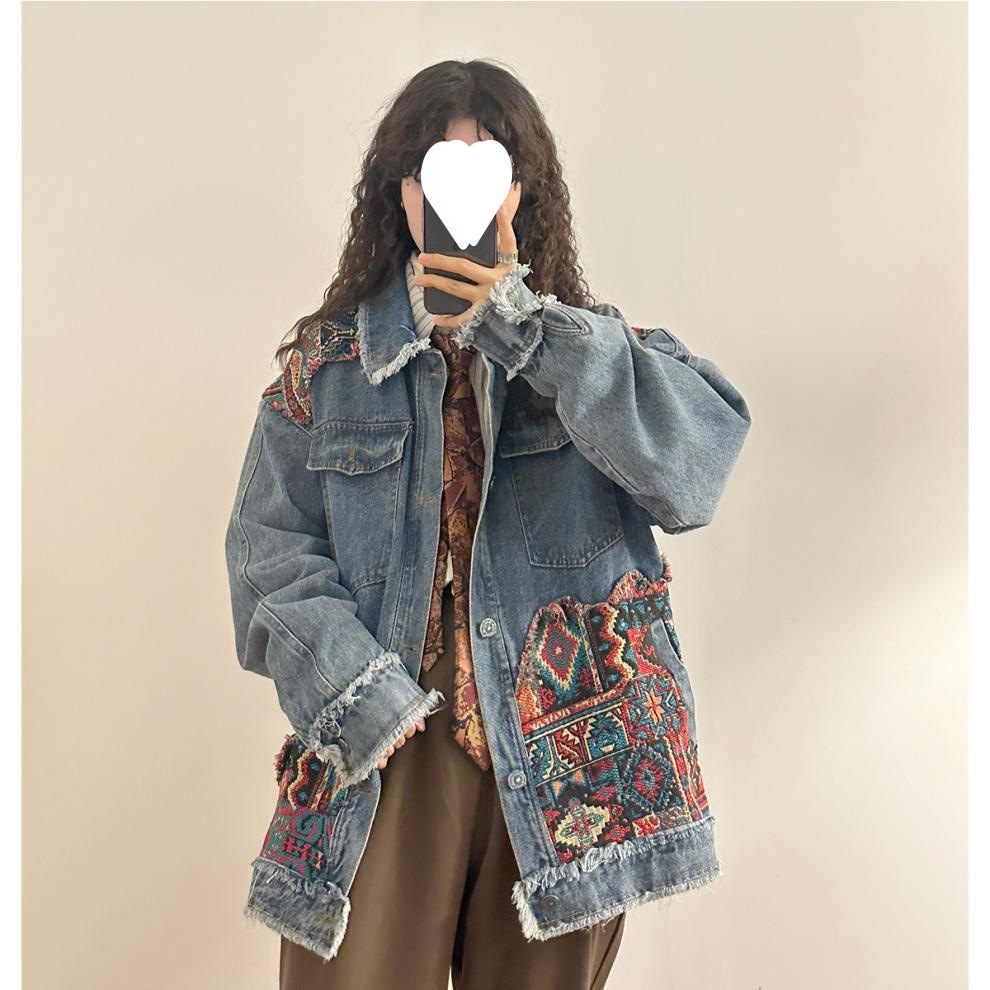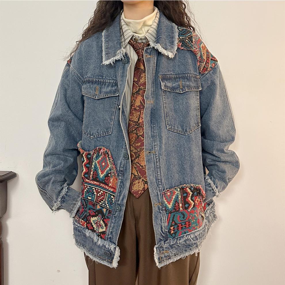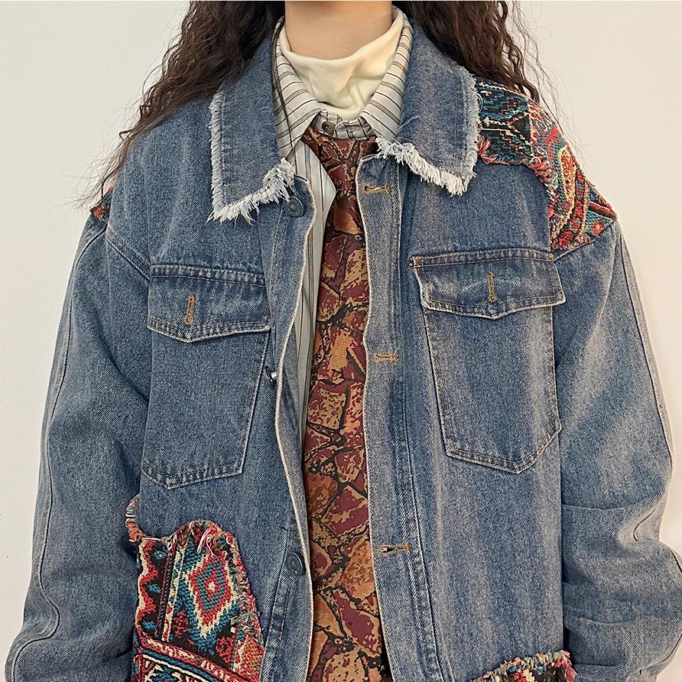 트렌디 한 브랜드 스트리트 미국 복고풍 에스닉 스타일 커플의 데님 재킷 여자의 2023 봄과 가을 바느질 워싱 작업 재킷스토어 가기