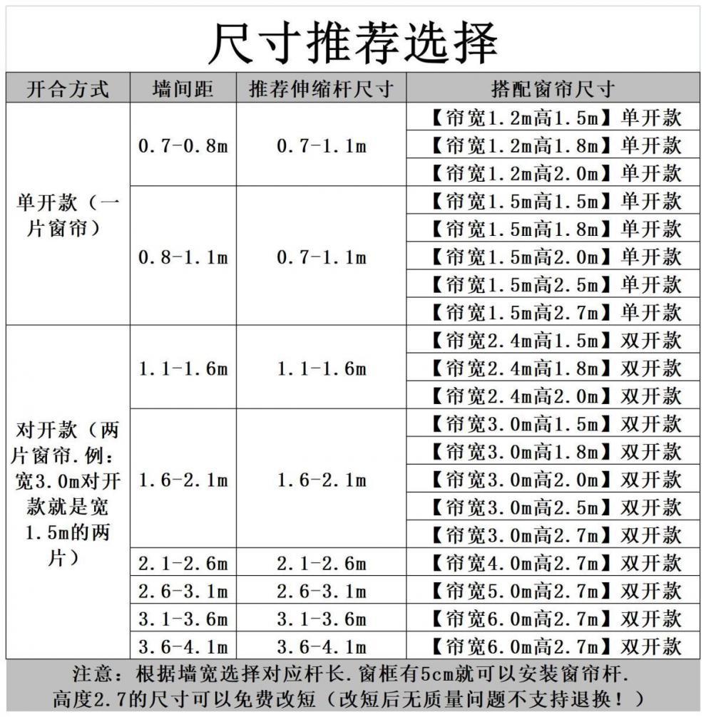 • 벽 거리 1.61-2.1m [커튼 폭 3.01m 높이 2.7m] 더블 오프닝 10 개의 후크/매달린 반지