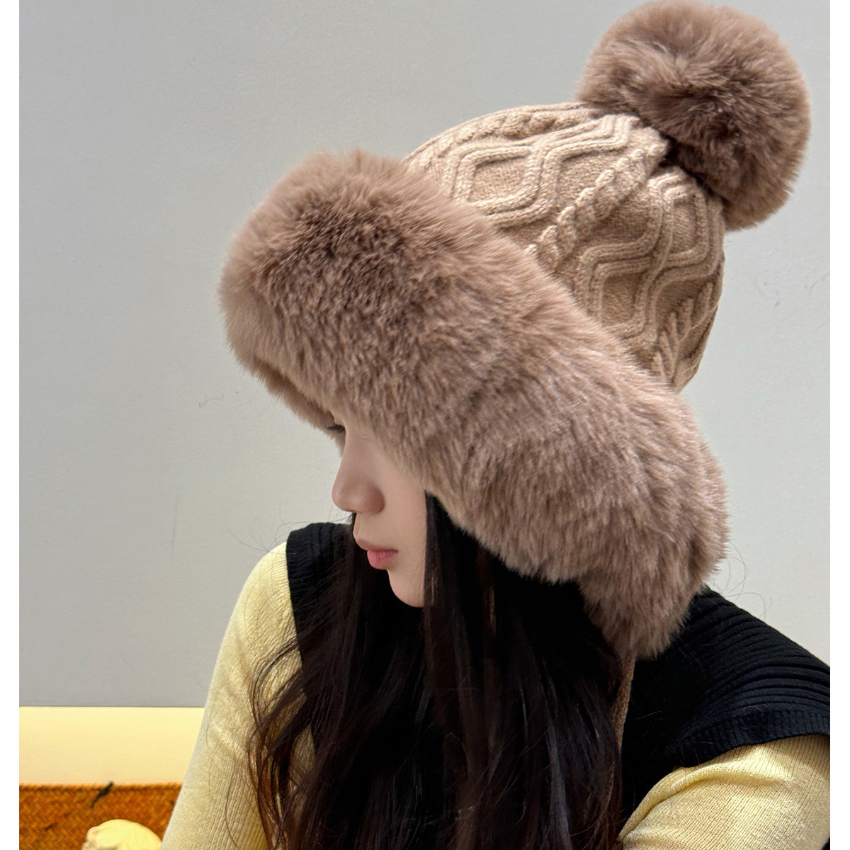 • 베이지/트위스트 몽골 플러시 모자