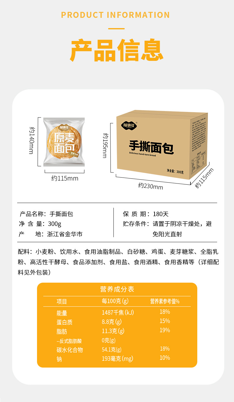 인기 상품 푸시도 300g 손으로 찢는 빵 한 박스 아침식사 저지방 부드러운 빵 건강식품 프랑스식 구식 빵