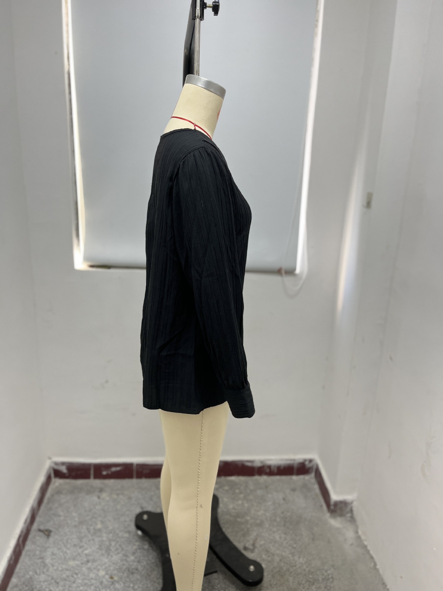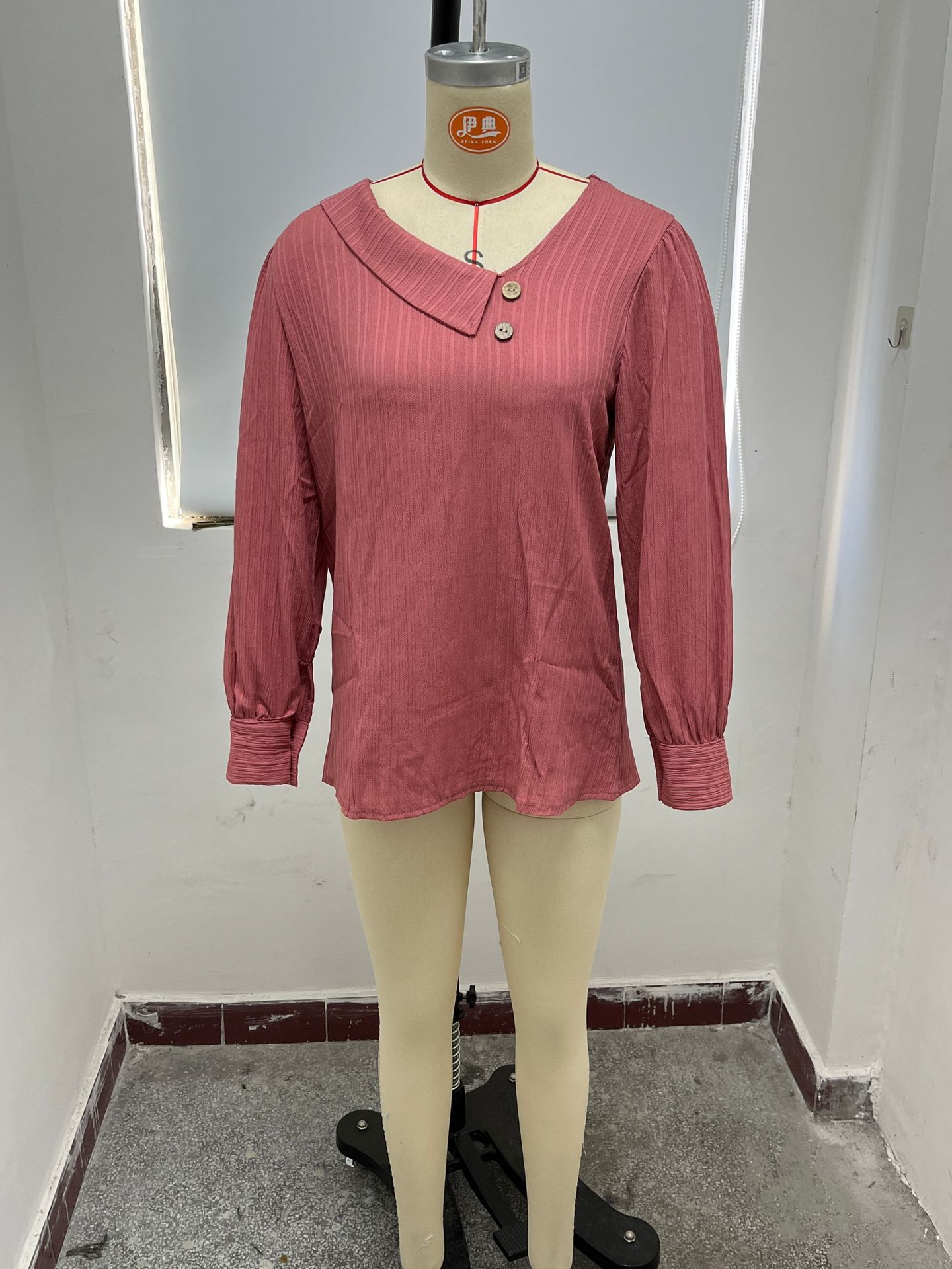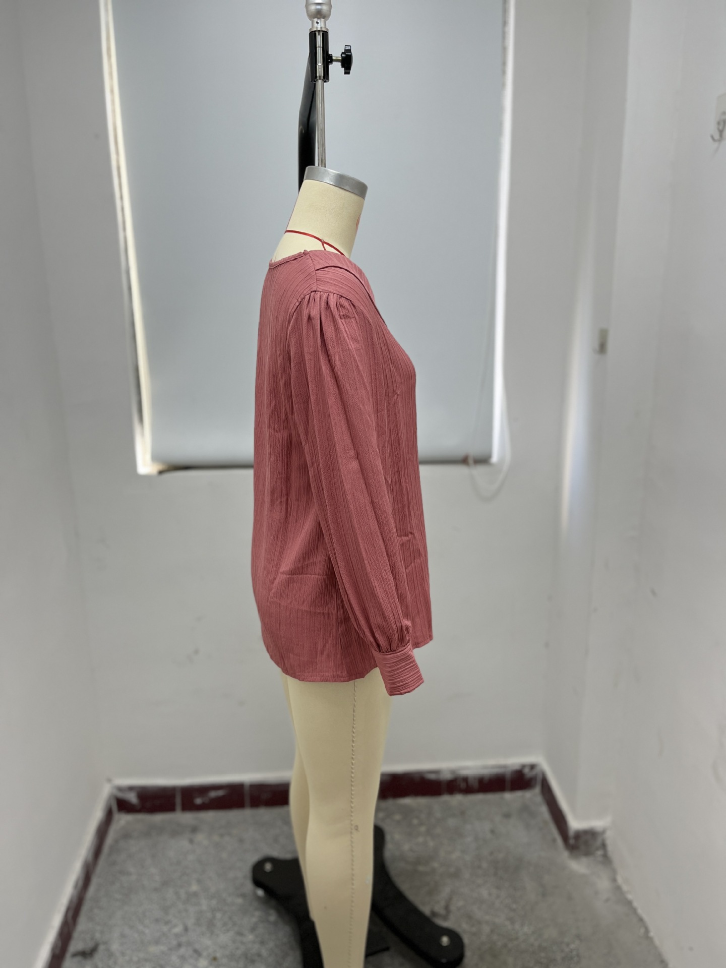 가을 2023 새로운 소원 아마존 유럽과 미국 심플한 V-넥 버튼 단색 여성용 모든 경기 긴 소매 플리츠 셔츠스토어 가기