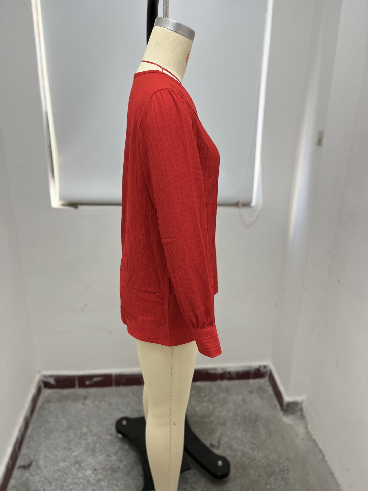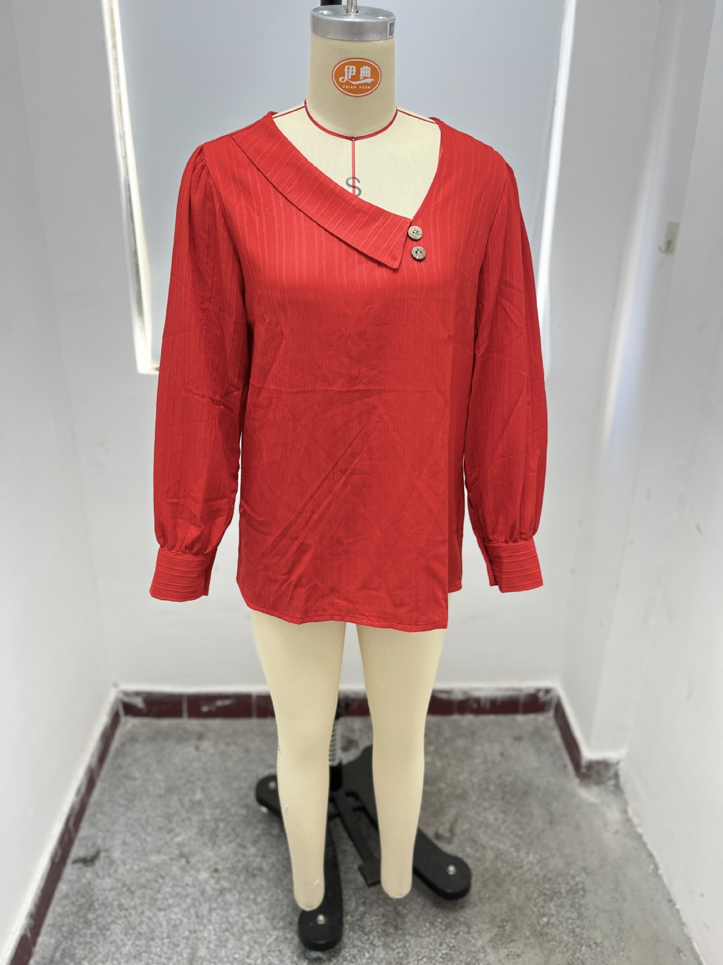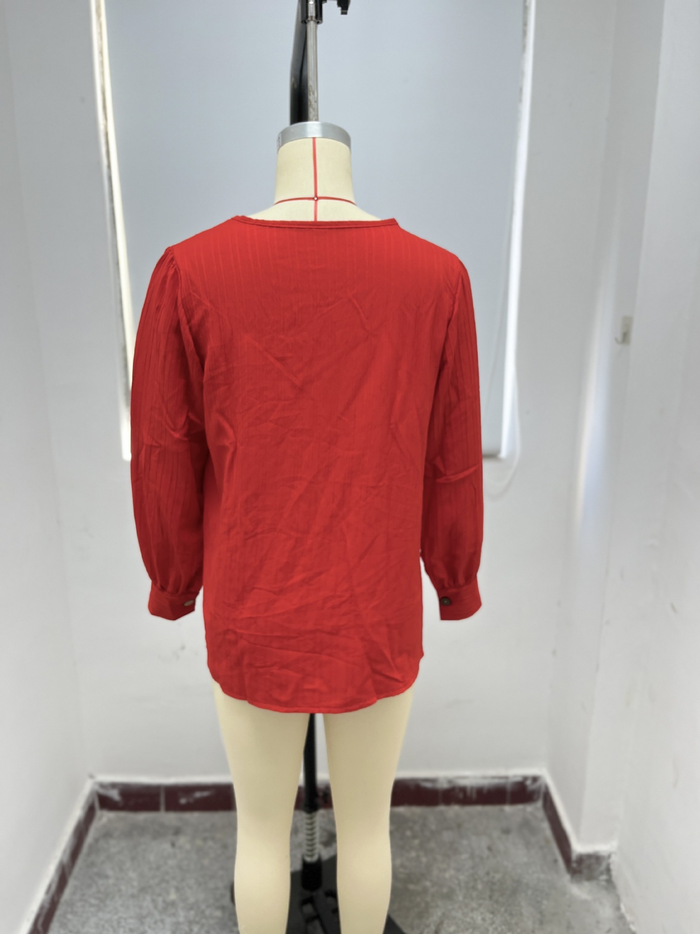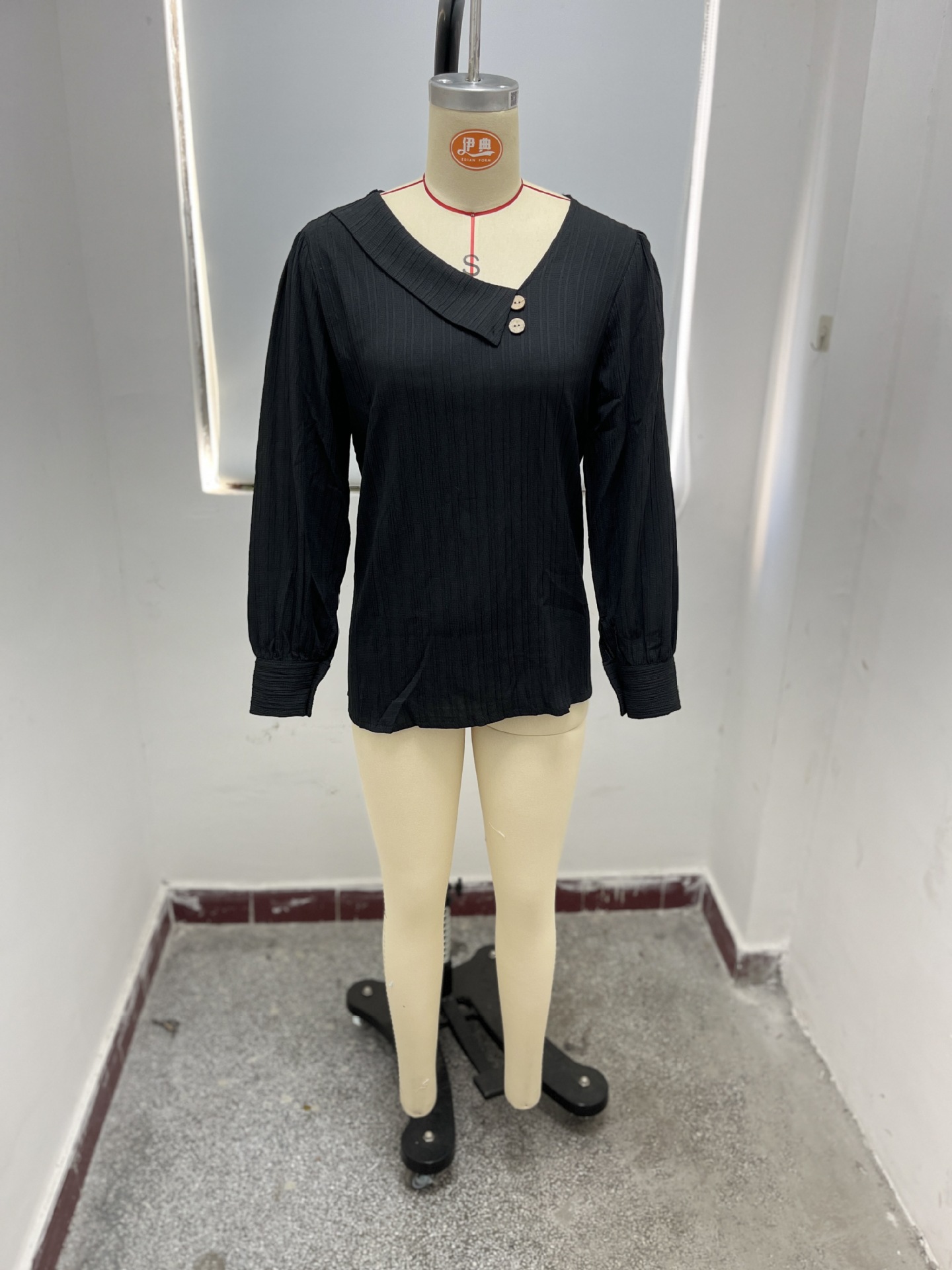 가을 2023 새로운 소원 아마존 유럽과 미국 심플한 V-넥 버튼 단색 여성용 모든 경기 긴 소매 플리츠 셔츠스토어 가기