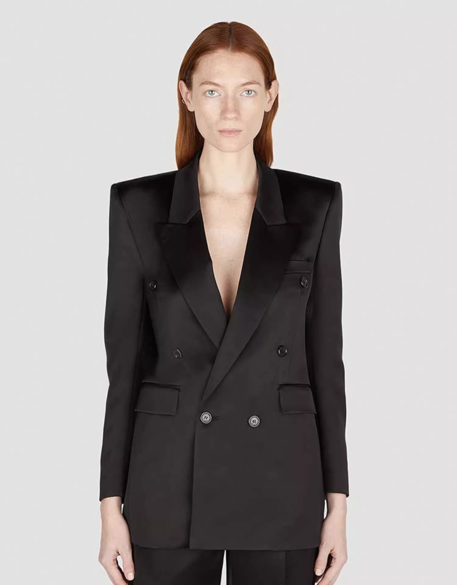 th~row 미니멀리스트 더블 브레스트 디자인 실크 새틴 어깨 패드 긴팔 정장 여성 2025 봄, 가을 새 코트 여성 의류스토어 가기