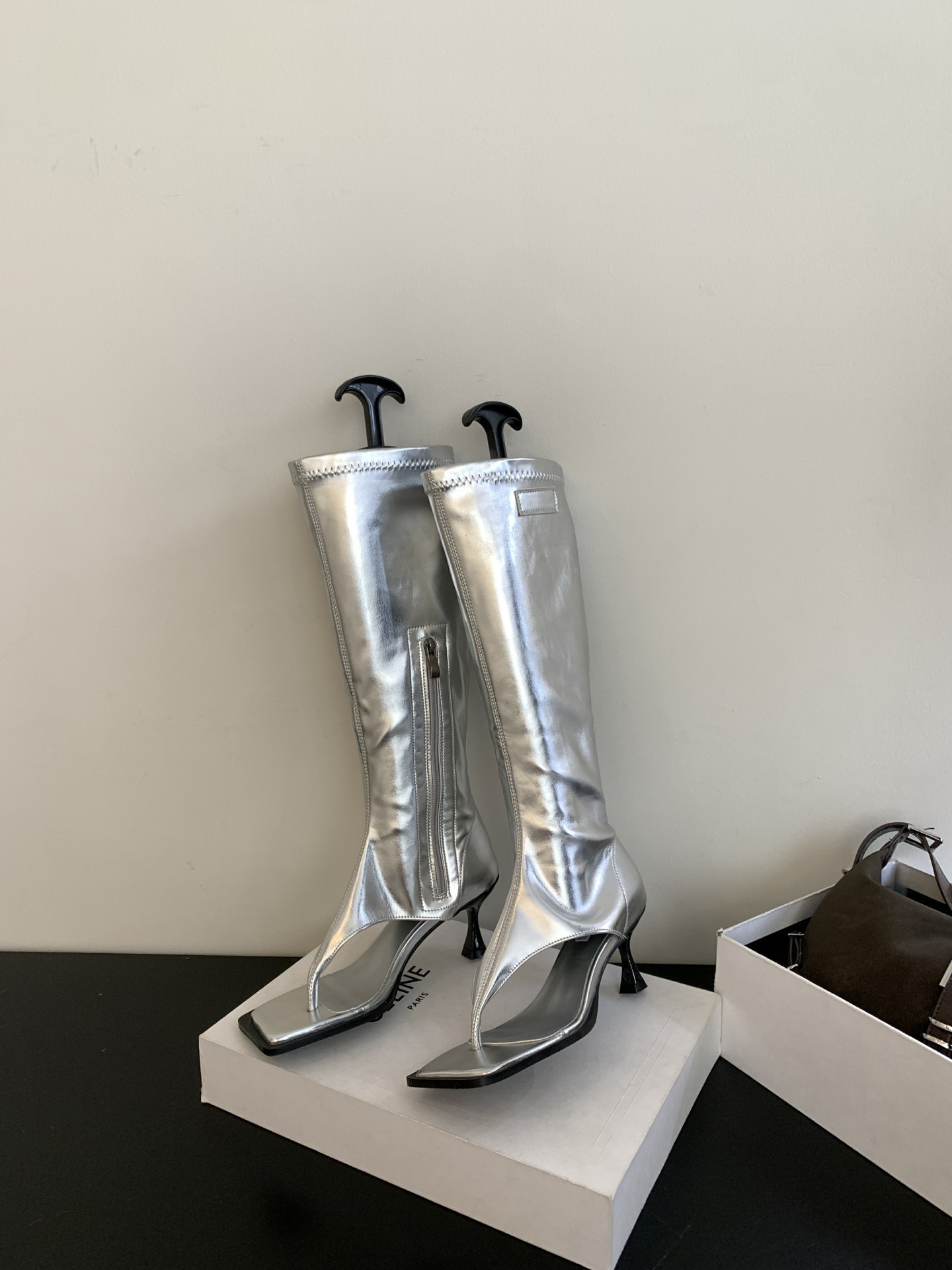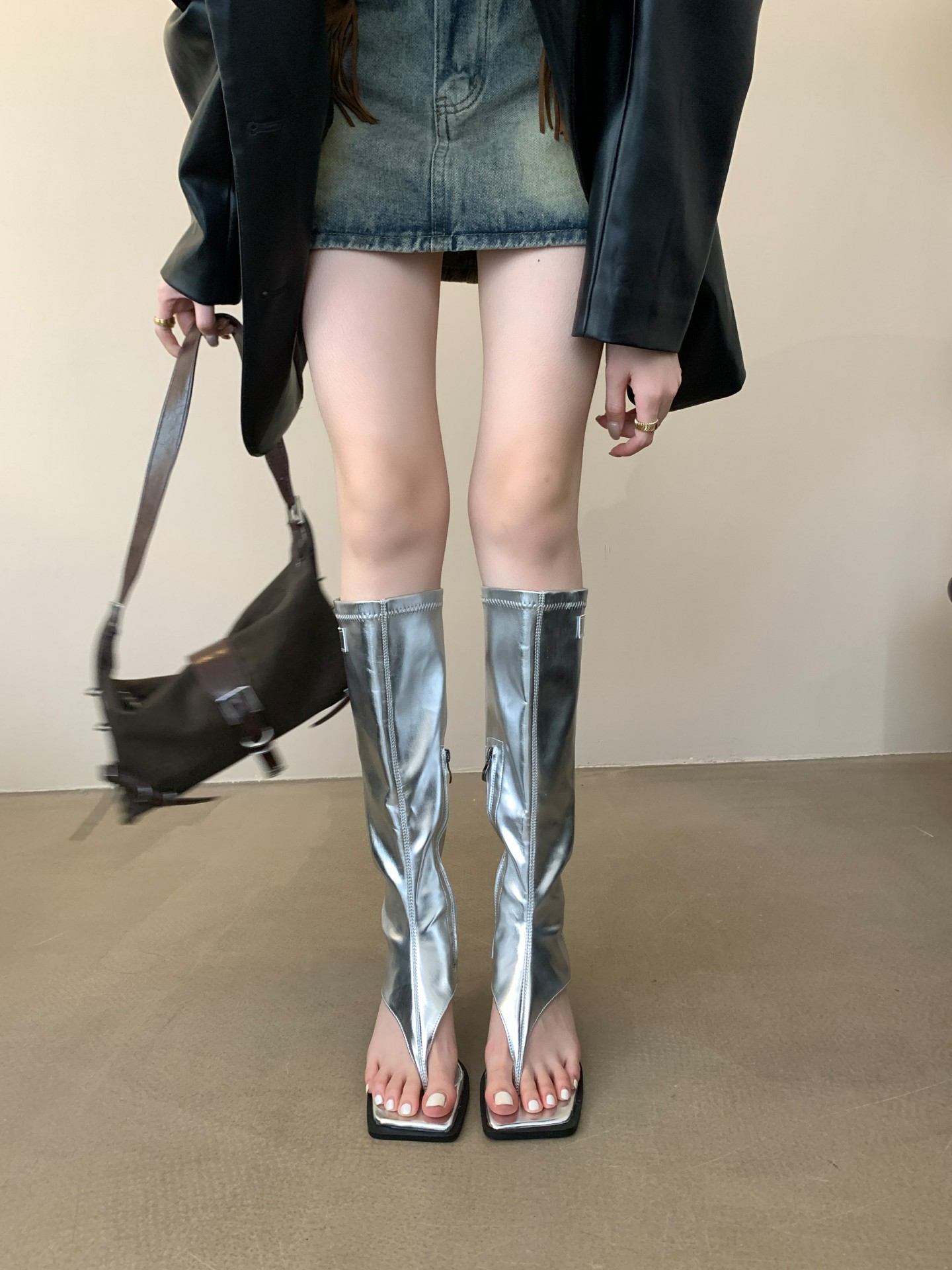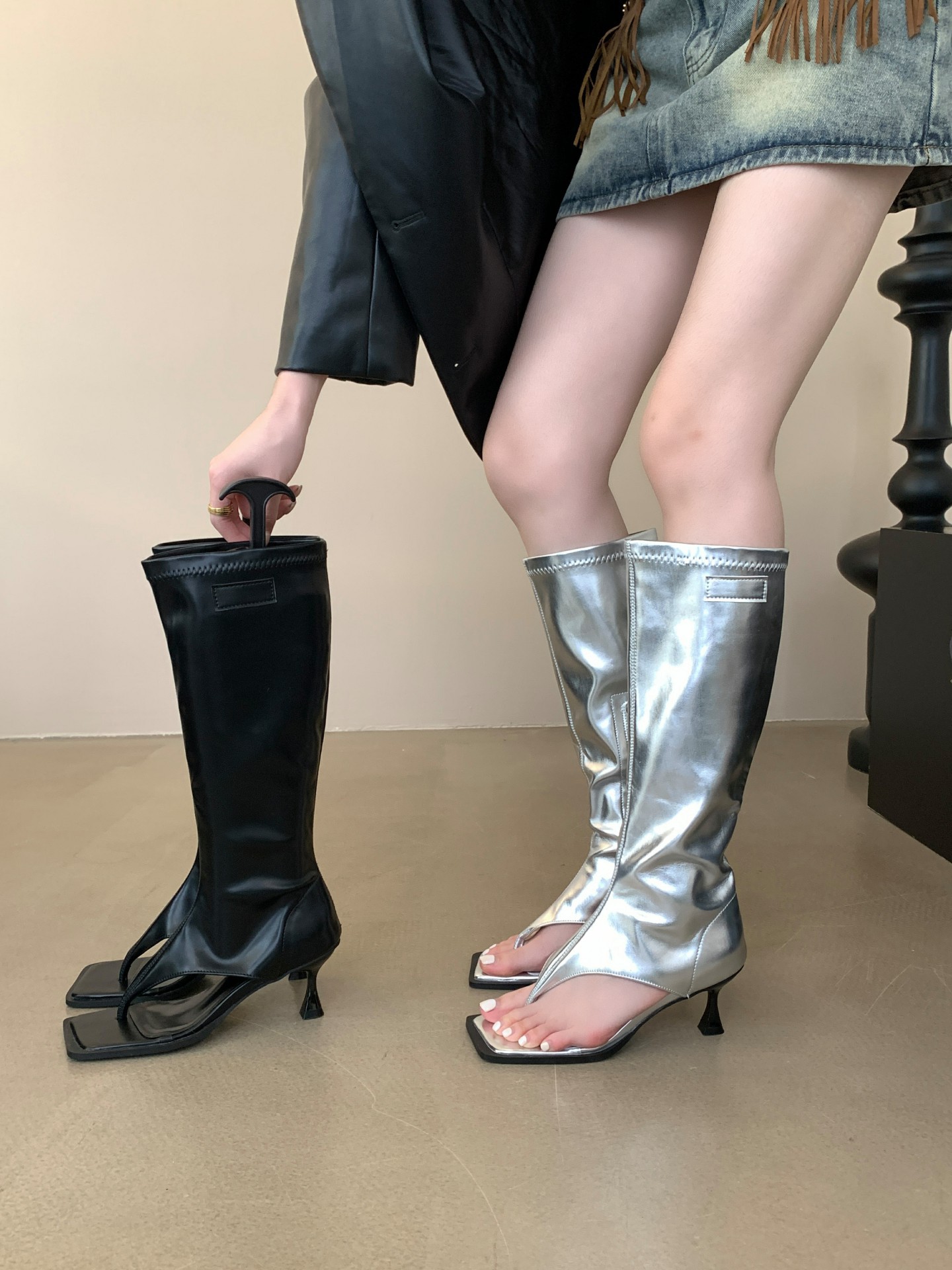 2025년 가을 신상 한국 스타일 라이트 럭셔리 하이힐 샌들 여성 패션 슬립온 가죽 부츠 다용도 외출용 핫걸 레그 워머