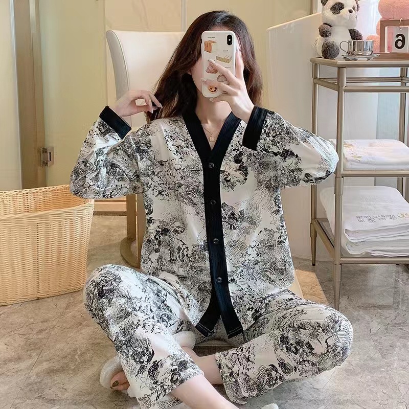 2025 봄과 가을 우유 실크 잠옷 여성 카디건 v 넥 긴팔 바지 얇은 폴카 도트 프린트 홈웨어 세트스토어 가기