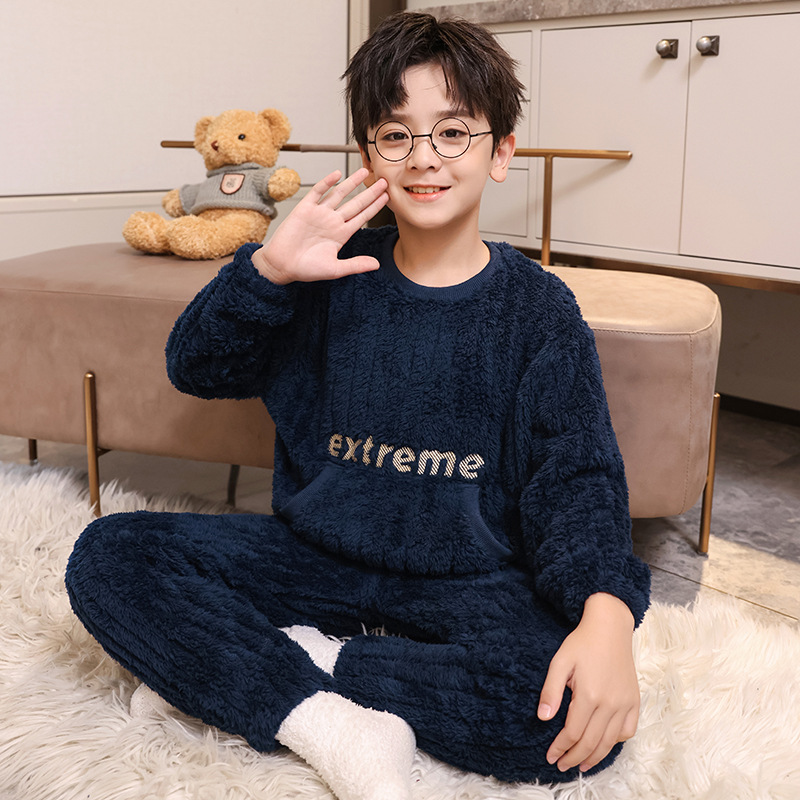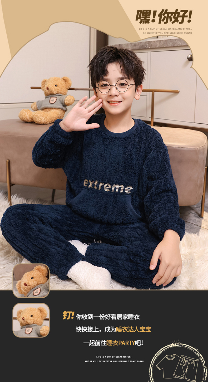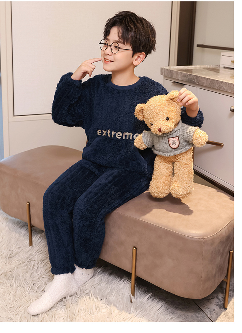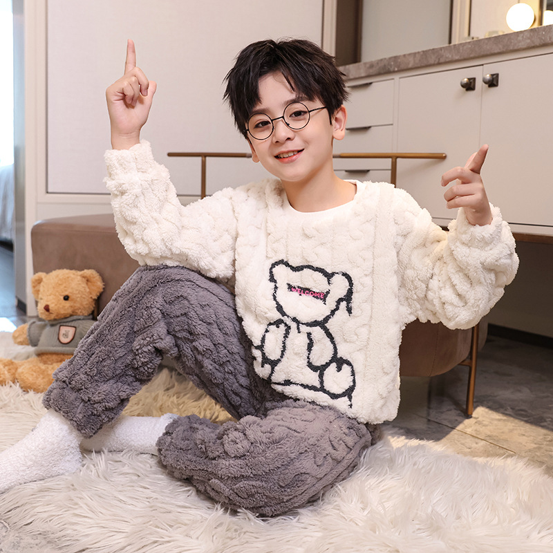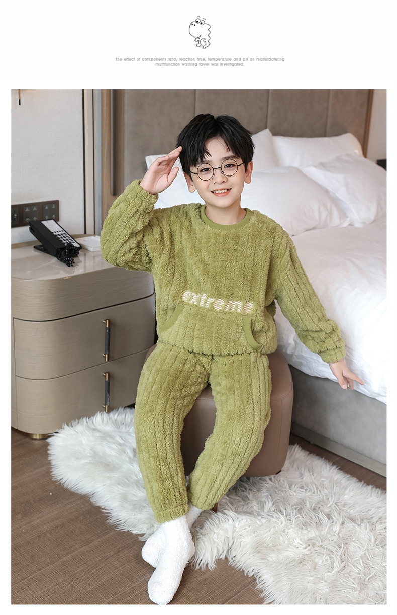 가을과 겨울 따뜻한 잠옷 플란넬 남아 '긴팔 가정복 기모 두꺼운 세트 느슨한 대형 및 중형 어린이 및 소년
