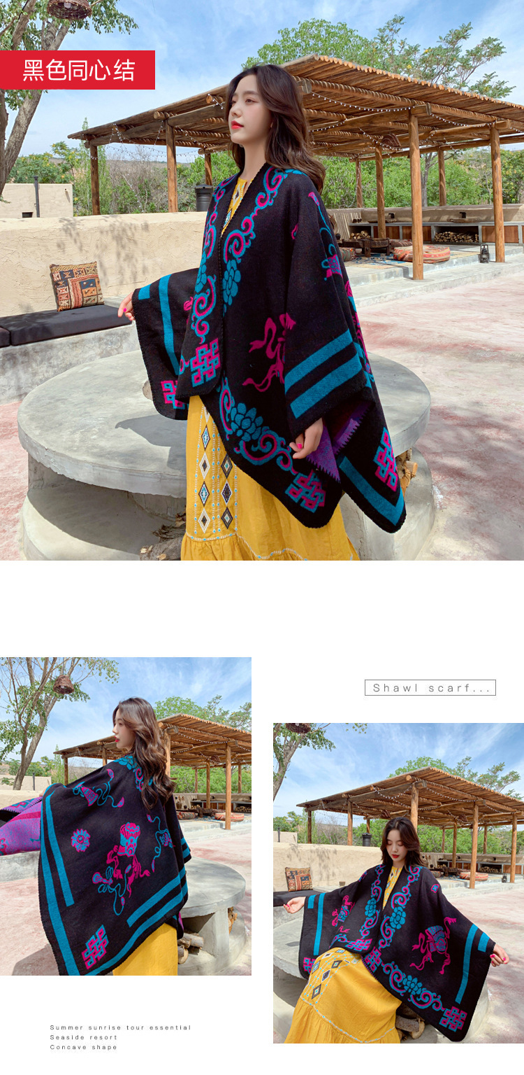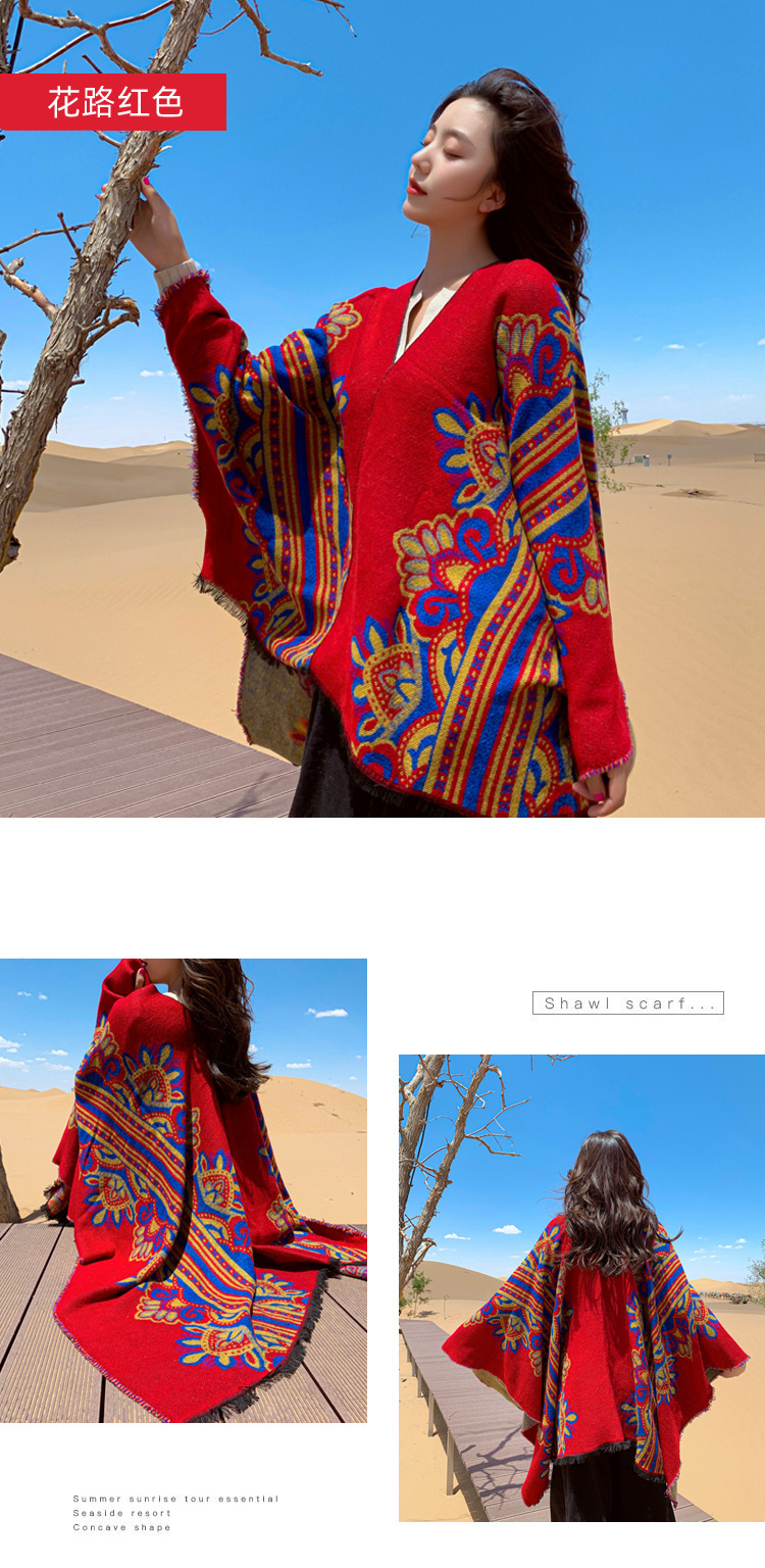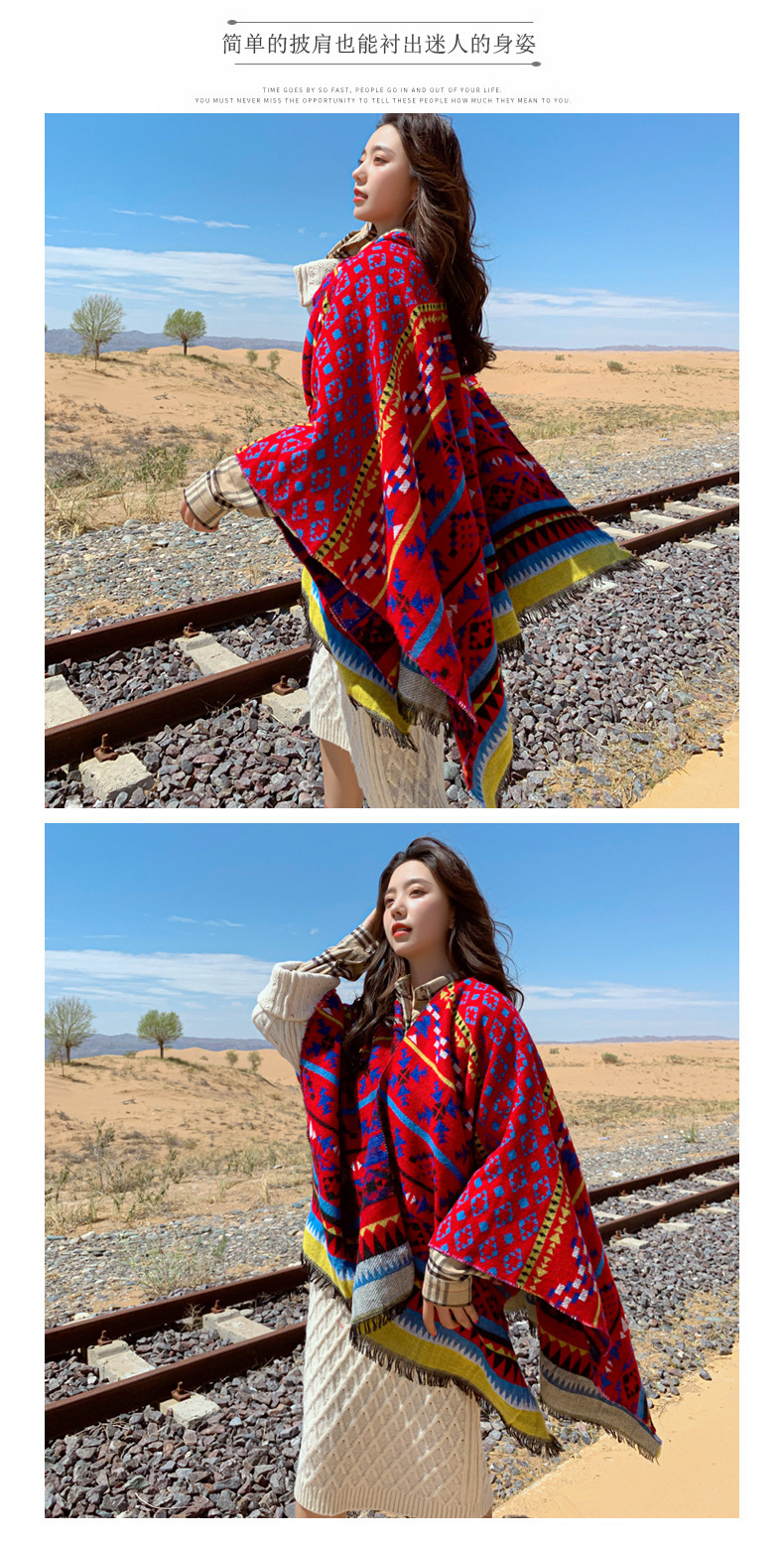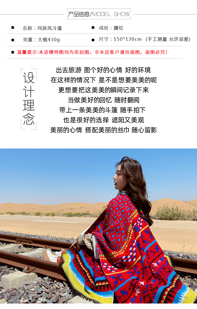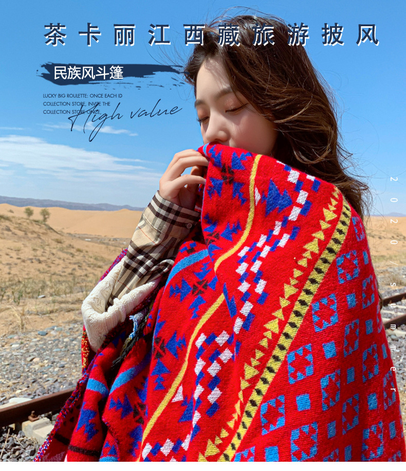 레저 여행 사진 올매치 대형 숄 야외 휴가 핀 인 개성 인쇄 에스닉 스타일 따뜻한 아우터 케이프