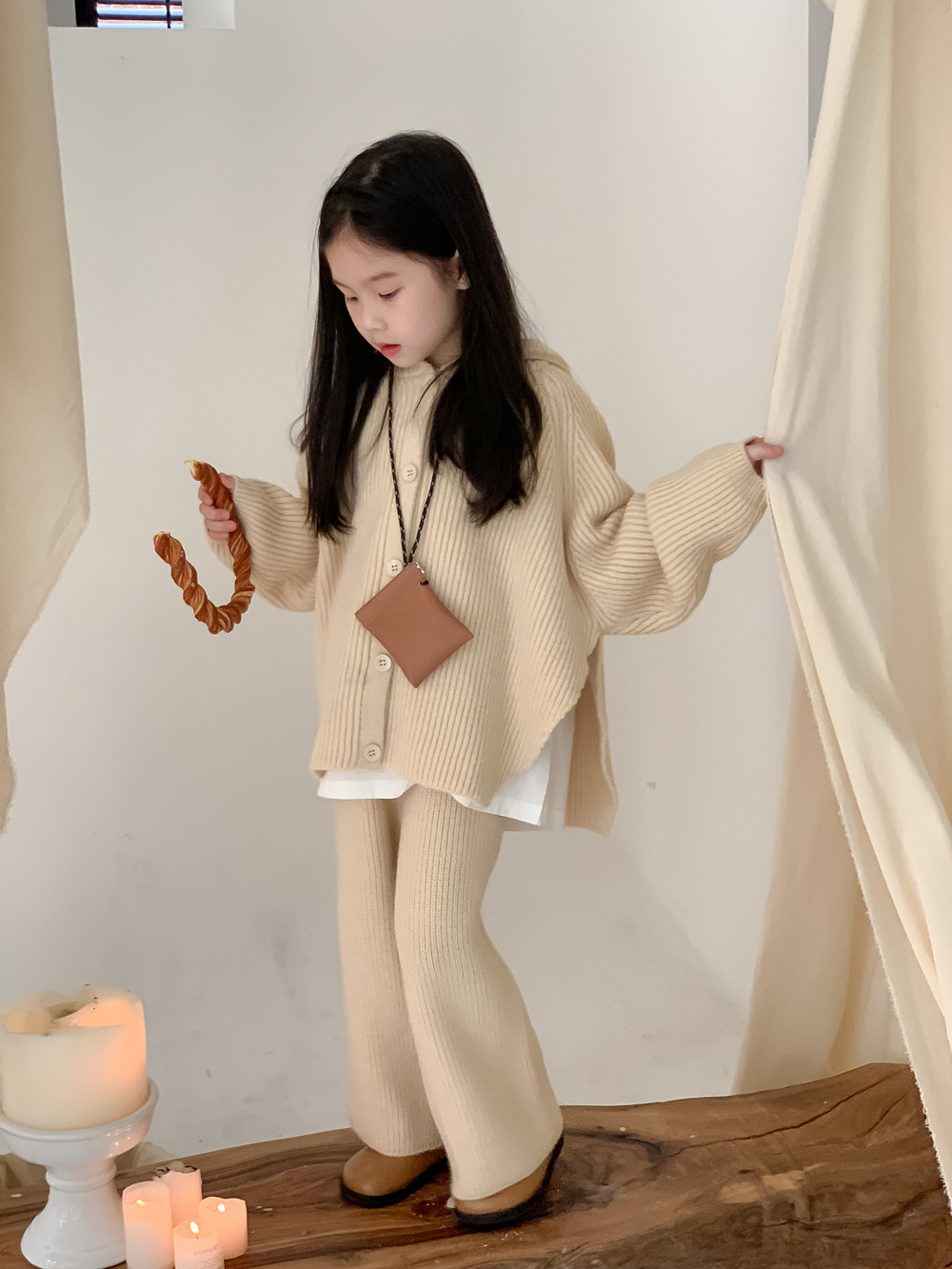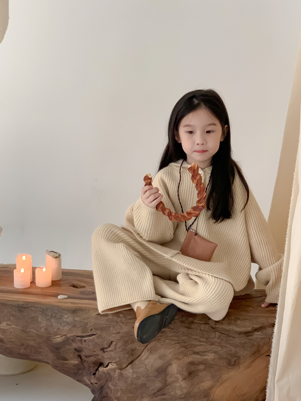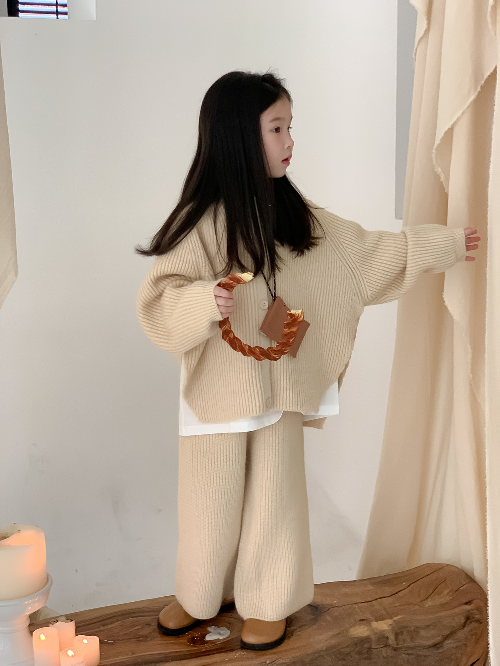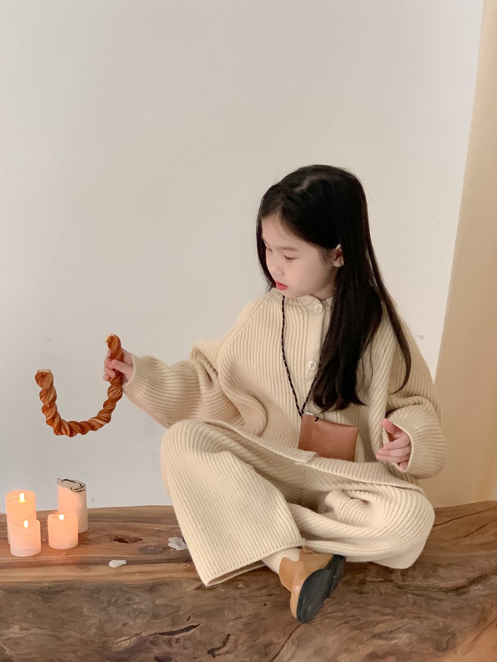 모소몽 아동복 세트 2025 겨울 여아용 한국 스타일 단색 니트 아동 캐주얼 두꺼운 후드 니트 세트