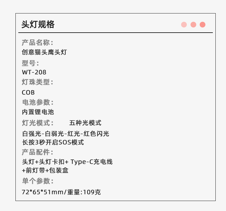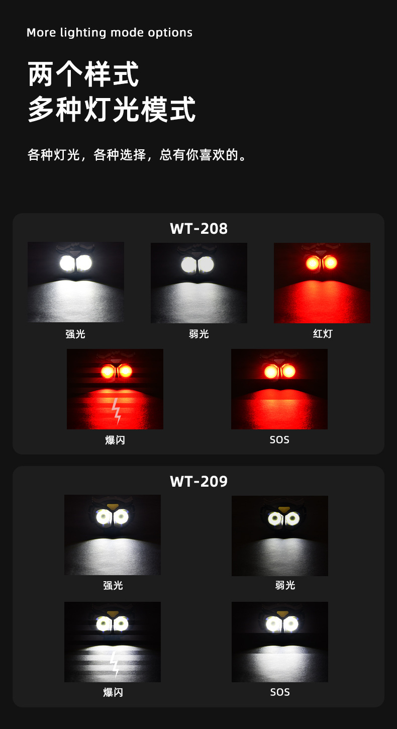 • WT-208 헤드 라이트 + 충전 케이블 + 컬러 박스 (내장 1200mAh 폴리머 배터리)