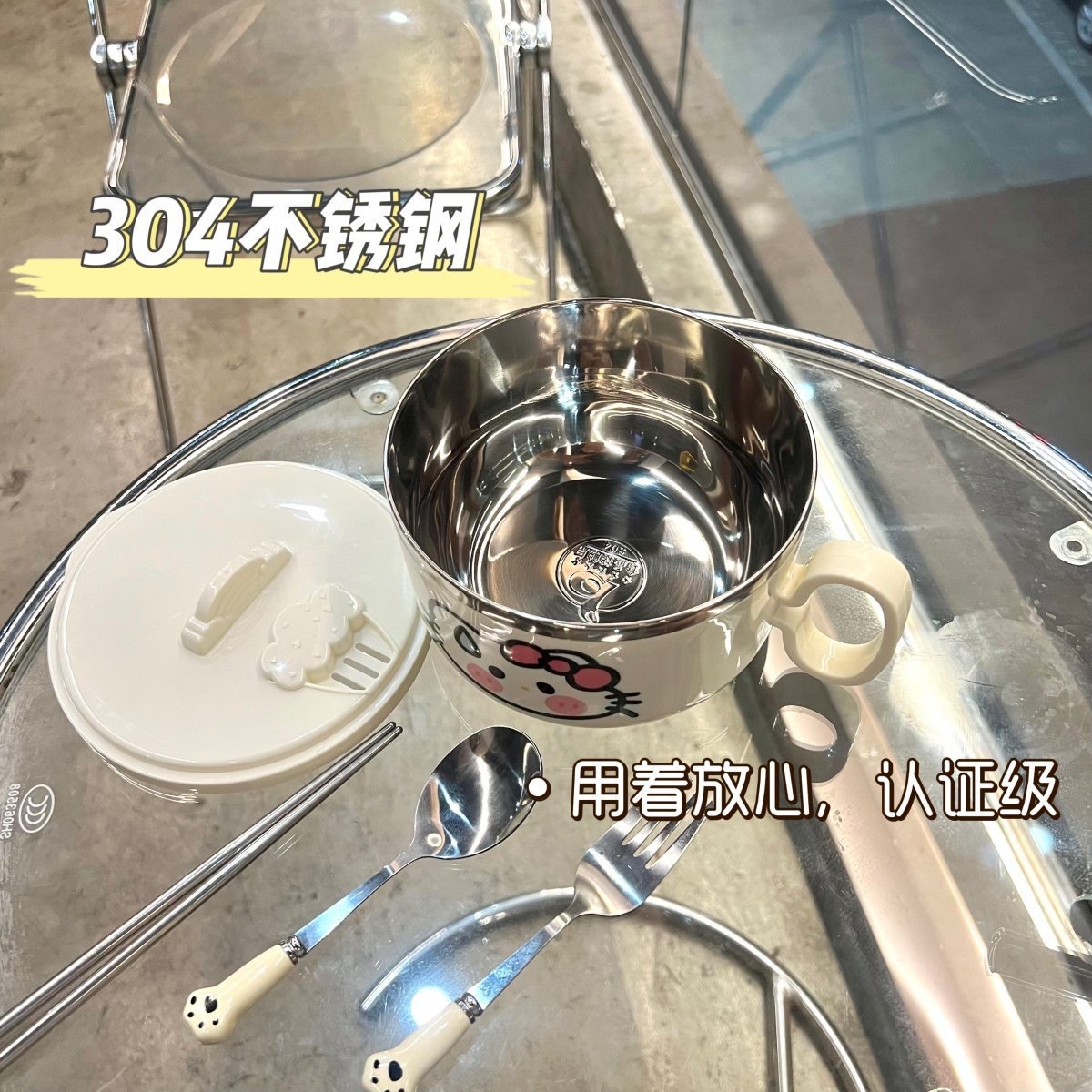속삭임없는 고양이 인스턴트 국수 그릇 304 스테인레스 스틸 대용량 배수구 뚜껑이있는 귀여운 스타일 학생 여성 매점 도시락