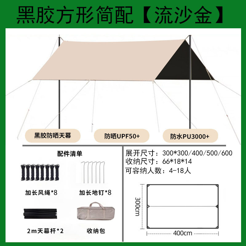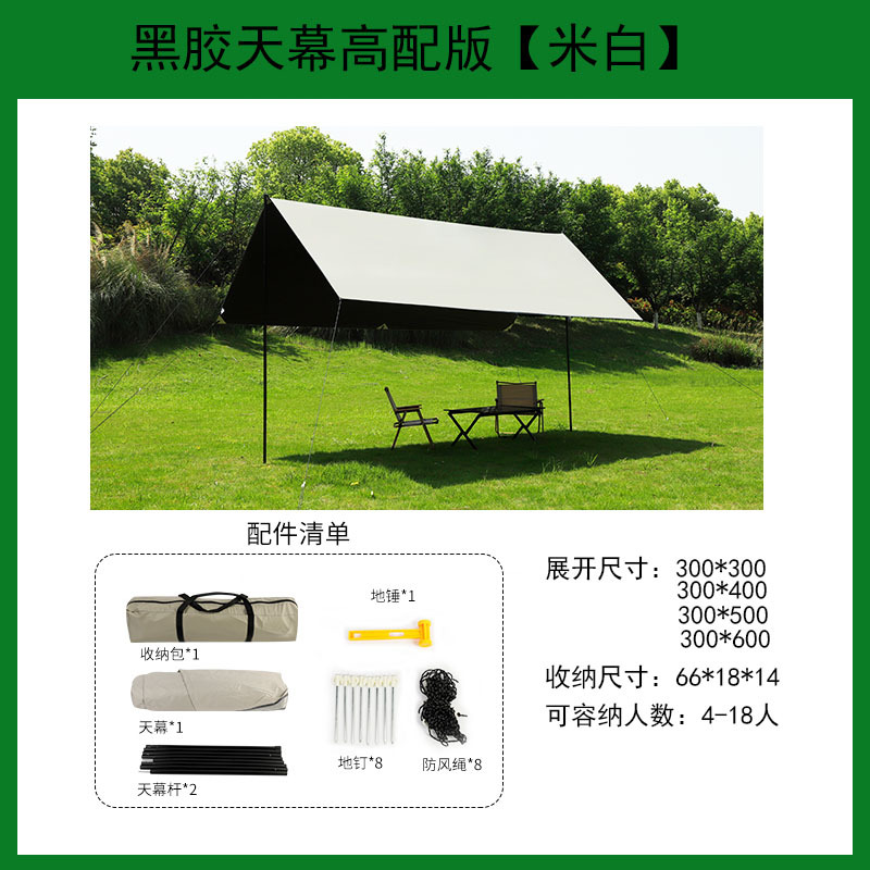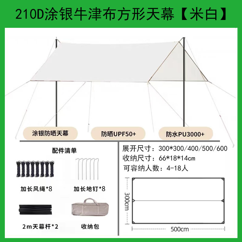 以下详情天幕图均为简约款天幕,面料是190T,尺寸是300*300,尺寸300*300天幕适用4个人,300*400天幕适用6个人,300*500天幕适用8-10个人,可以搭配折叠桌椅帐篷一起使用。想要面料更厚一些防晒效果更好的朋友,可以购买210D的天幕或者黑胶,当然黑胶天幕更防晒,更适合夏天使用。