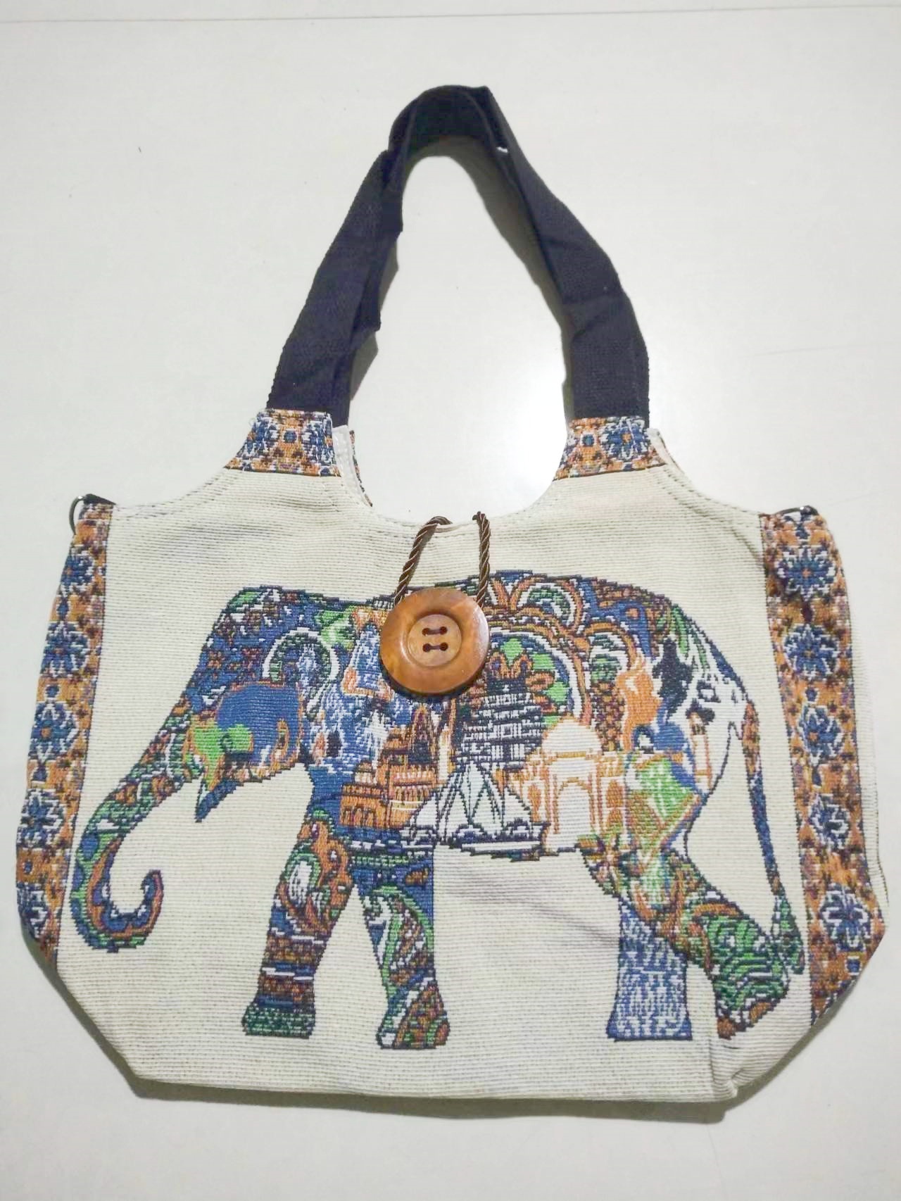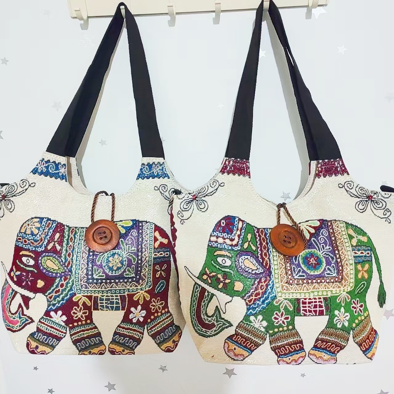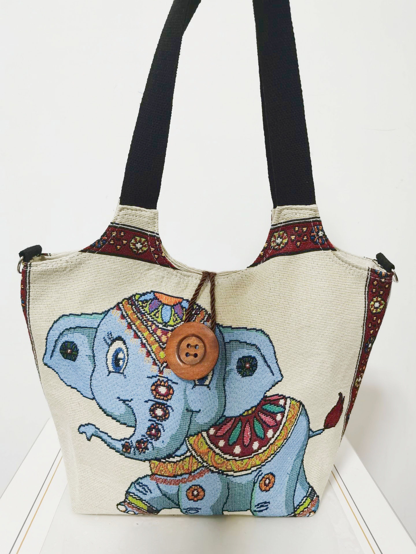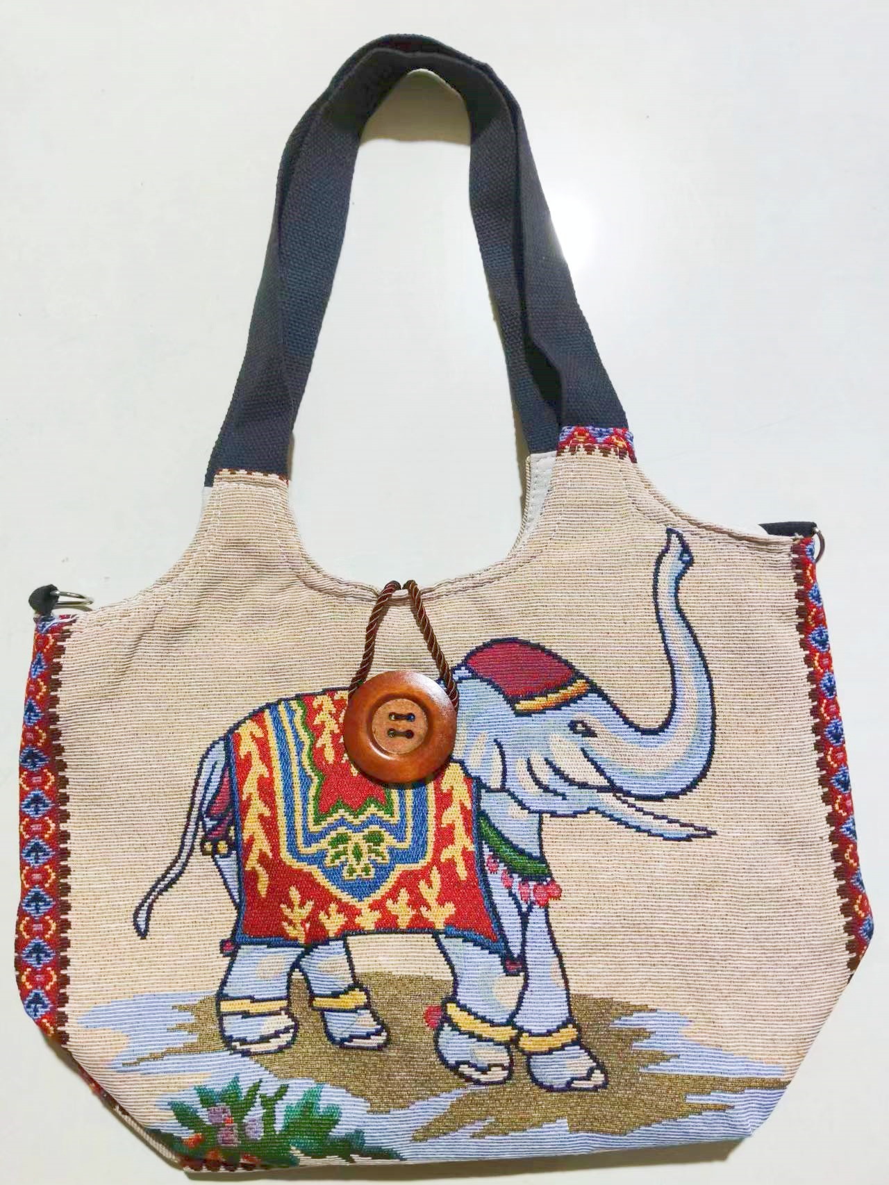 에스닉 스타일 대용량 캔버스 가방 자수 코끼리 운남 여행 토트 숄더백 크로스 바디 백 다이 버튼 백