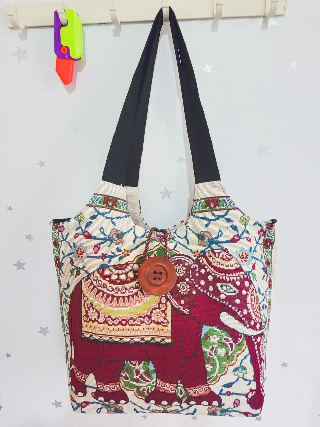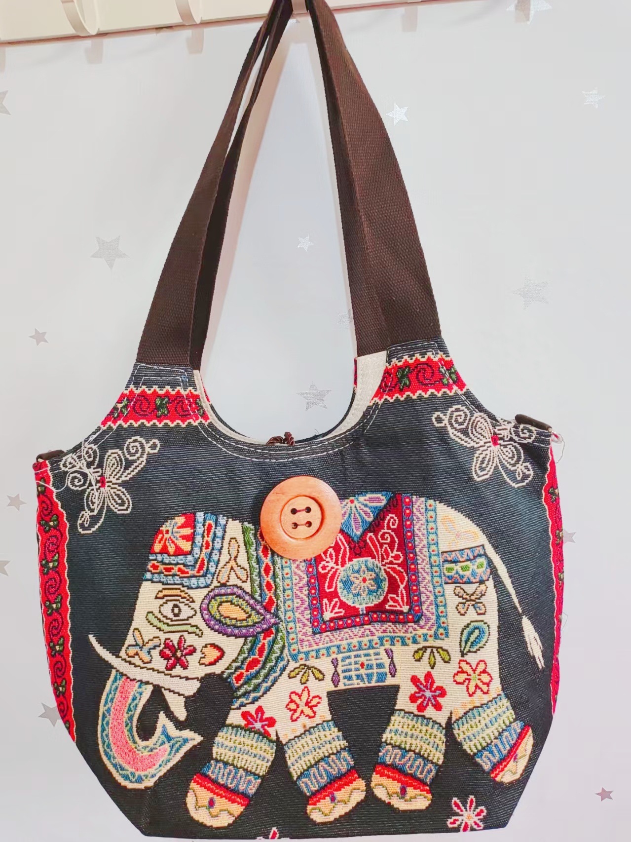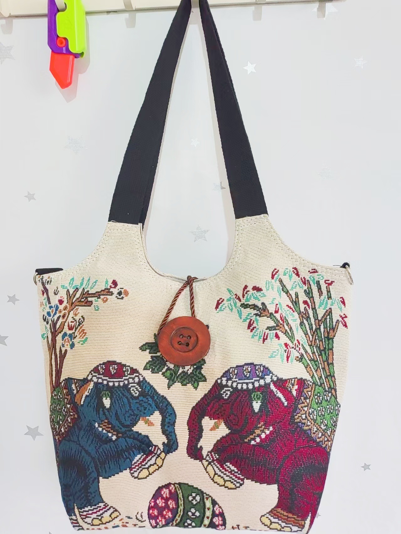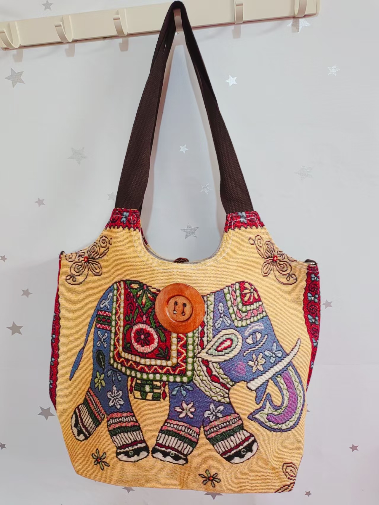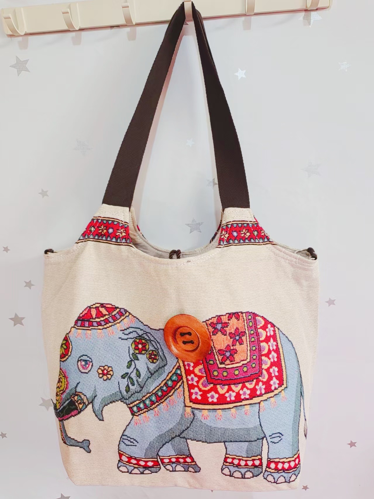 에스닉 스타일 대용량 캔버스 가방 자수 코끼리 운남 여행 토트 숄더백 크로스 바디 백 다이 버튼 백