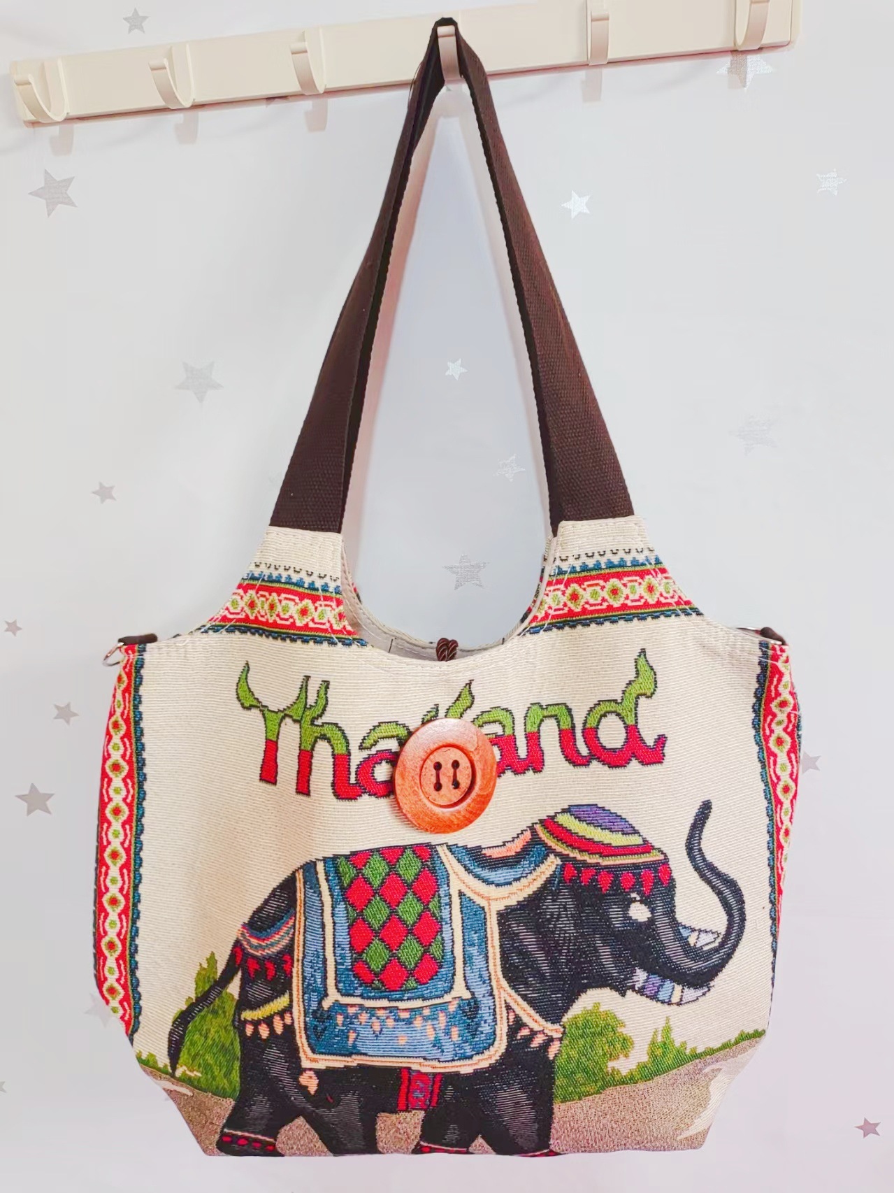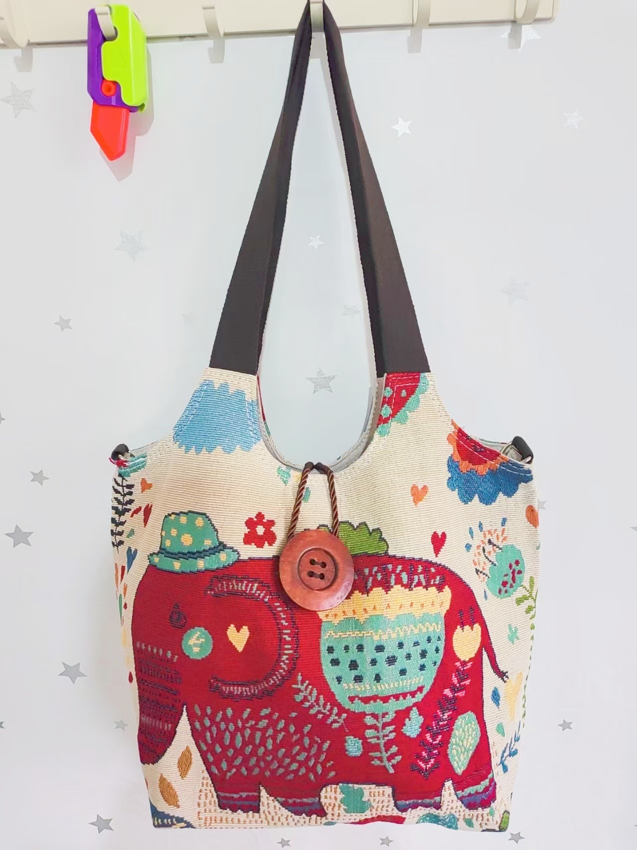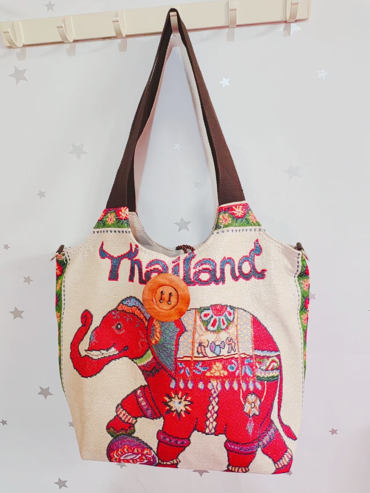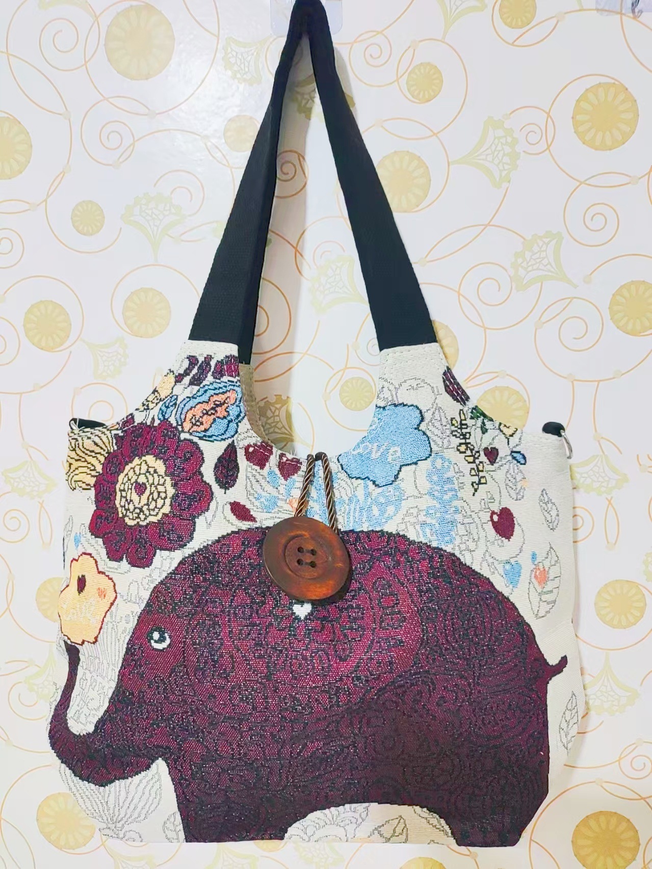 에스닉 스타일 대용량 캔버스 가방 자수 코끼리 운남 여행 토트 숄더백 크로스 바디 백 다이 버튼 백