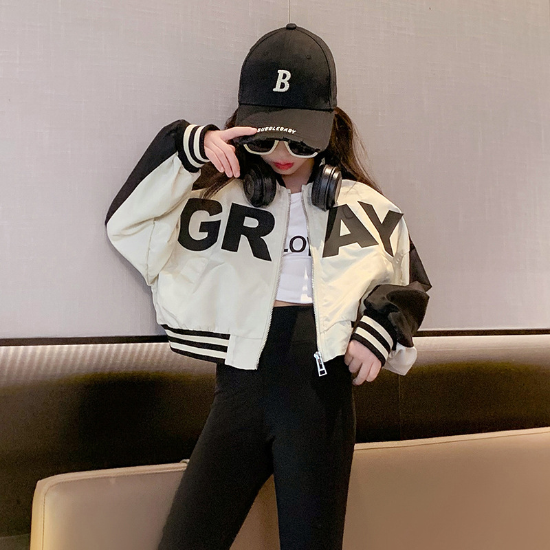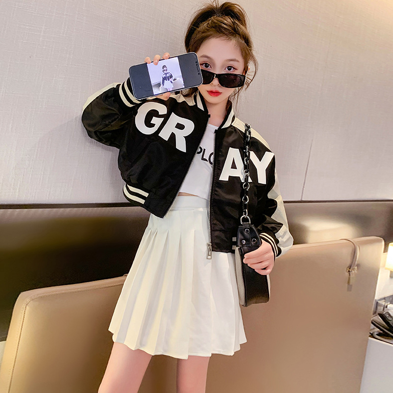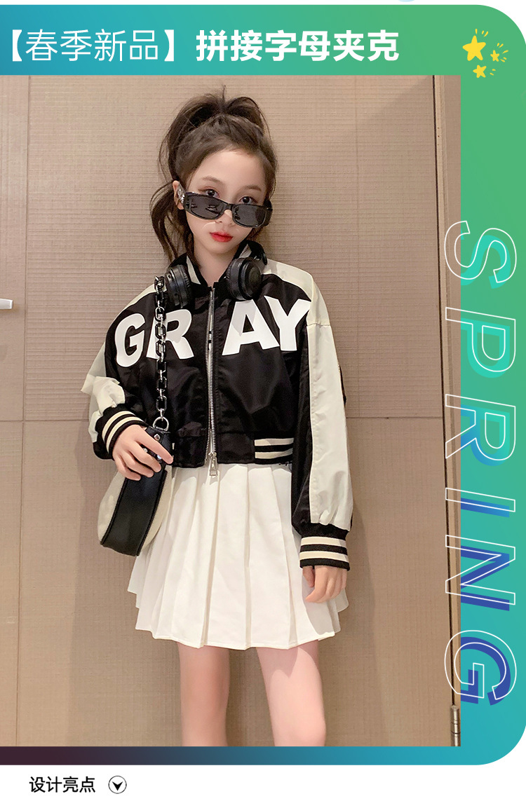 여아 가을 코트 2023 새로운 유행 서양 스타일 야구 세트 재킷 유행 미드 빅 어린이 봄과 가을 오토바이 세트