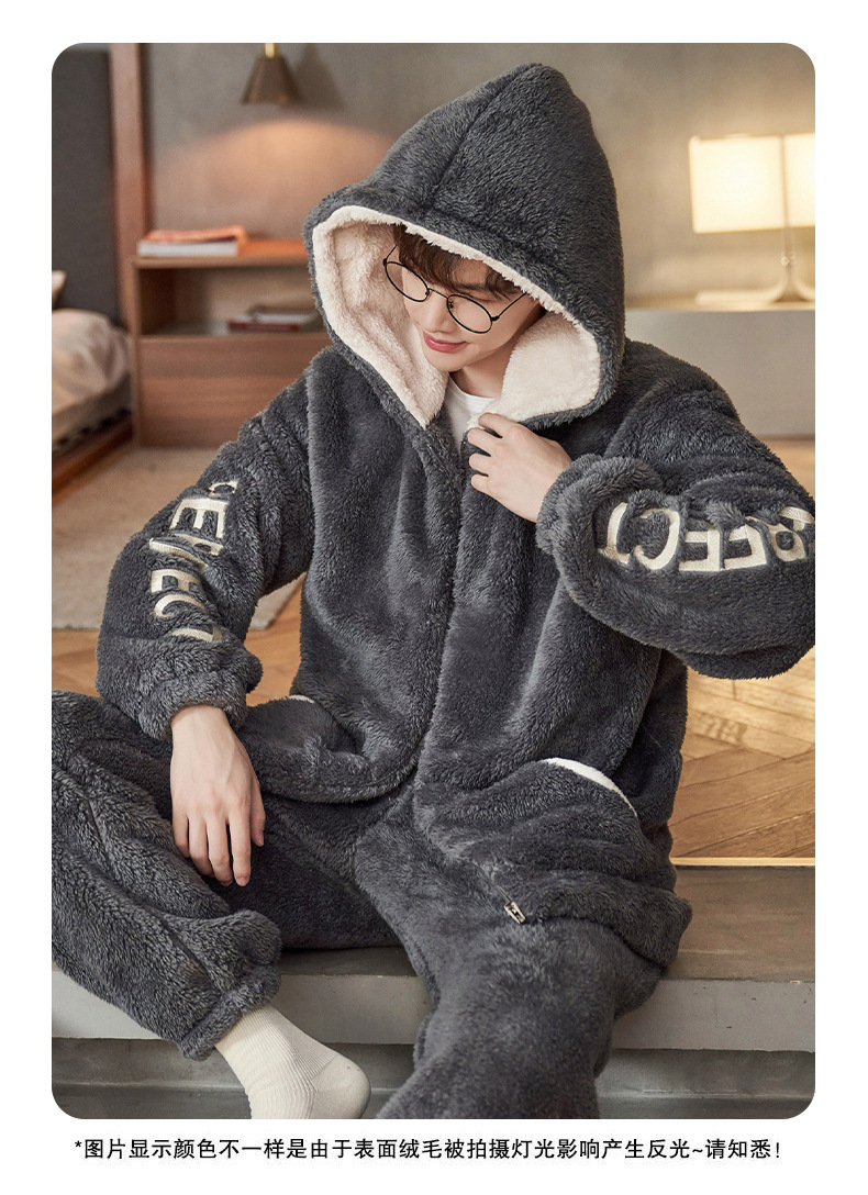 산호 양털 잠옷 남자의 가을과 겨울 기모 두꺼운 플란넬 따뜻한 후드 지퍼 겉옷 가정 의류