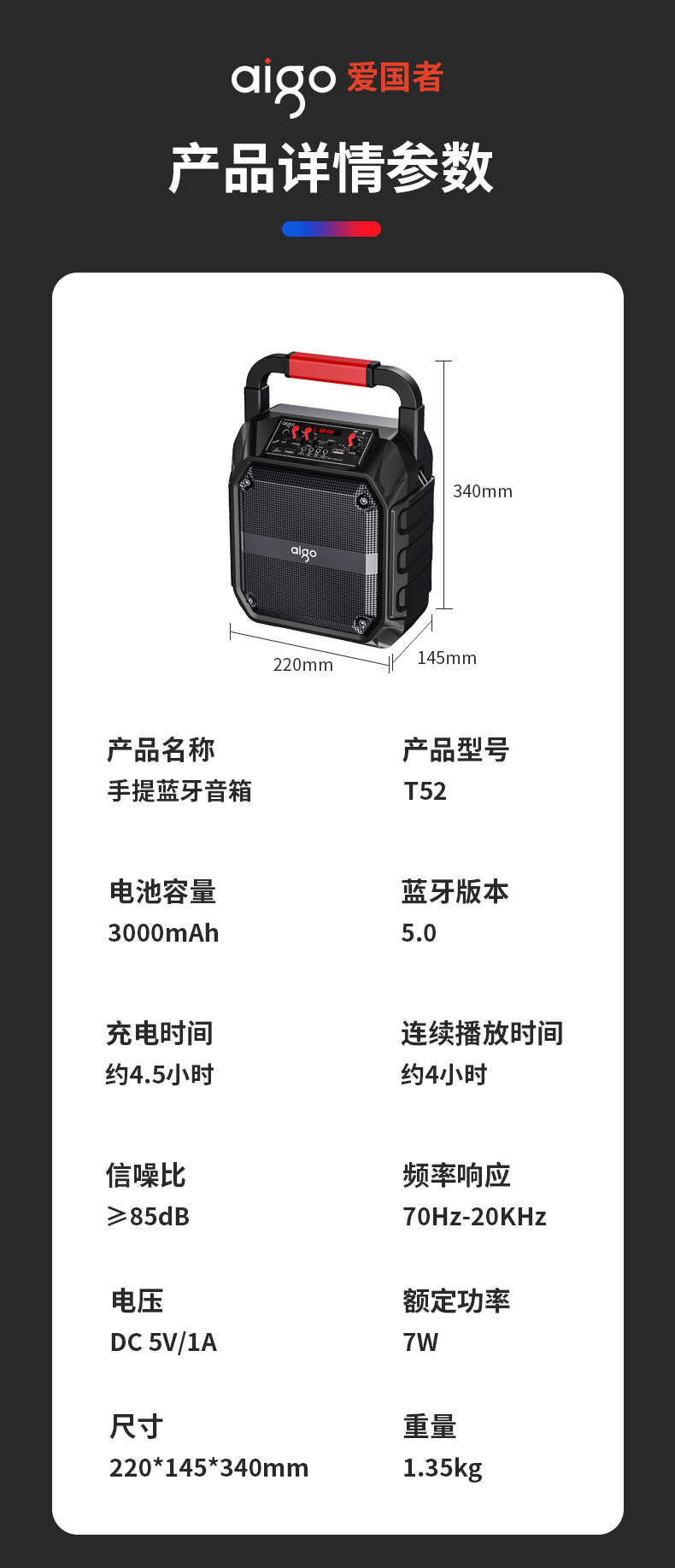 애국자 T52 블루투스 스피커 대용량 휴대용 야외 K 노래 스퀘어 댄스 오디오 스피커 무선스토어 가기