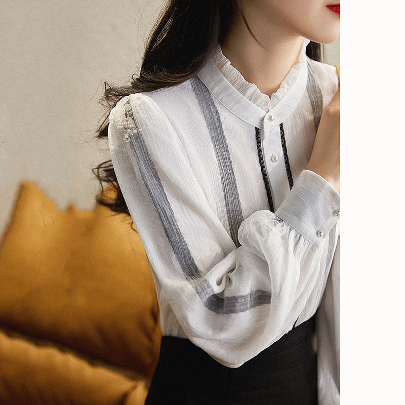 프렌치 스타일 레이스 트림 작은 스탠드 칼라 이중 디자인 단추 장식 긴팔 셔츠 여성용 2025 초가을 신상 상의