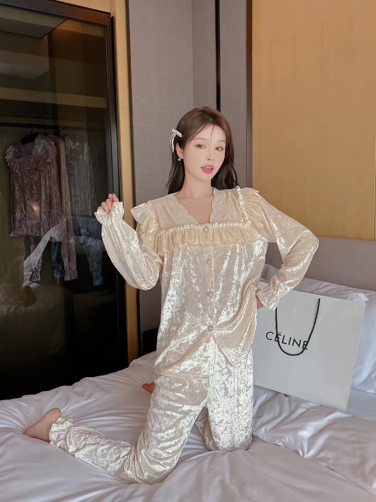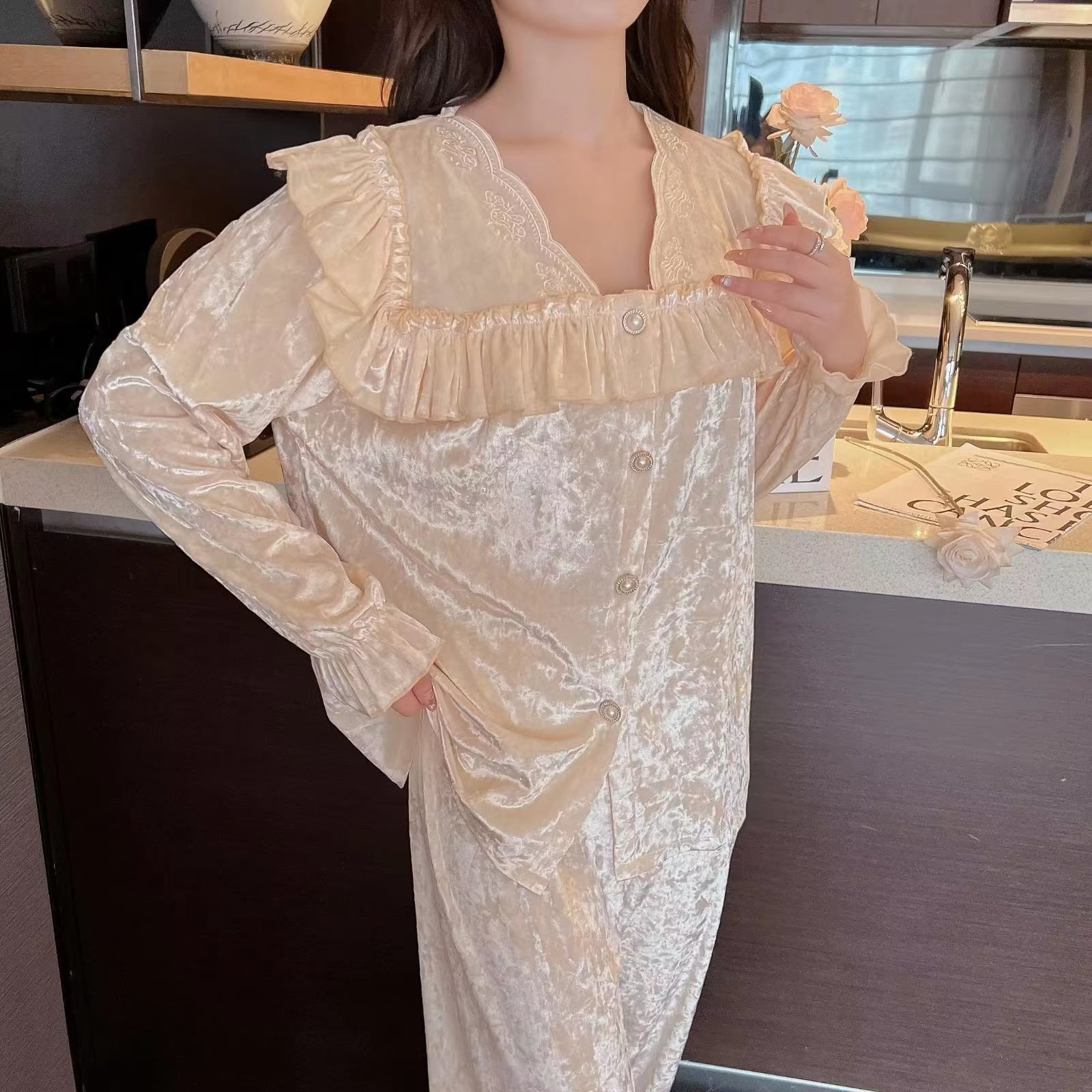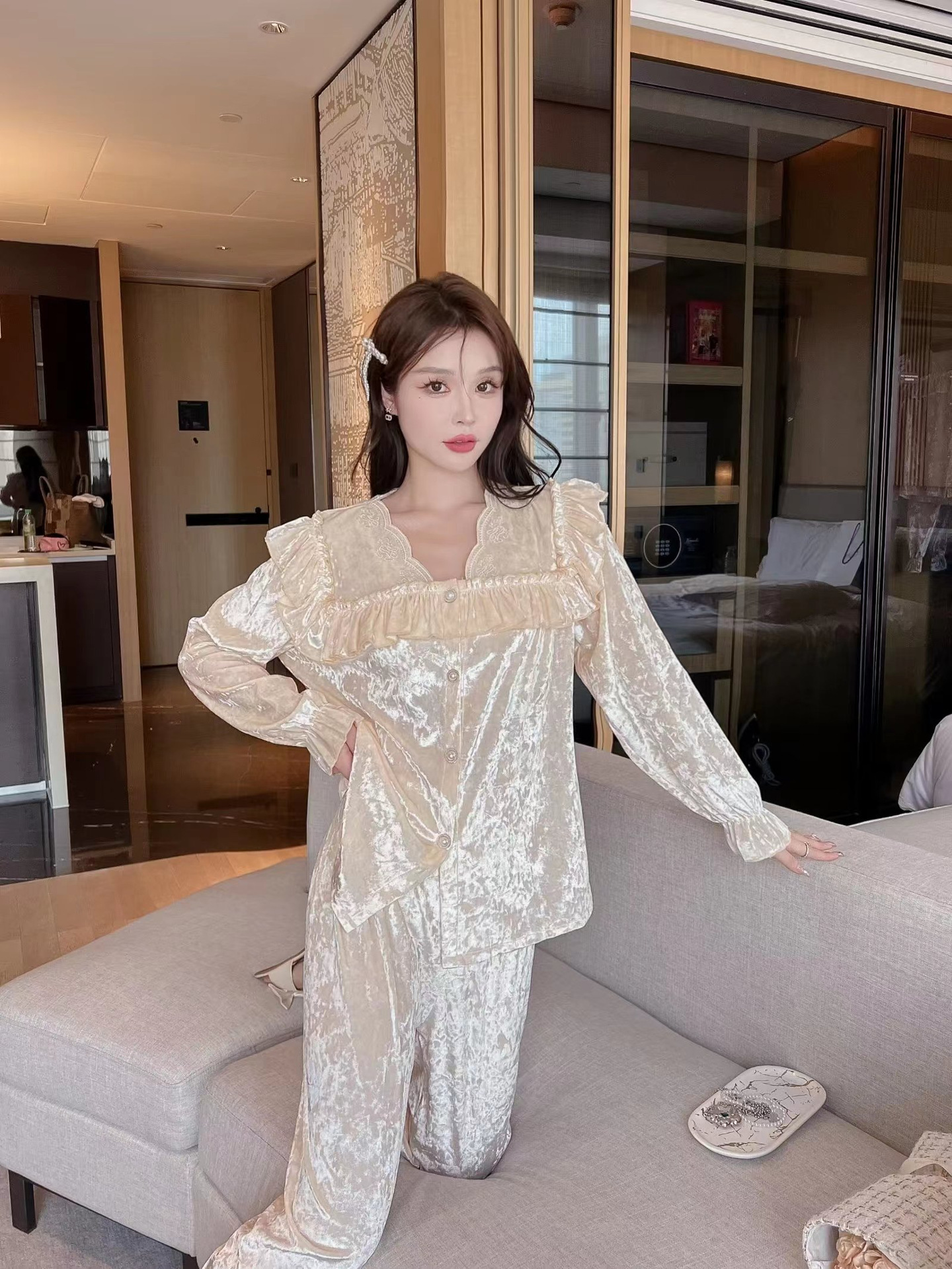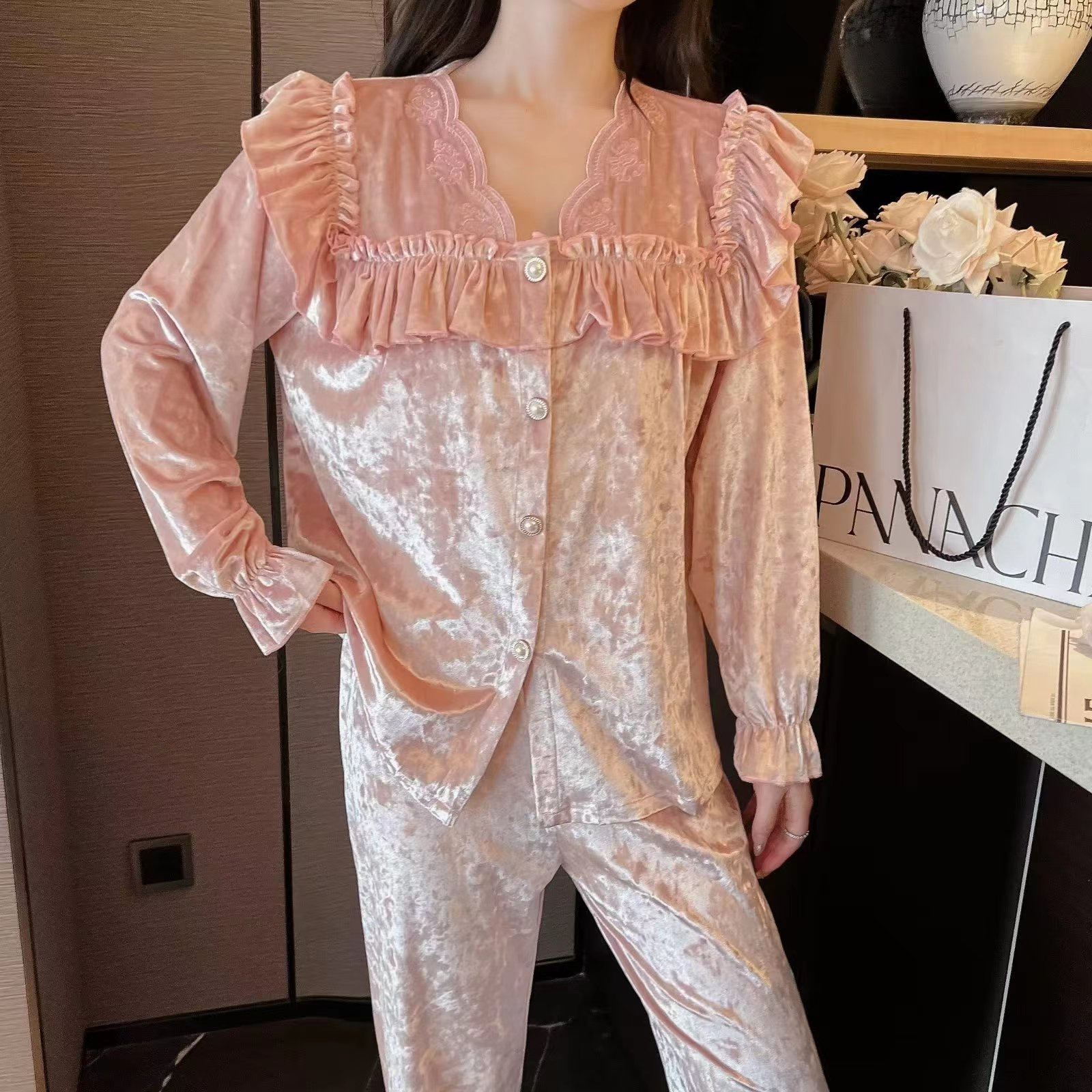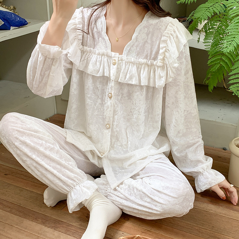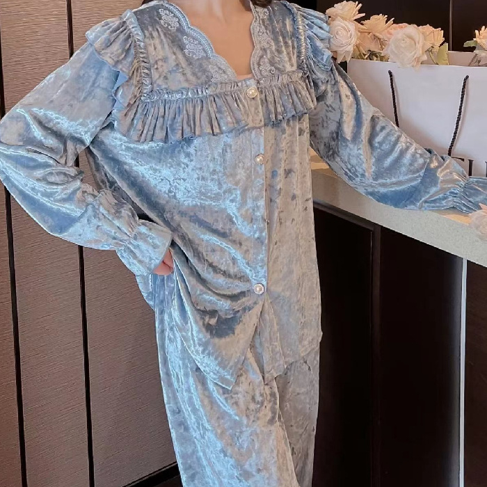 봄과 가을 여성 잠옷 겨울 인터넷 연예인 라이브 핫 골드 벨벳 라이트 럭셔리 레이스 골드 다이아몬드 벨벳 가정복스토어 가기