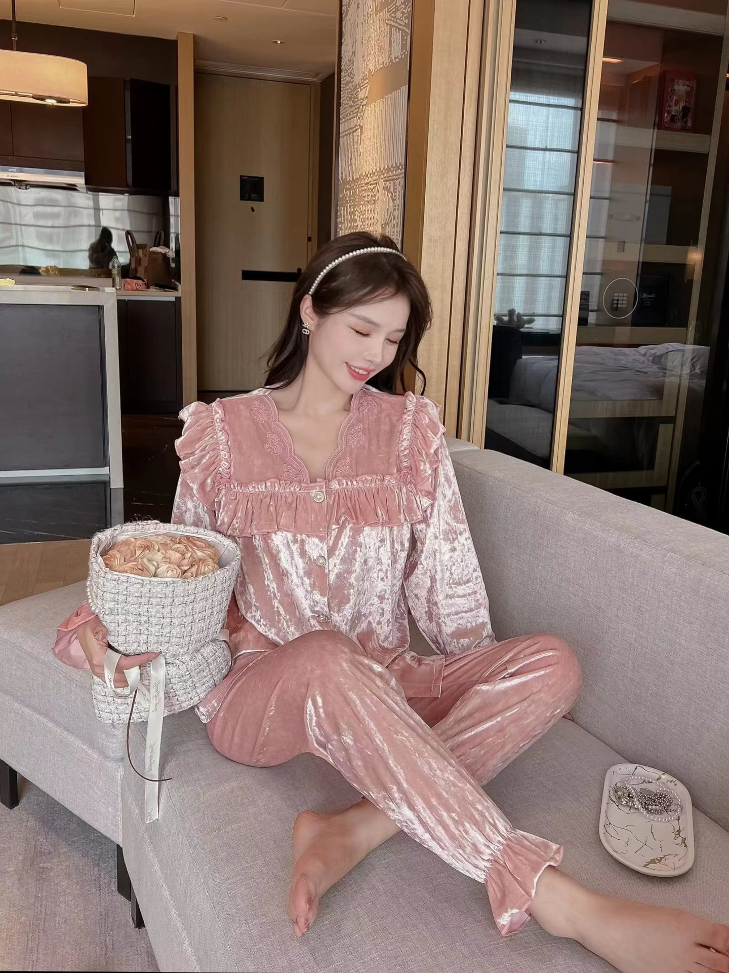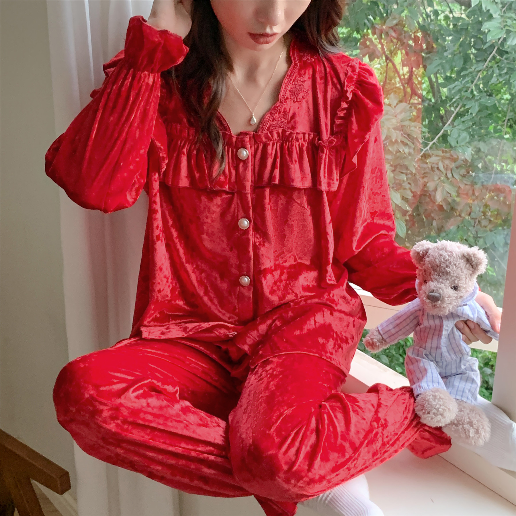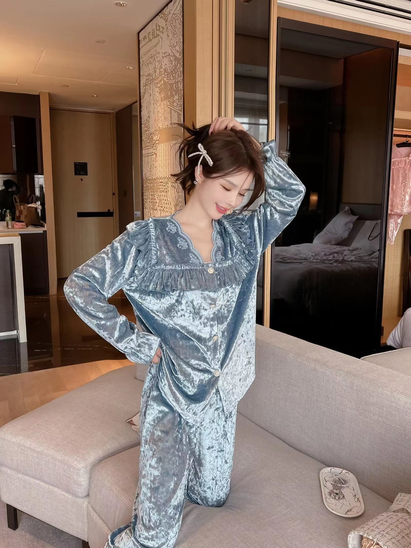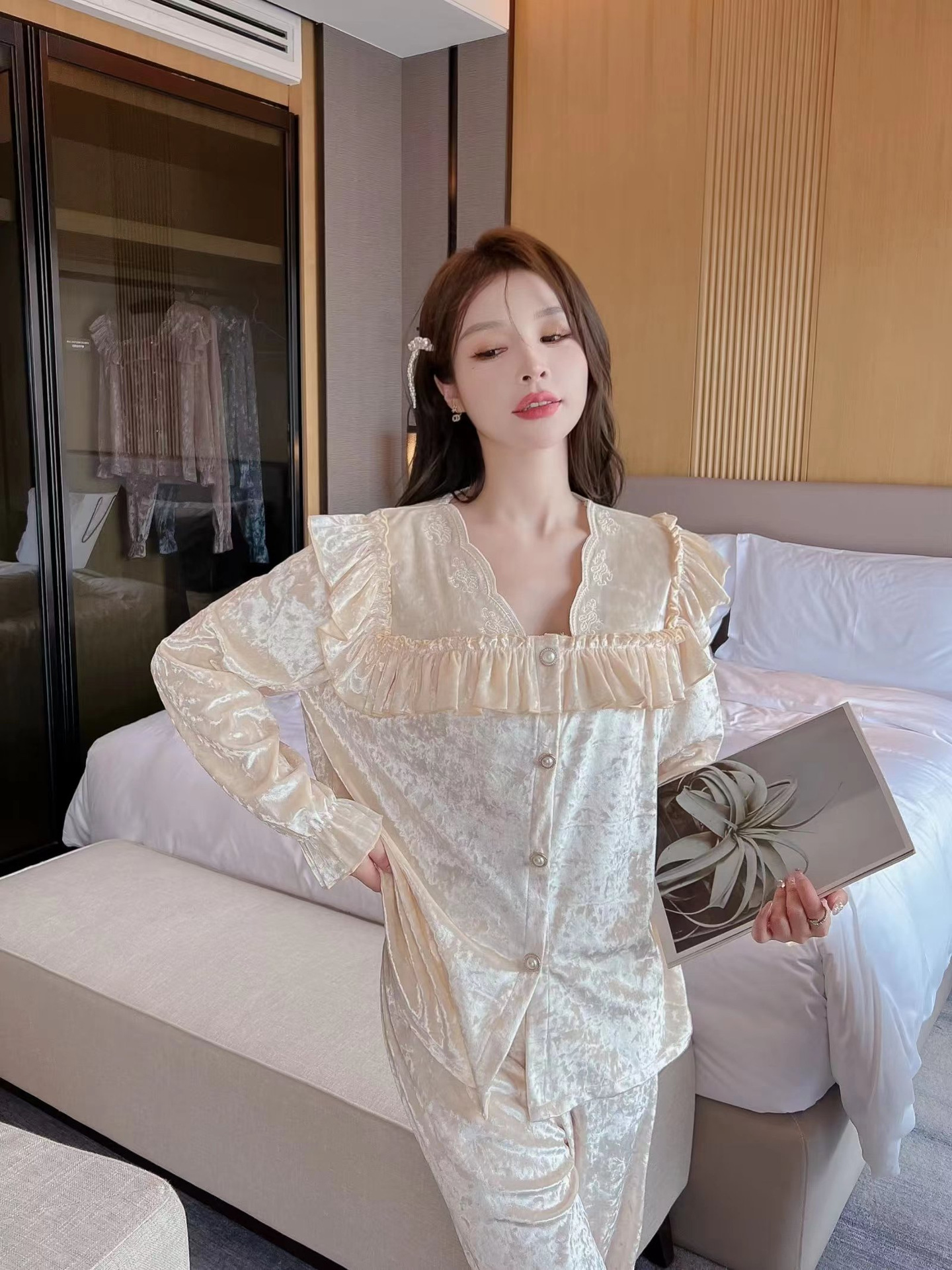 봄과 가을 여성 잠옷 겨울 인터넷 연예인 라이브 핫 골드 벨벳 라이트 럭셔리 레이스 골드 다이아몬드 벨벳 가정복스토어 가기