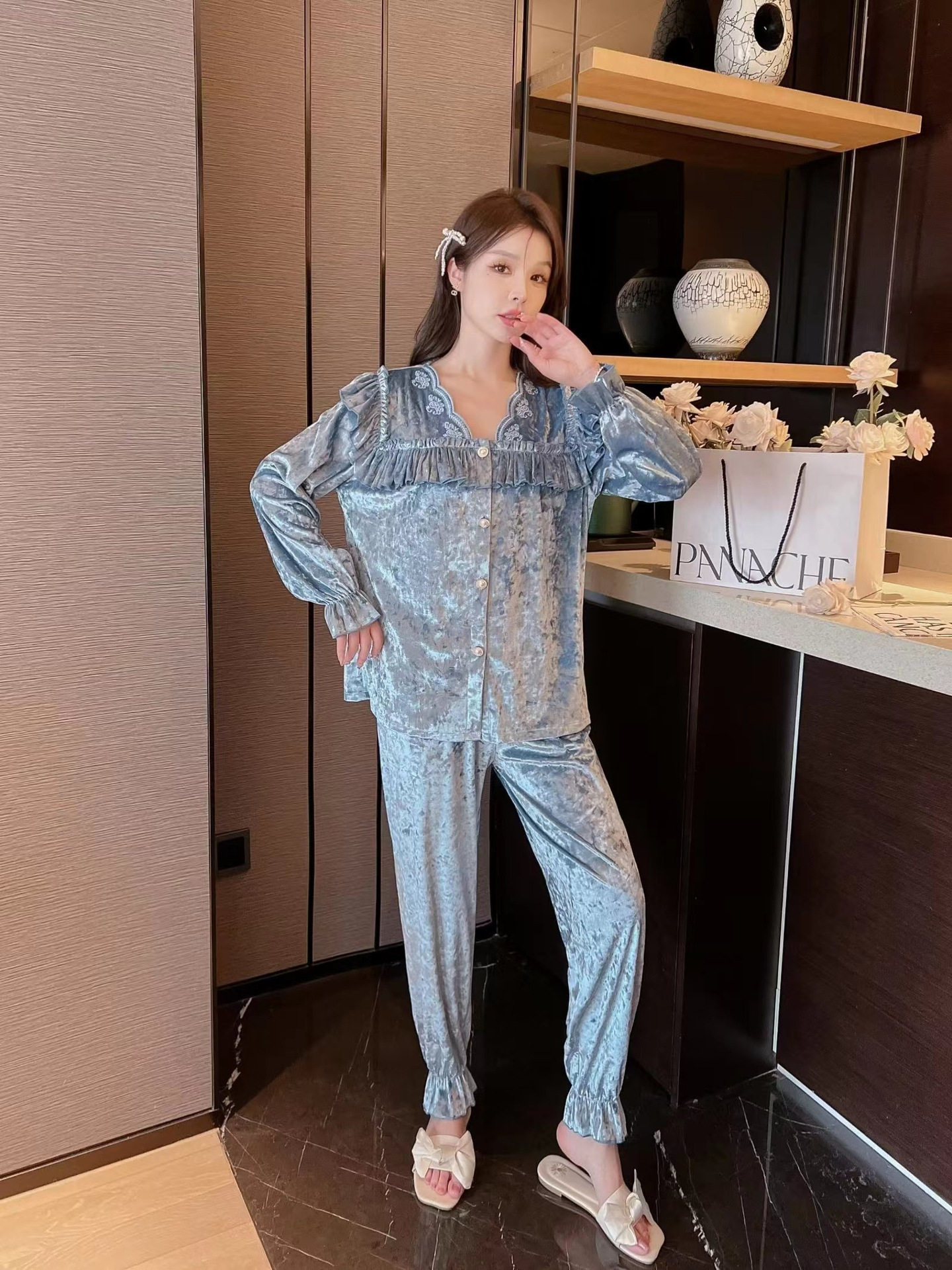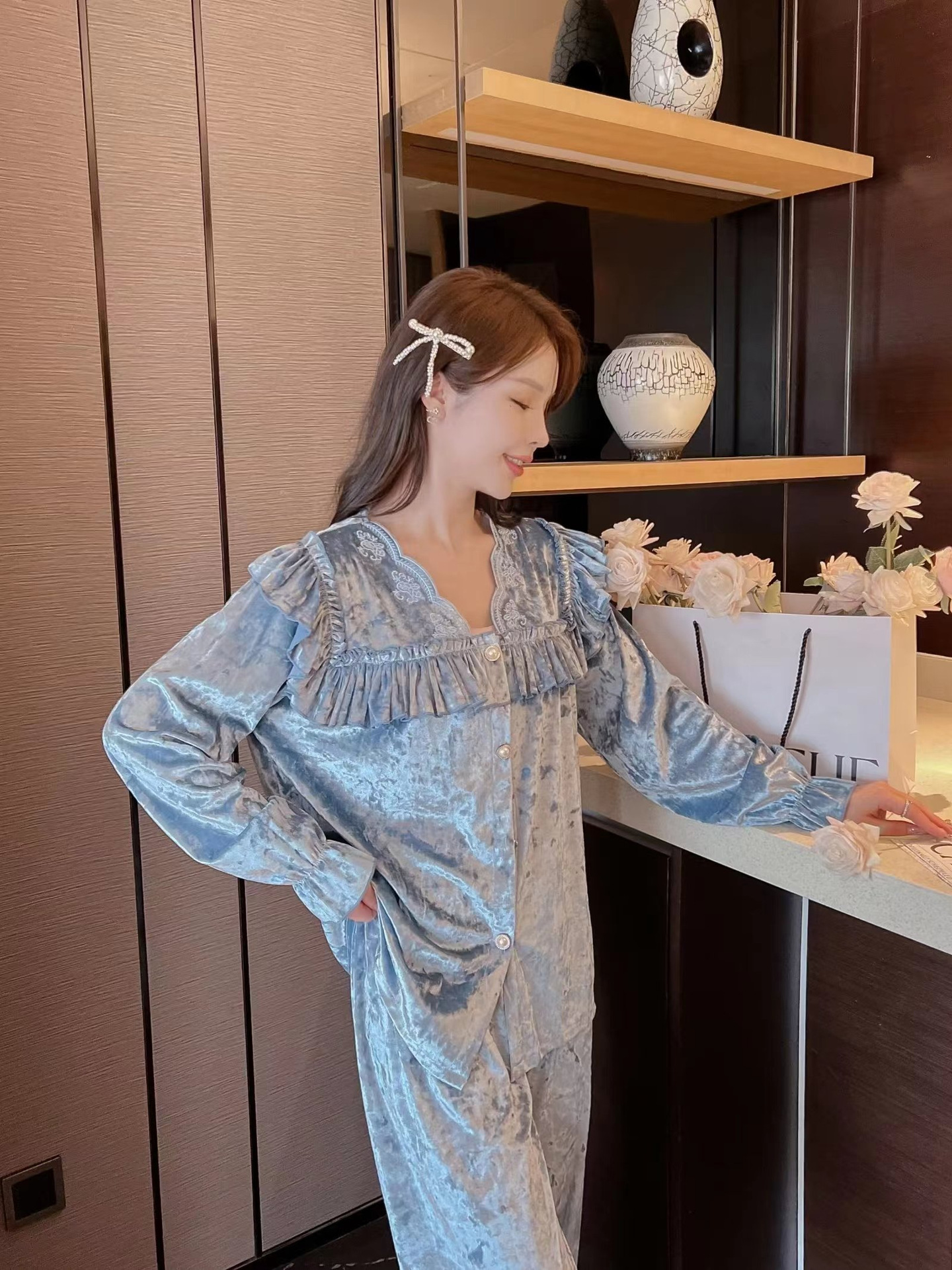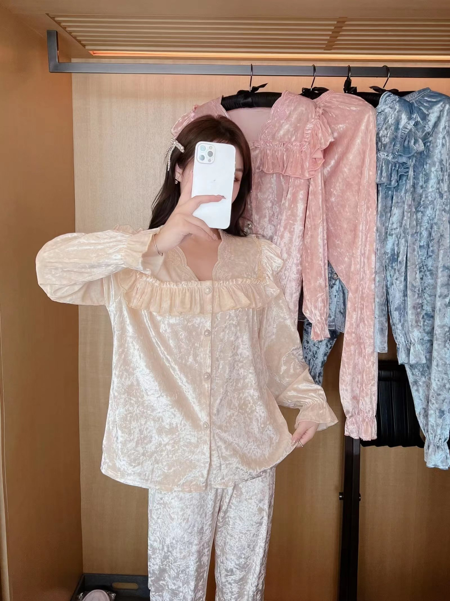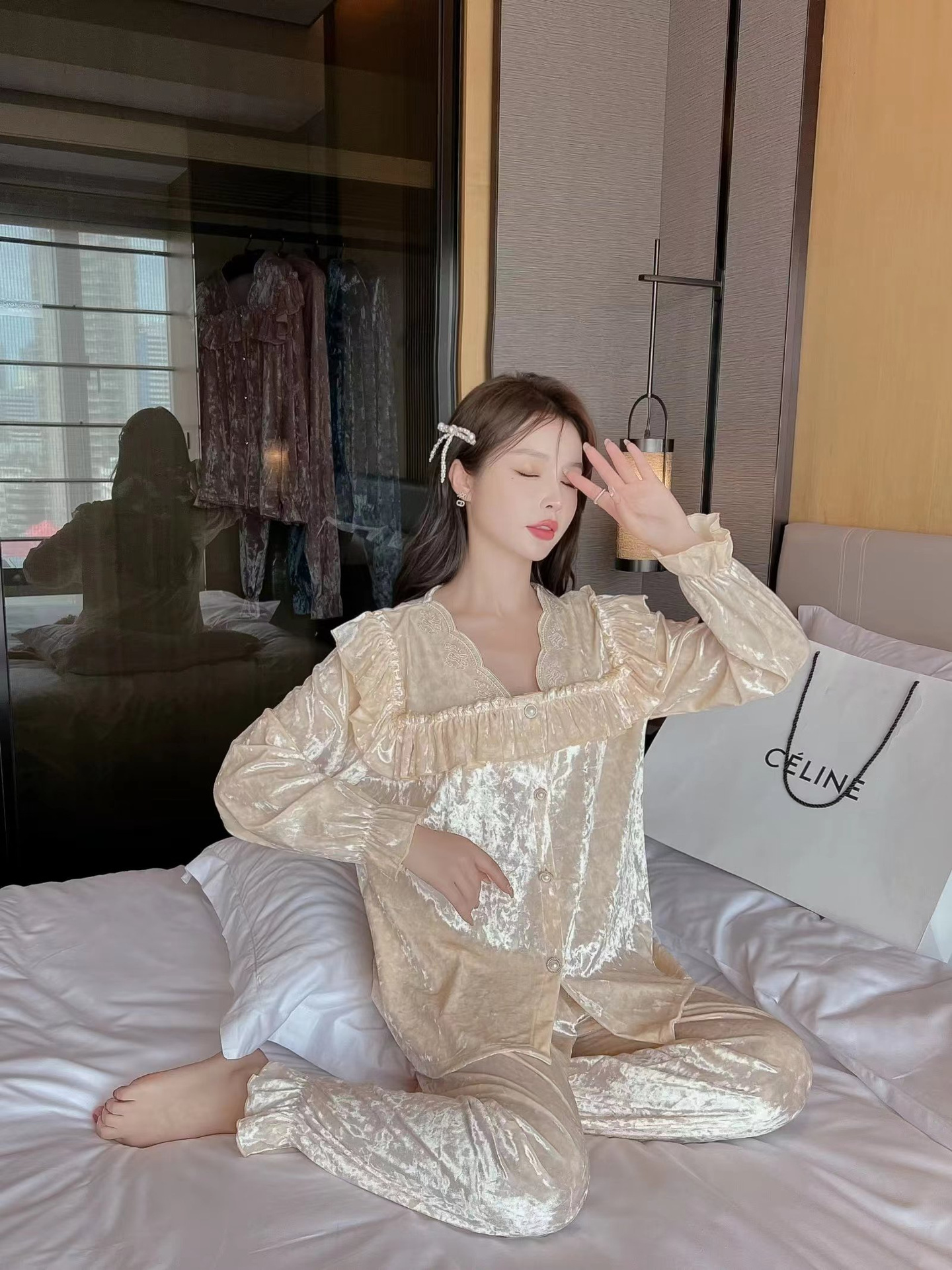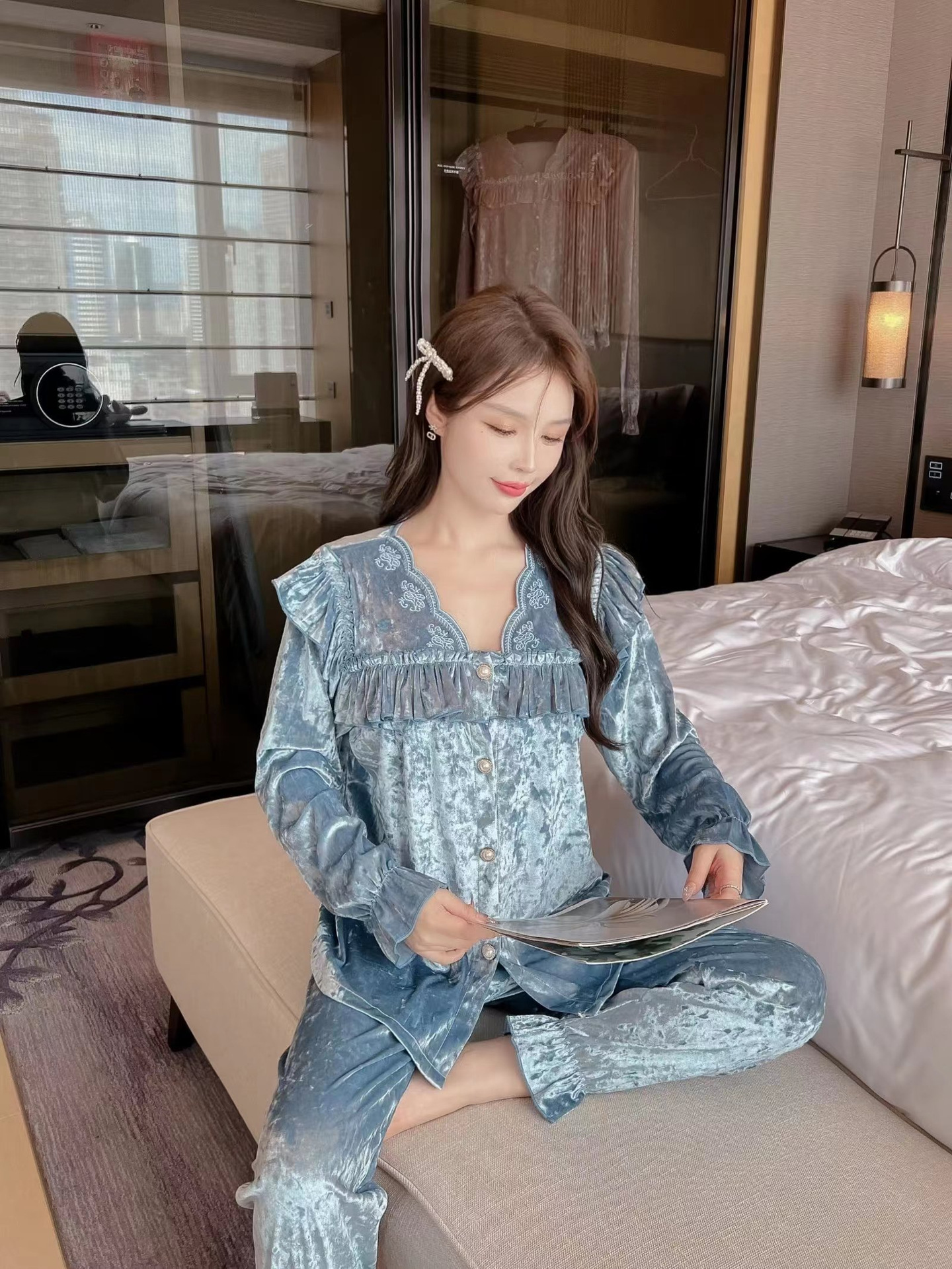 봄과 가을 여성 잠옷 겨울 인터넷 연예인 라이브 핫 골드 벨벳 라이트 럭셔리 레이스 골드 다이아몬드 벨벳 가정복스토어 가기