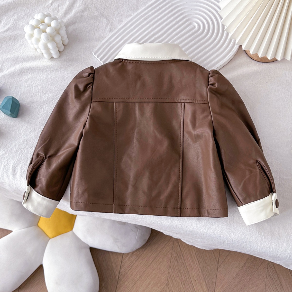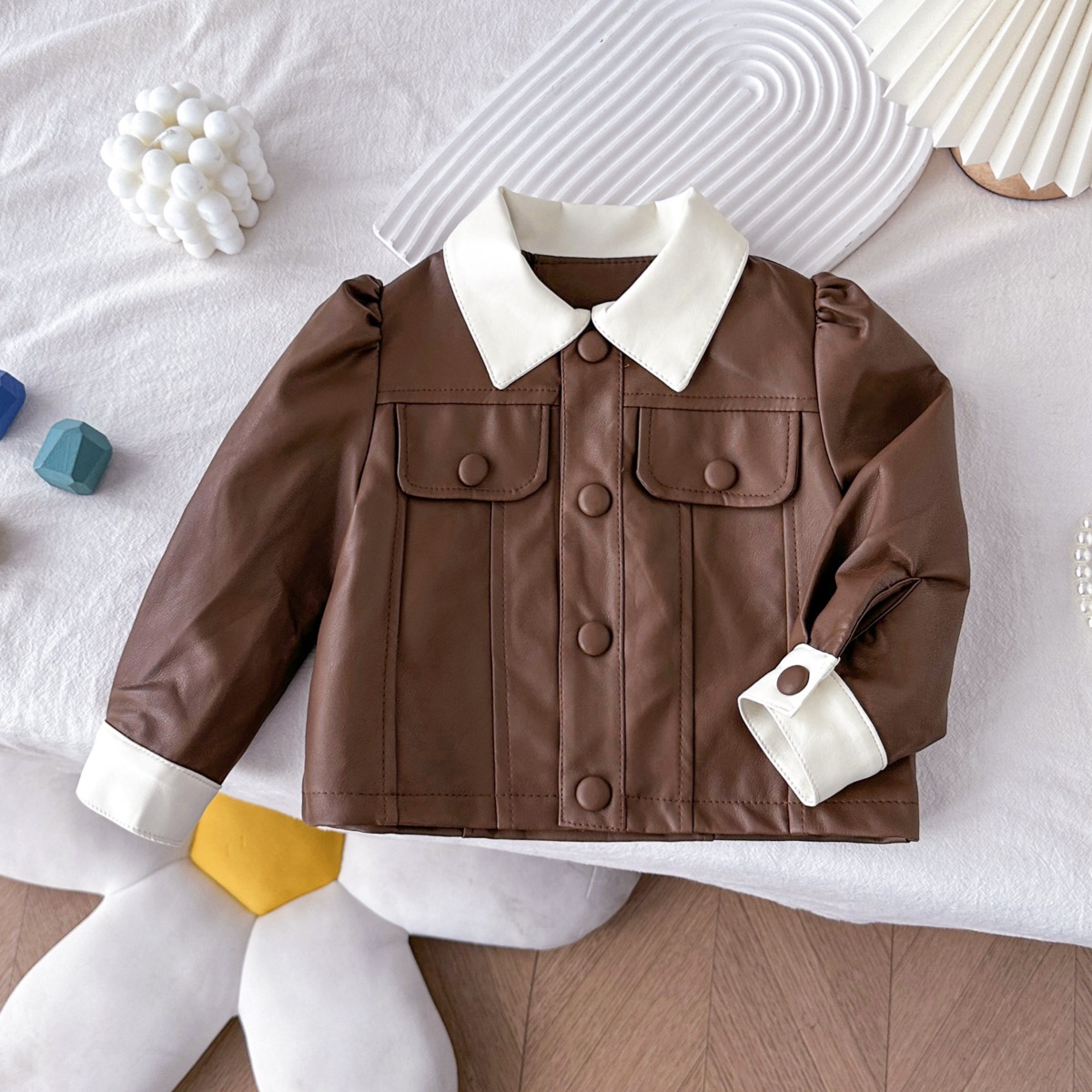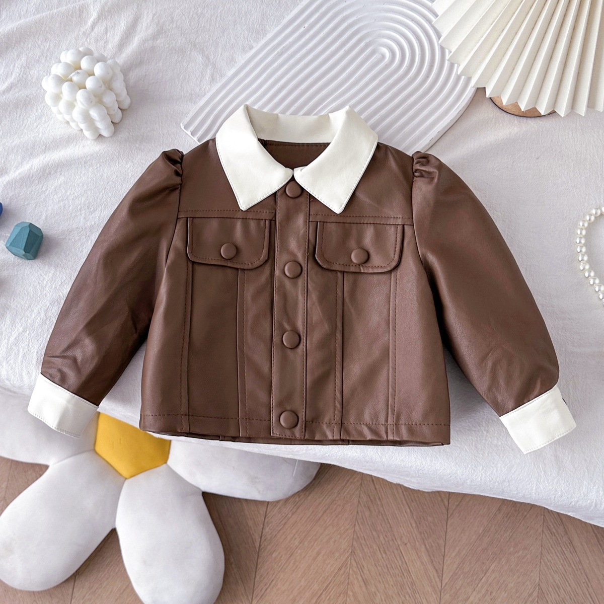 6571 소녀의 가죽 코트 2023 가을 새로운 스타일 어린이 아기 짧은 탑 소녀의 옷깃 재킷