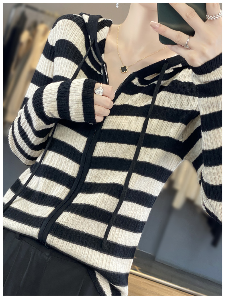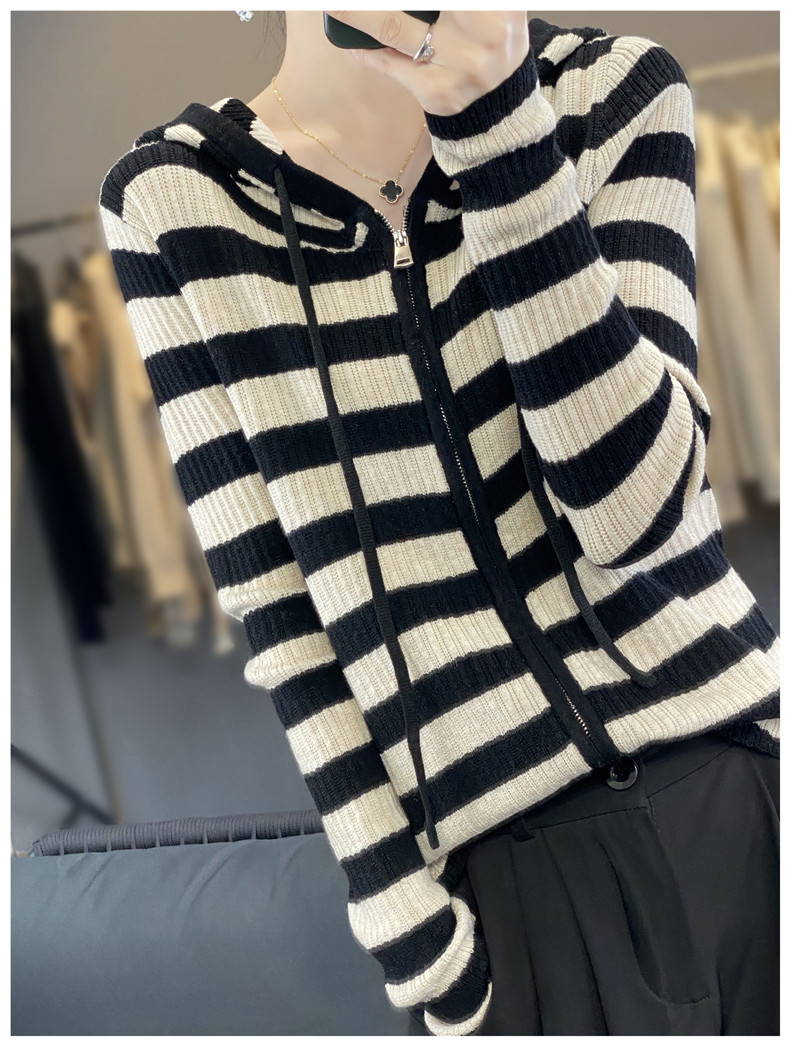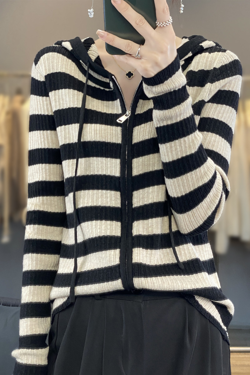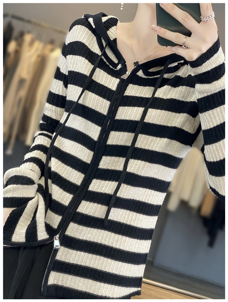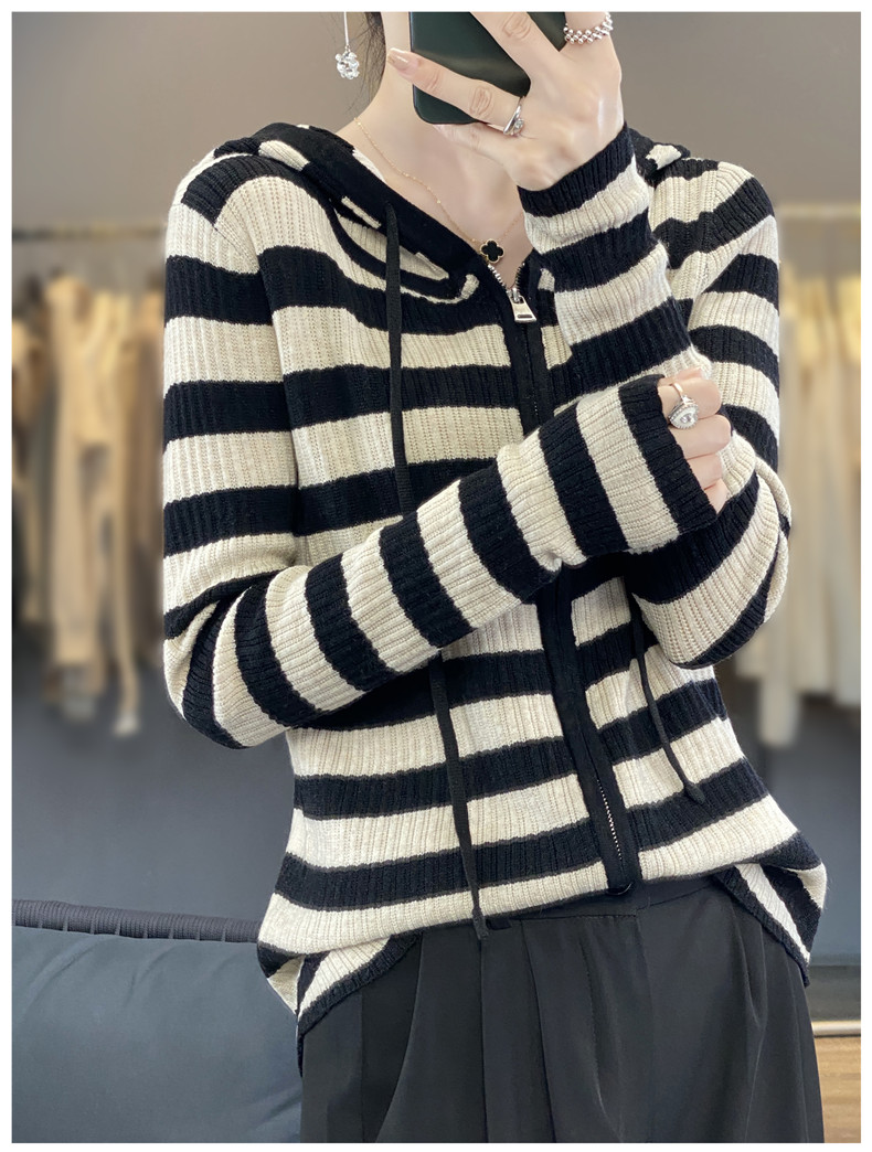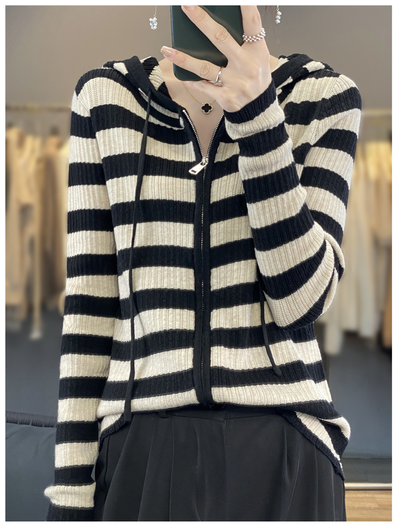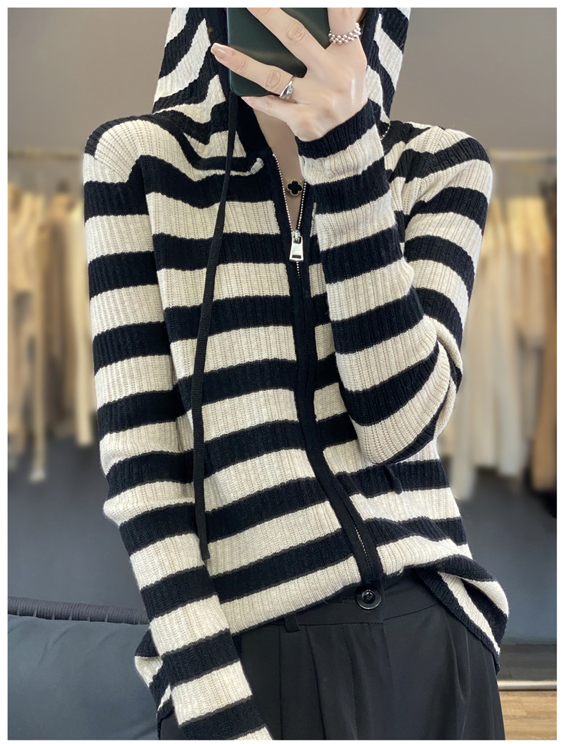 패션 종이 사람들 스트라이프 울 니트웨어 후드 가디건 여성의 봄과 가을 더블 지퍼 후드 느슨한 울 재킷