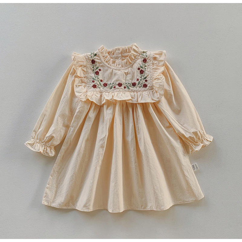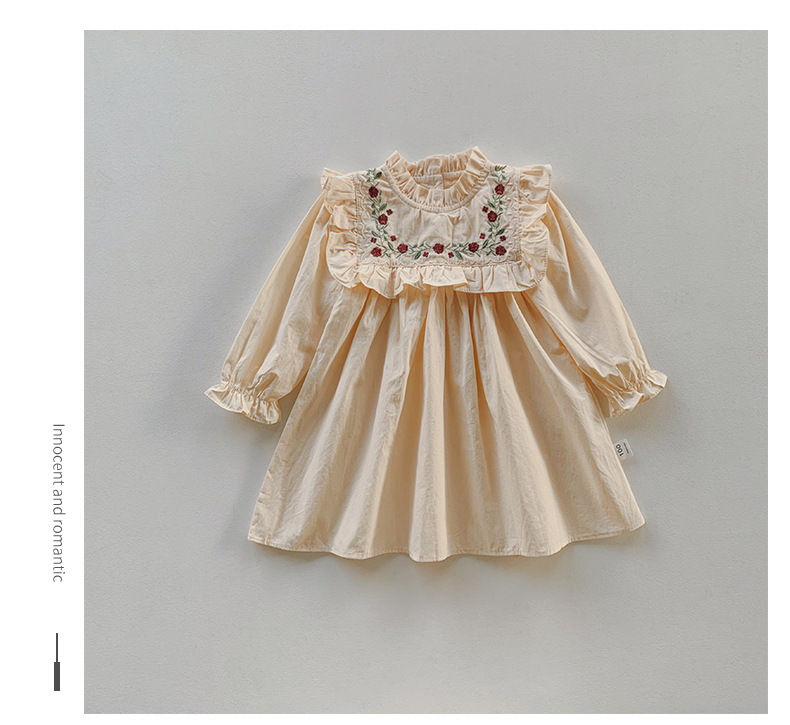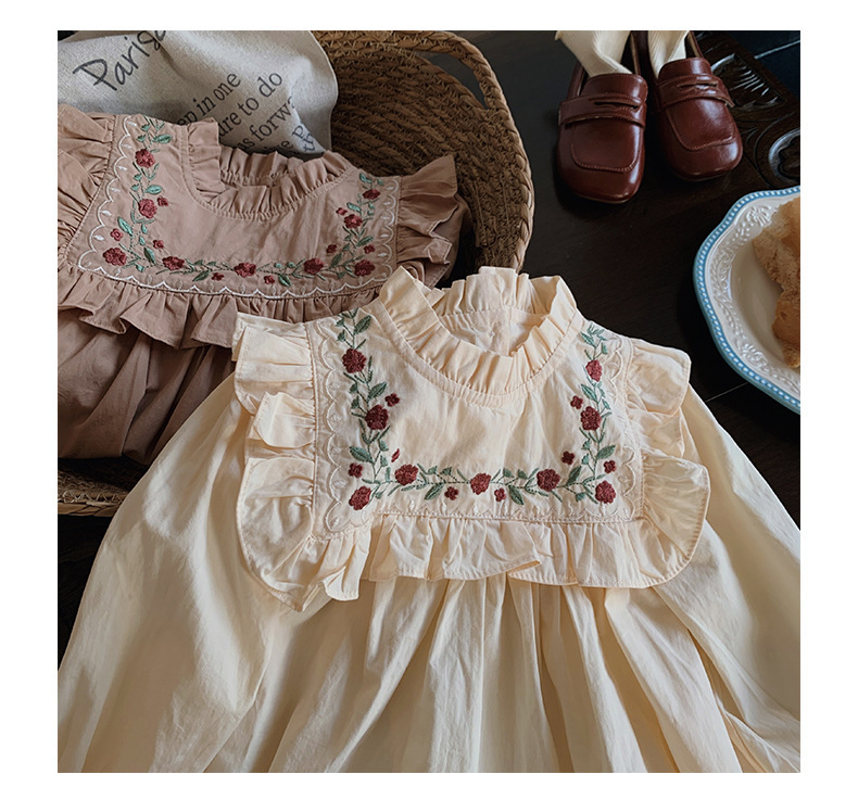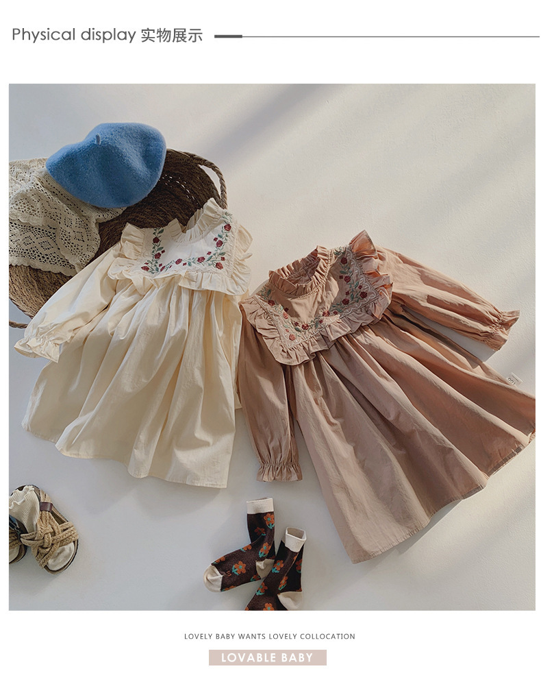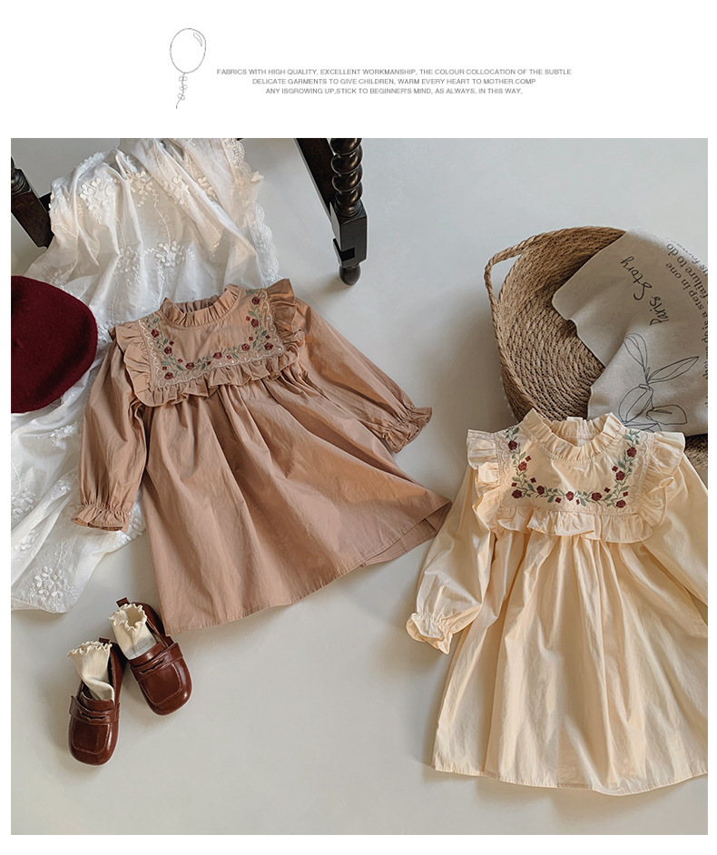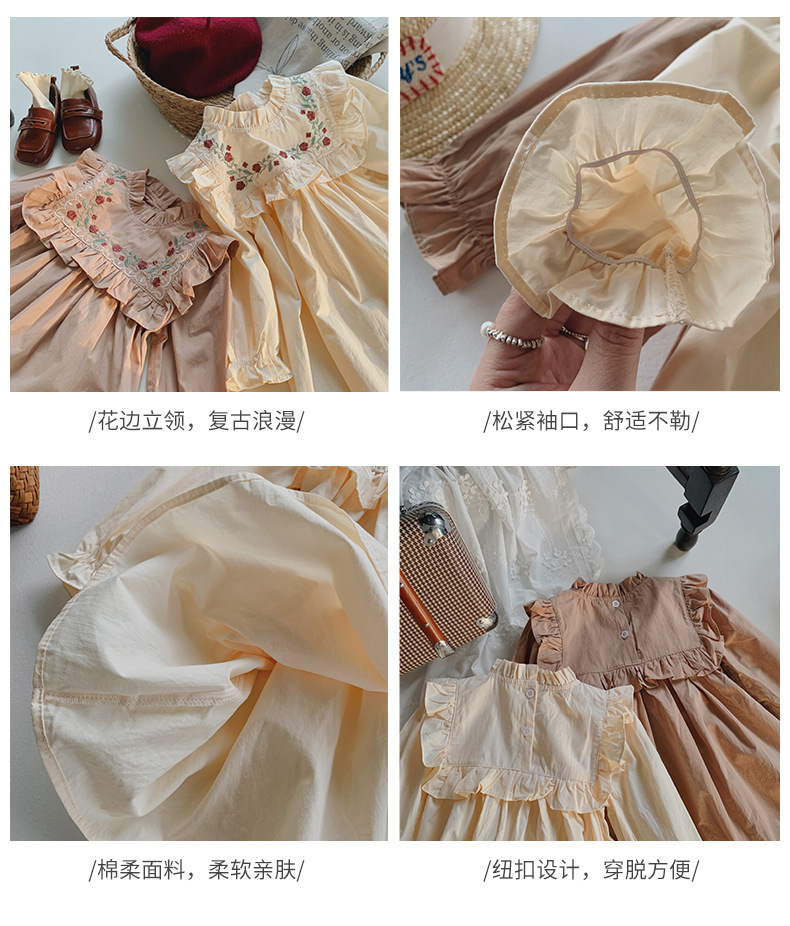 프랑스 자수 꽃 스탠드 칼라 소녀 원피스 2023 가을 주름 긴 소매 소녀 공주 치마 도매스토어 가기