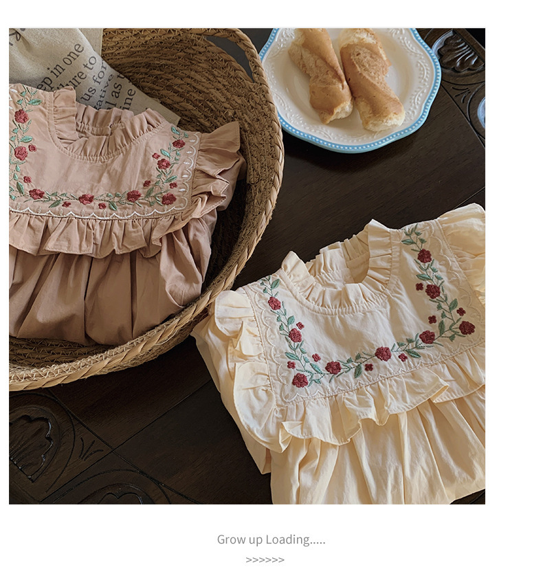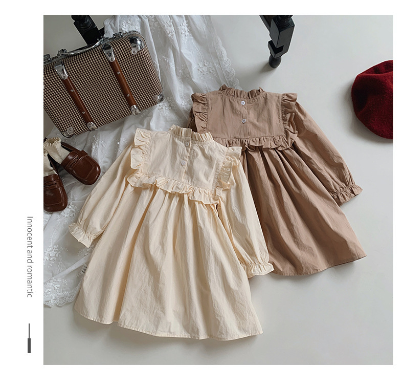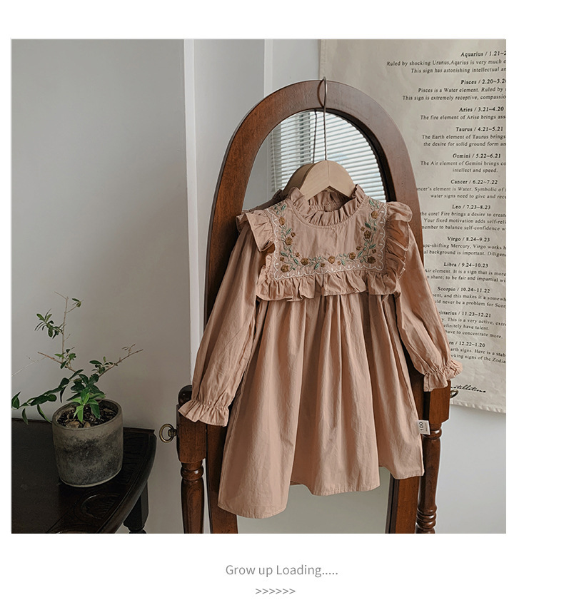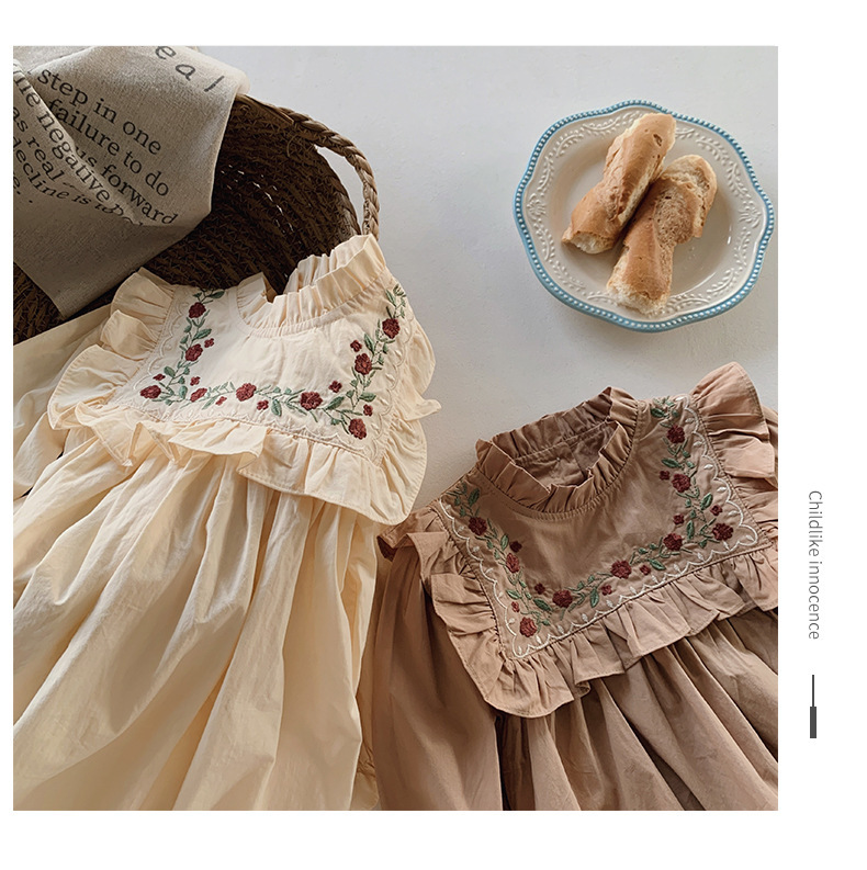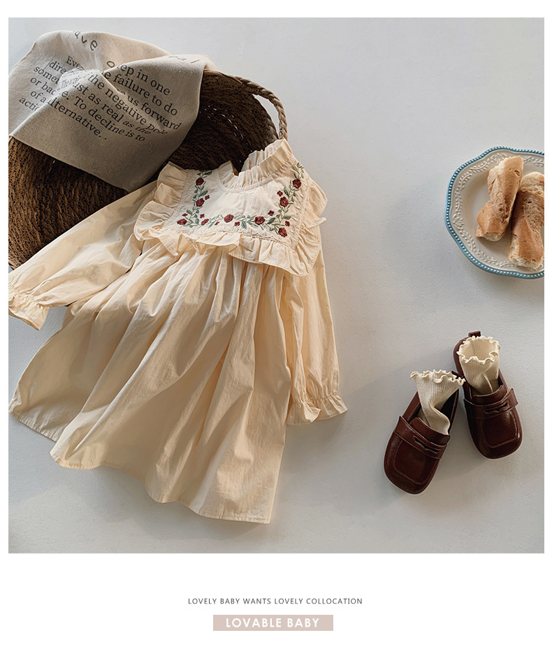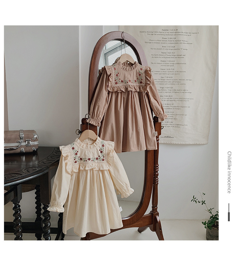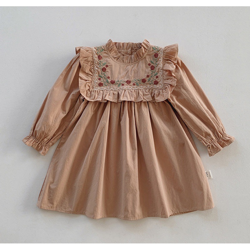 프랑스 자수 꽃 스탠드 칼라 소녀 원피스 2023 가을 주름 긴 소매 소녀 공주 치마 도매스토어 가기