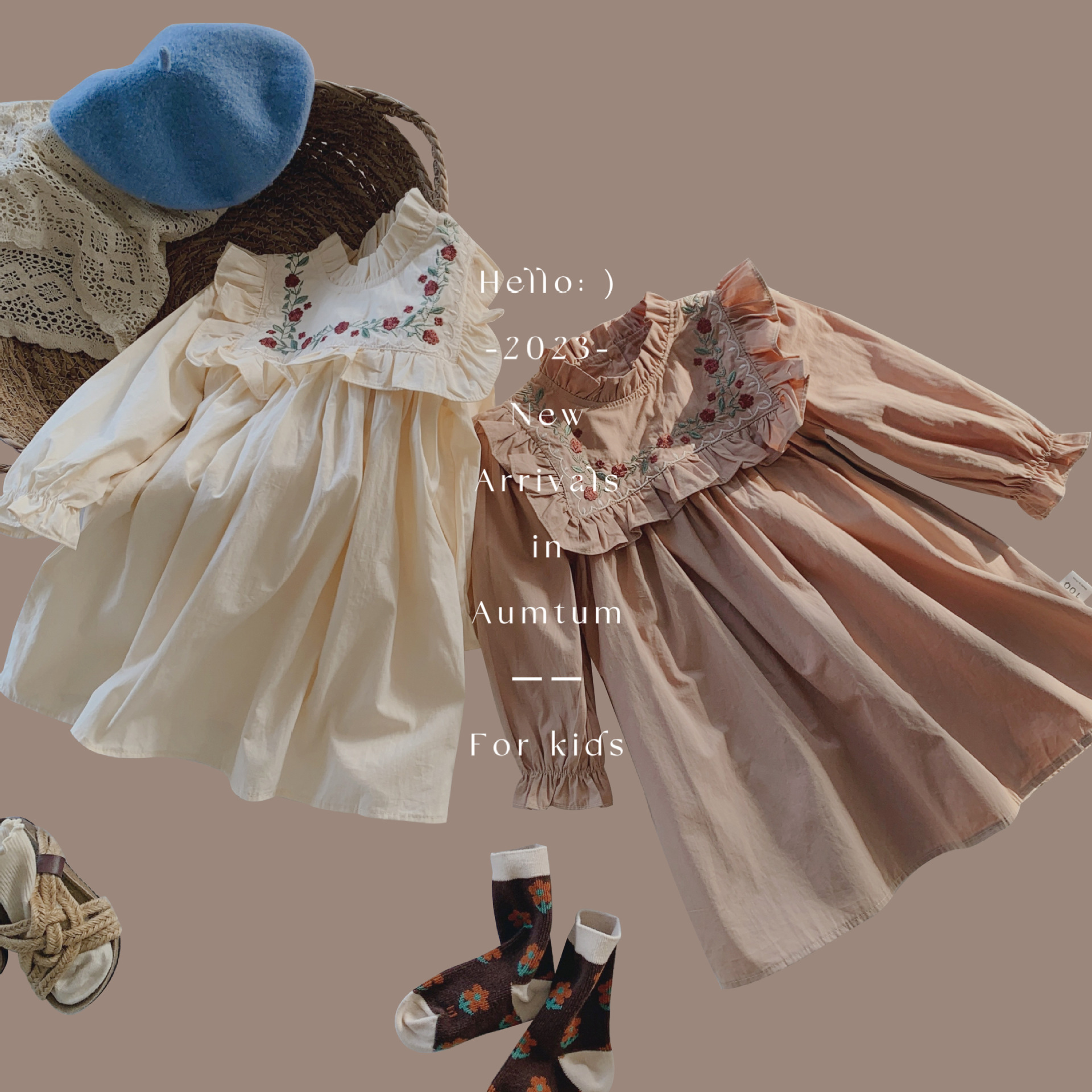 프랑스 자수 꽃 스탠드 칼라 소녀 원피스 2023 가을 주름 긴 소매 소녀 공주 치마 도매