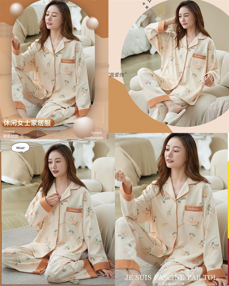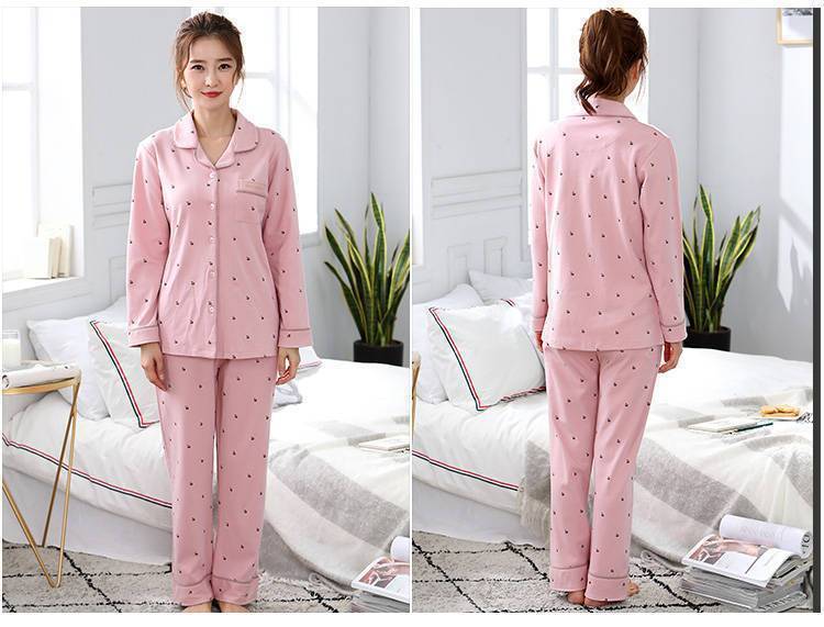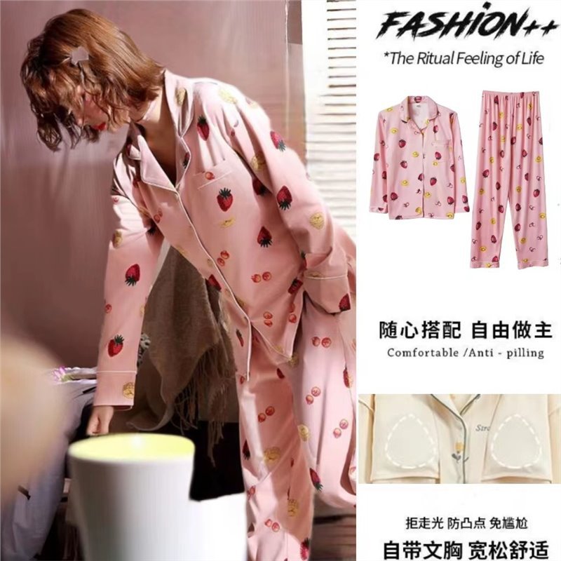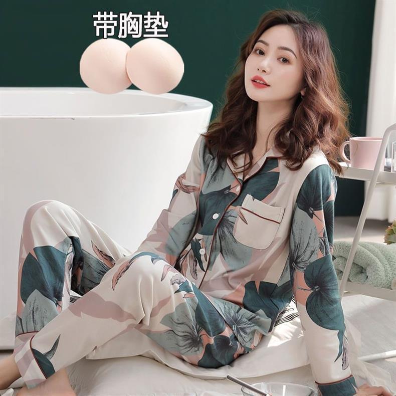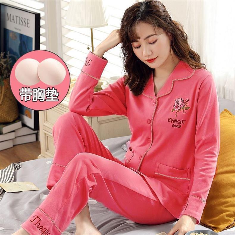 100% 면 잠옷 가슴 패드 여자의 봄과 가을 세트 긴 소매 바지 봄과 가을 얇은 플러스 사이즈 가정 의류