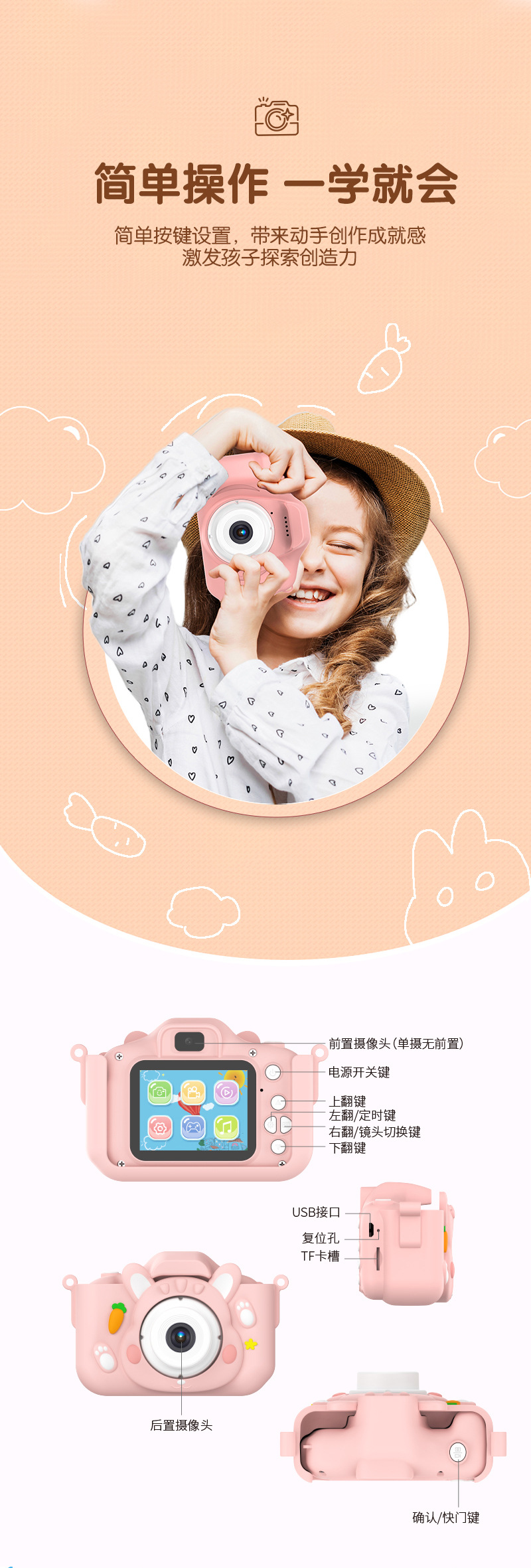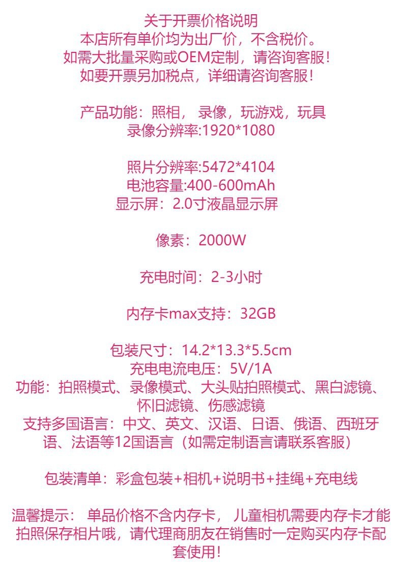 어린이용 고화질 디지털 카메라 만화 미니 카메라 장난감 사진 촬영 및 비디오 녹화 가능 생일 선물 공장 직송스토어 가기