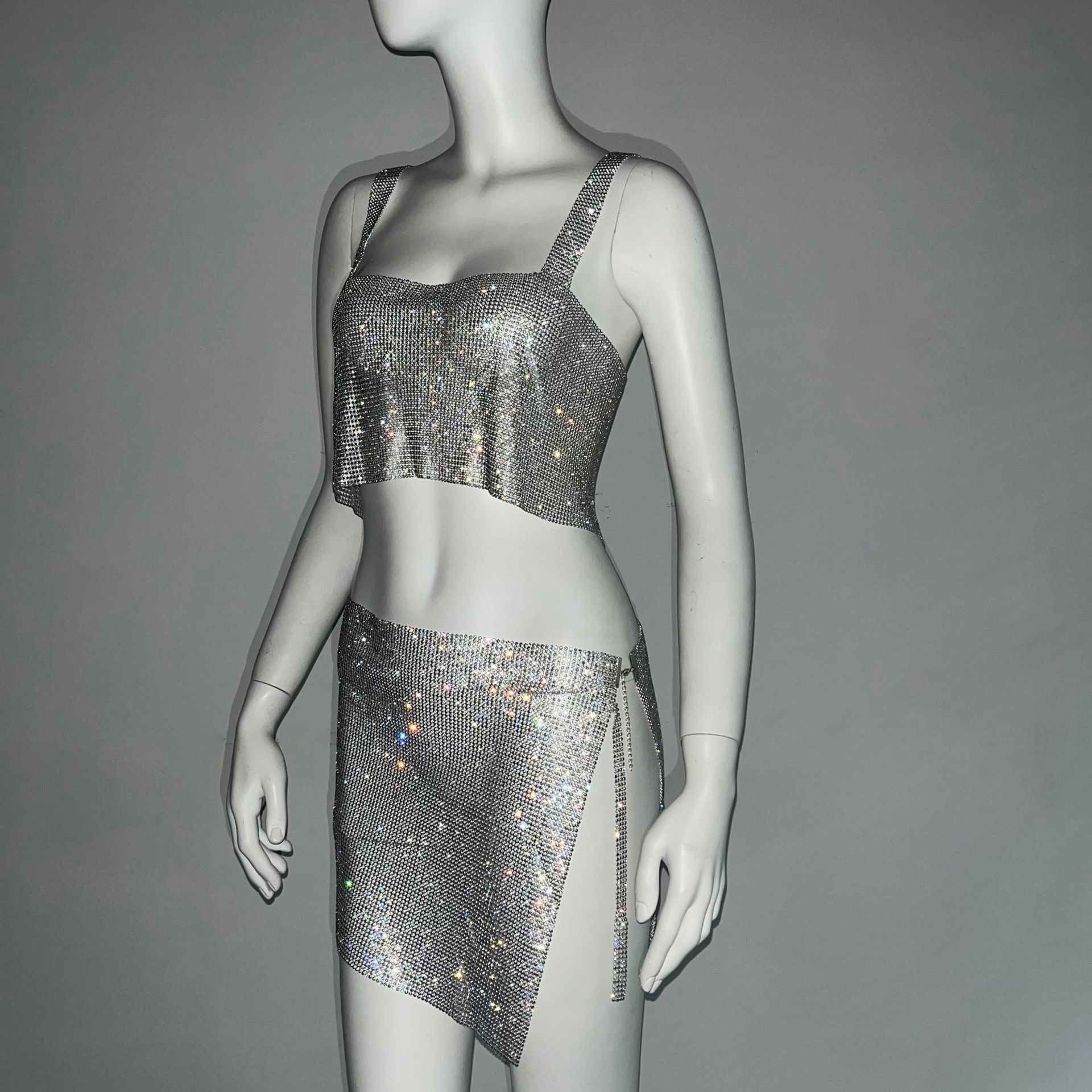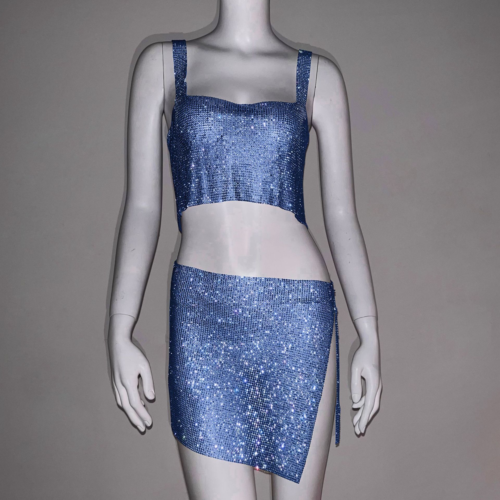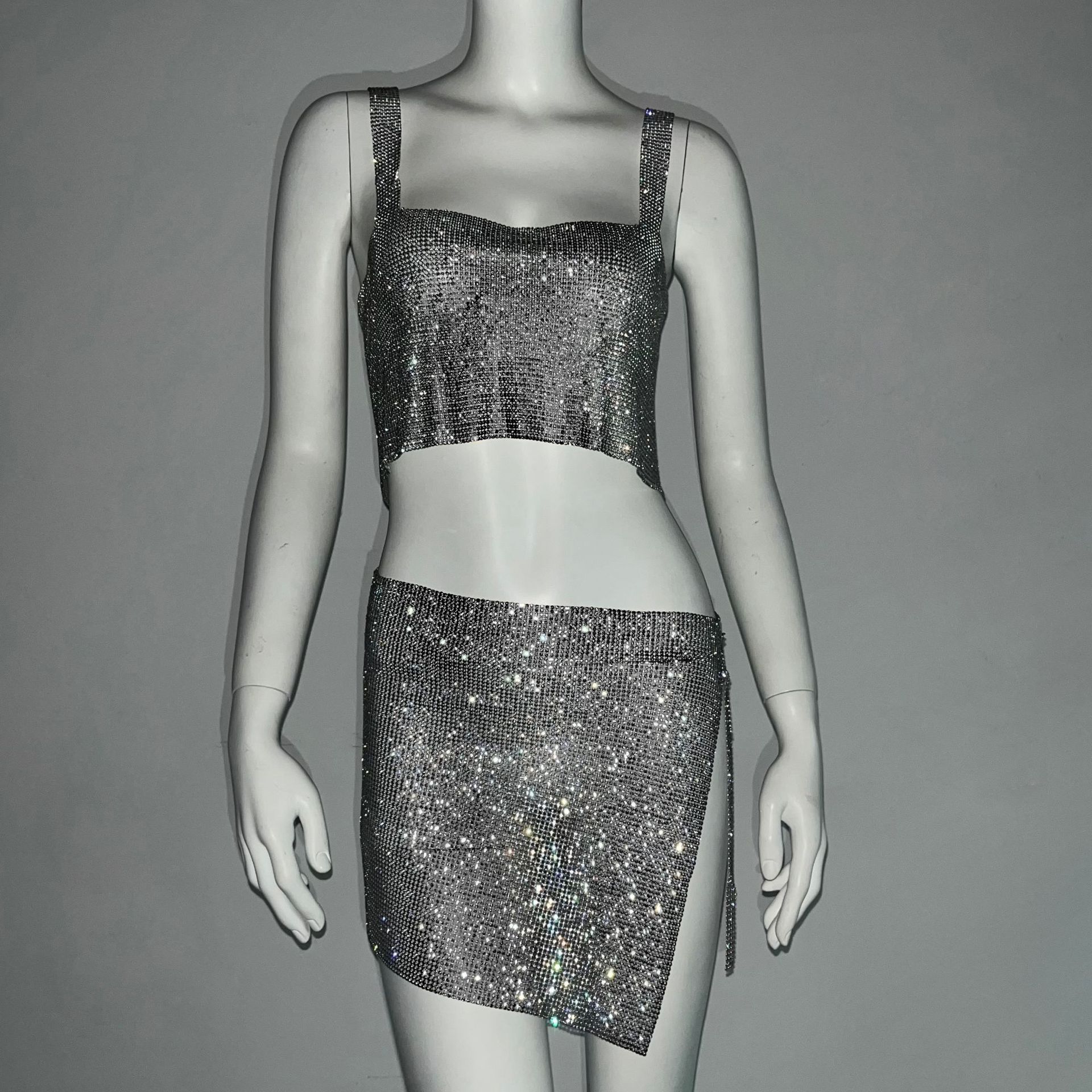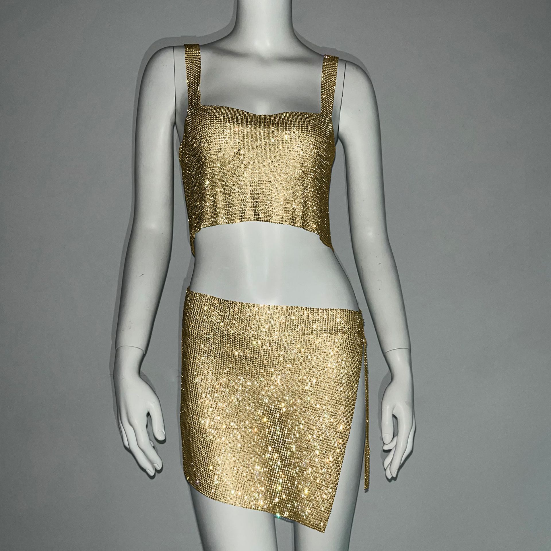 크로스 국경 아마존 유럽과 미국 섹시한 여자의 나이트 클럽 향신료 소녀 라인 석 금속 스트랩 스커트 세트 유행 조끼 여성스토어 가기