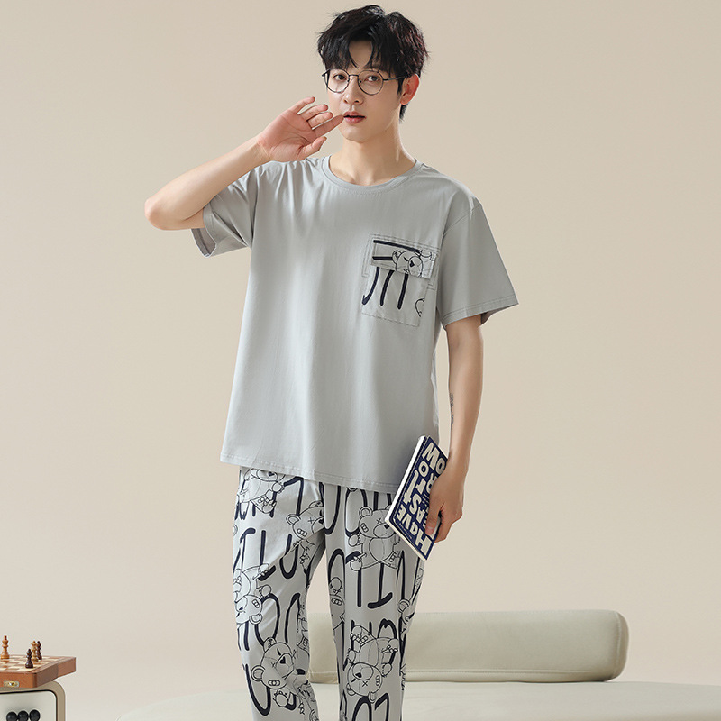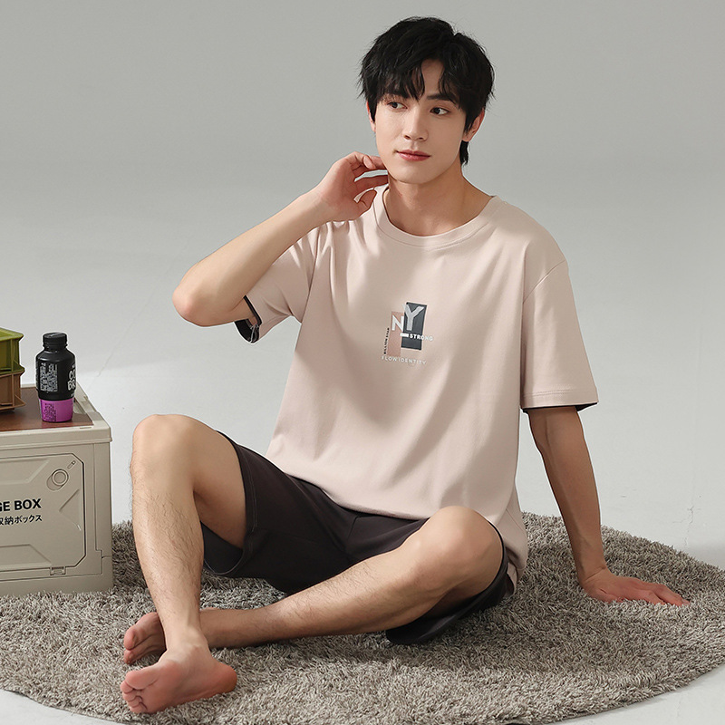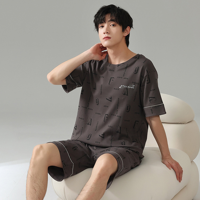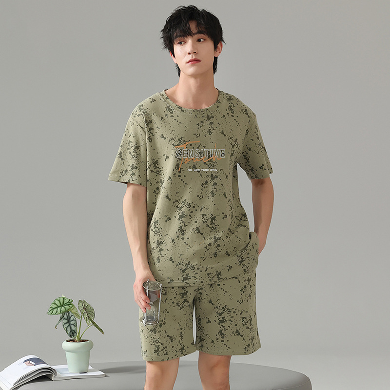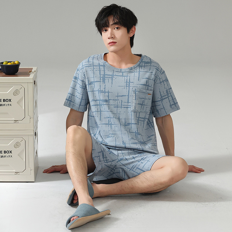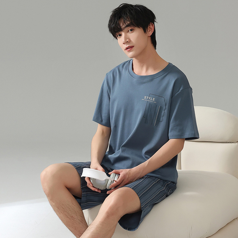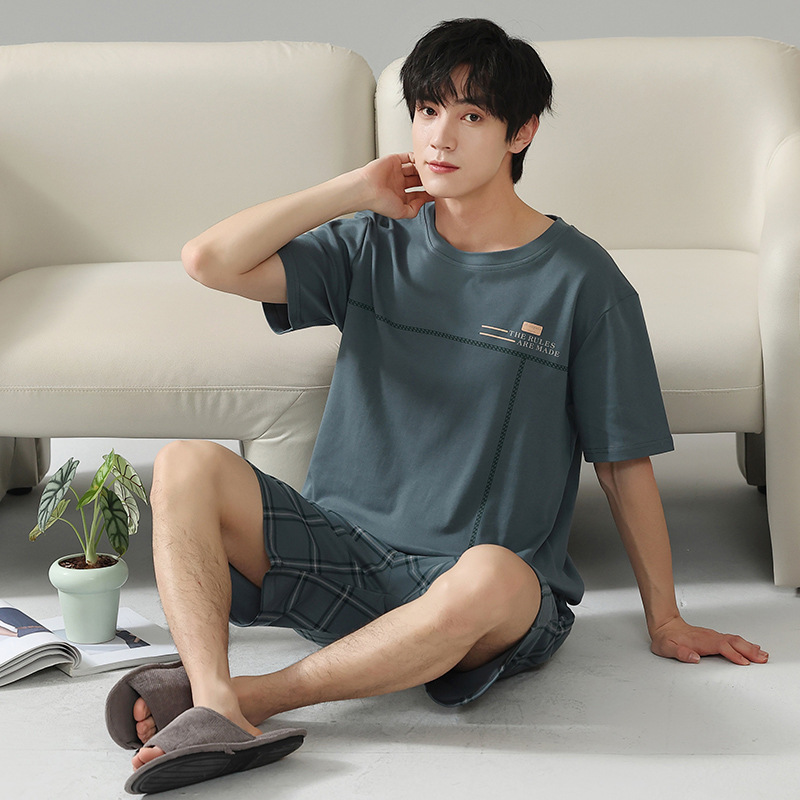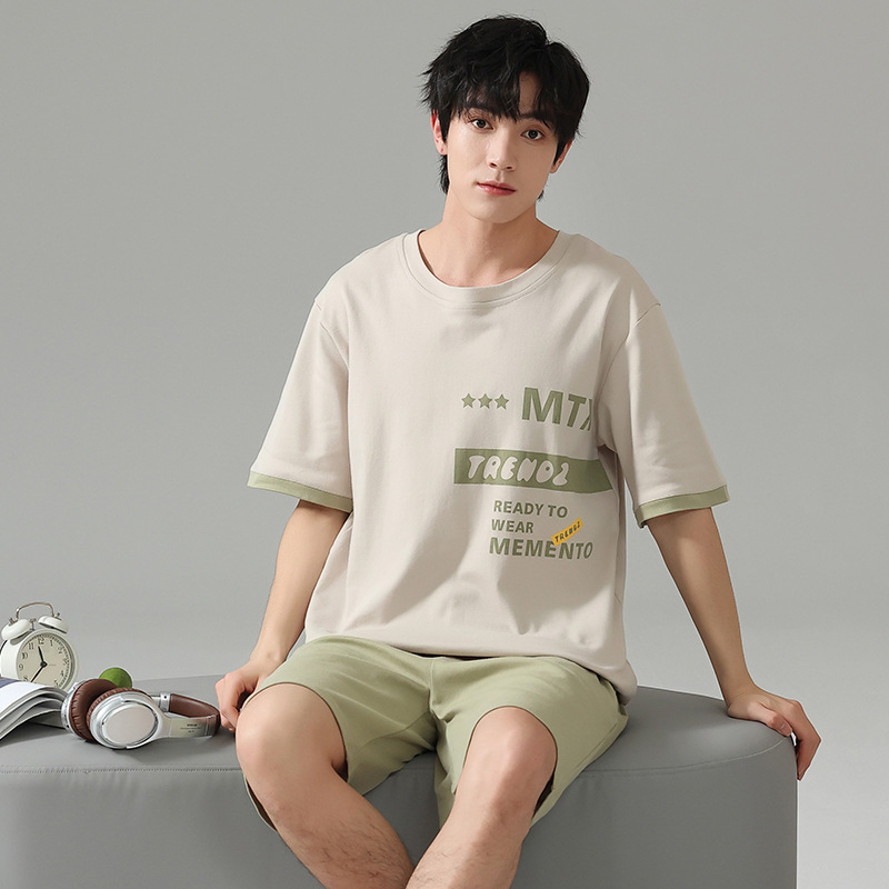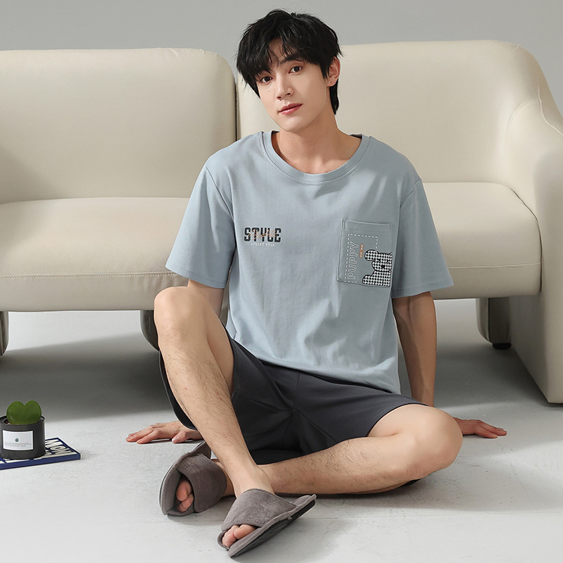 6535 면 유행 반팔 반바지 세트 잠옷 남성 여름 새로운 부드러운 얇은 느슨한 외부 착용 홈 의류스토어 가기