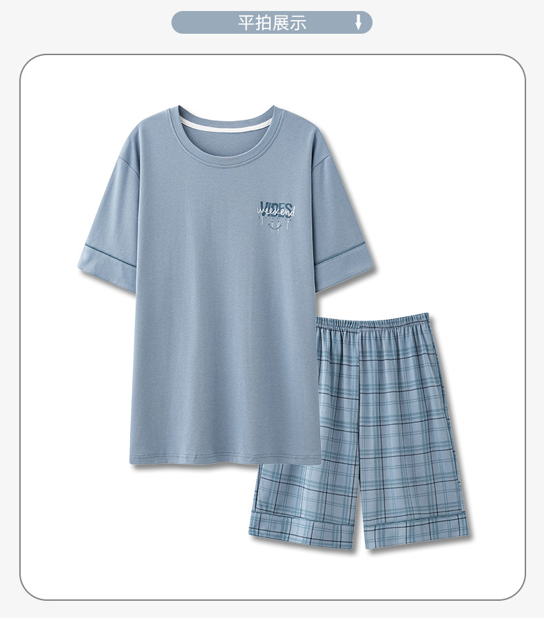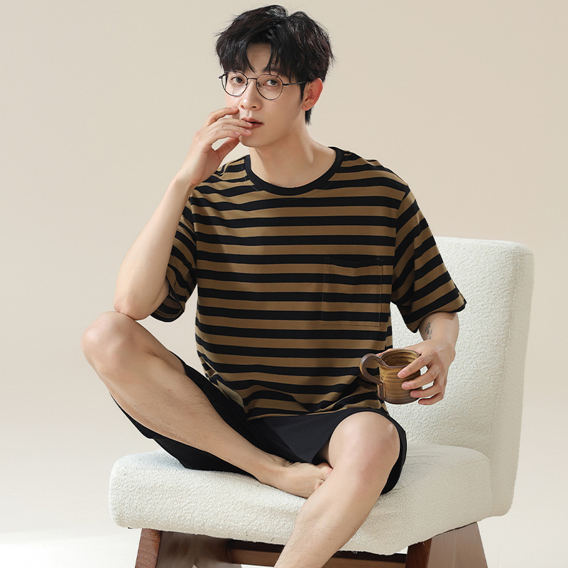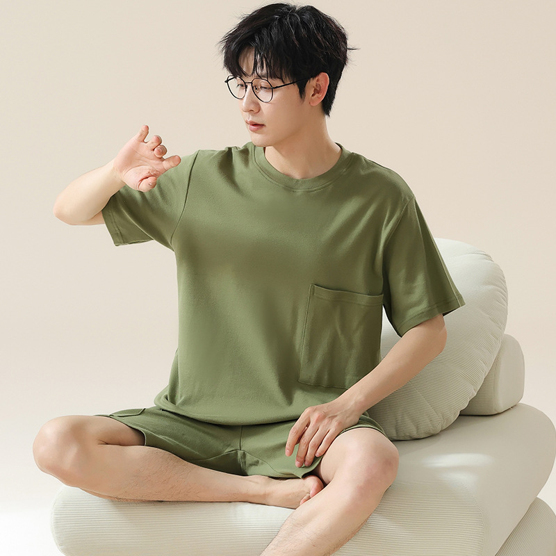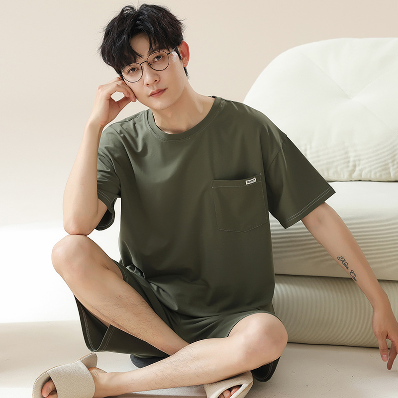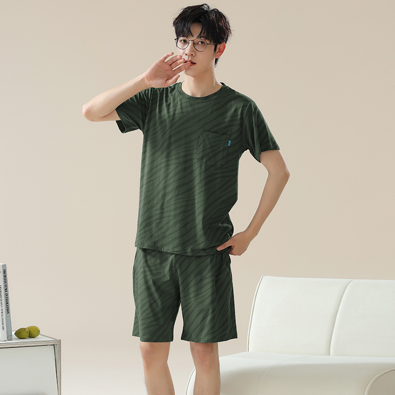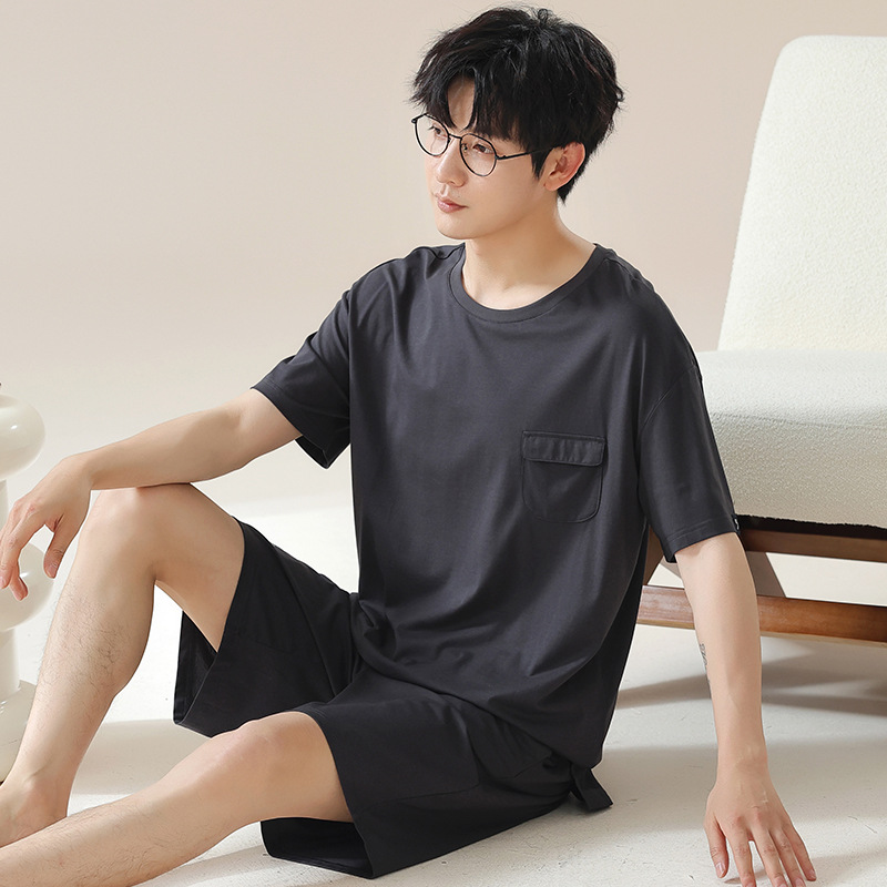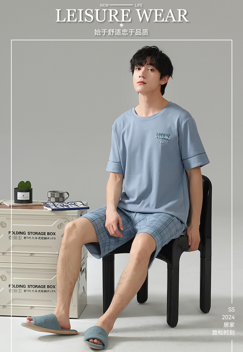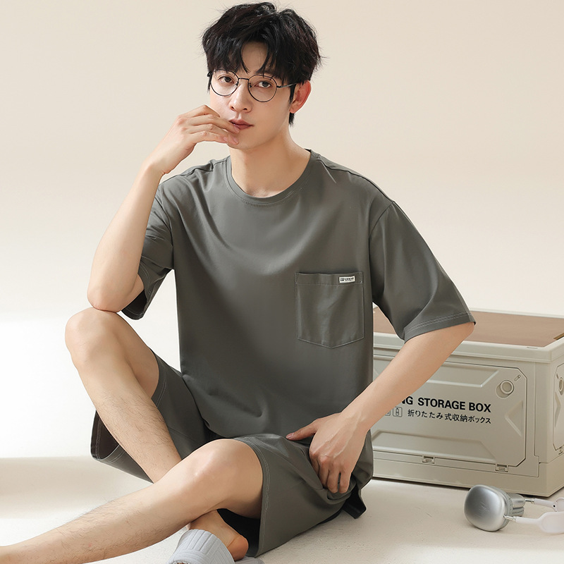 6535 면 유행 반팔 반바지 세트 잠옷 남성 여름 새로운 부드러운 얇은 느슨한 외부 착용 홈 의류스토어 가기