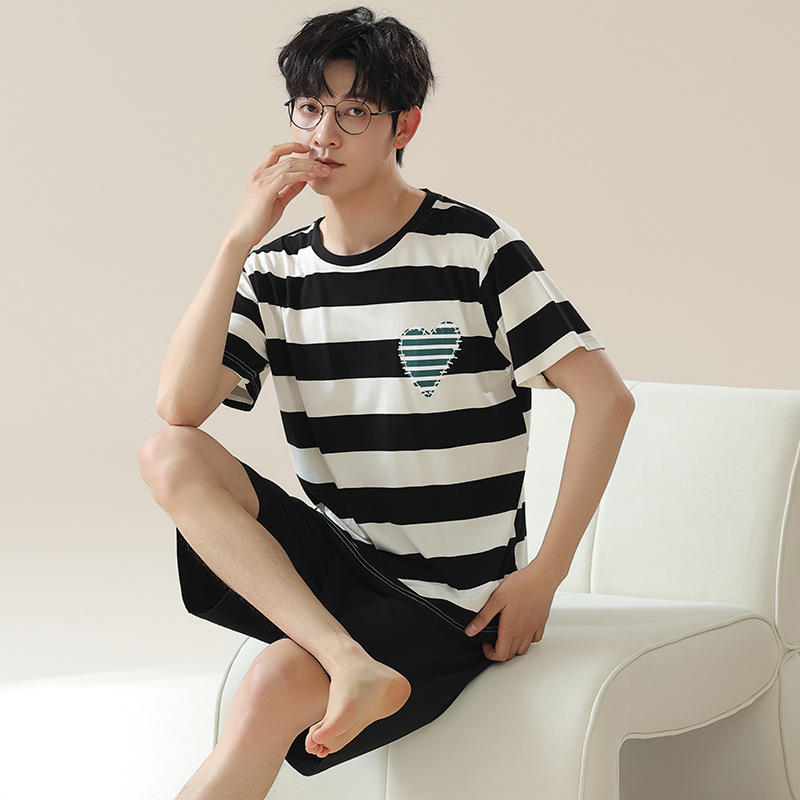 6535 면 유행 반팔 반바지 세트 잠옷 남성 여름 새로운 부드러운 얇은 느슨한 외부 착용 홈 의류