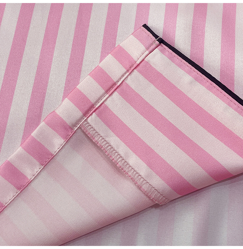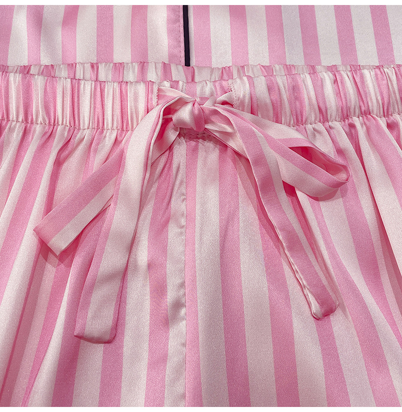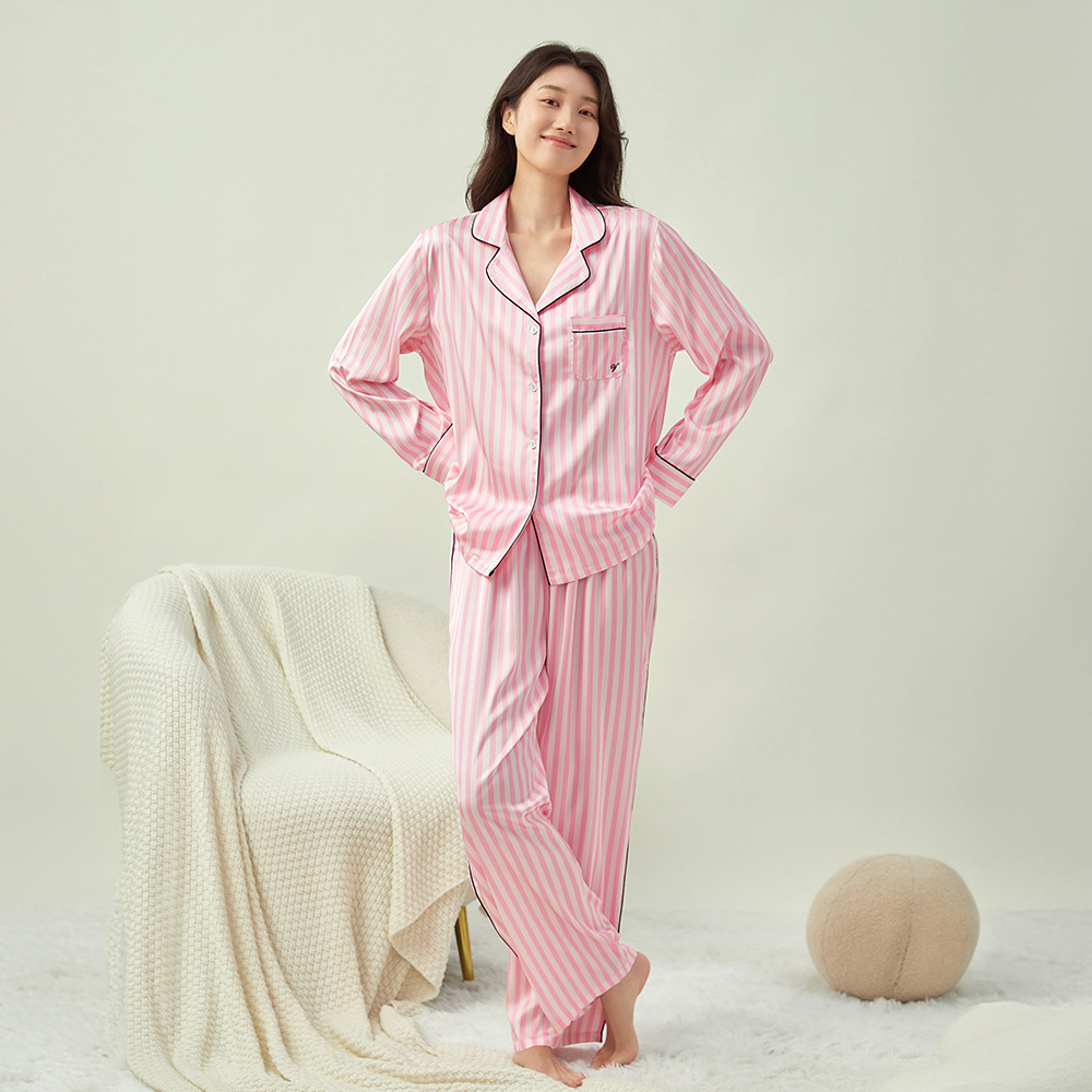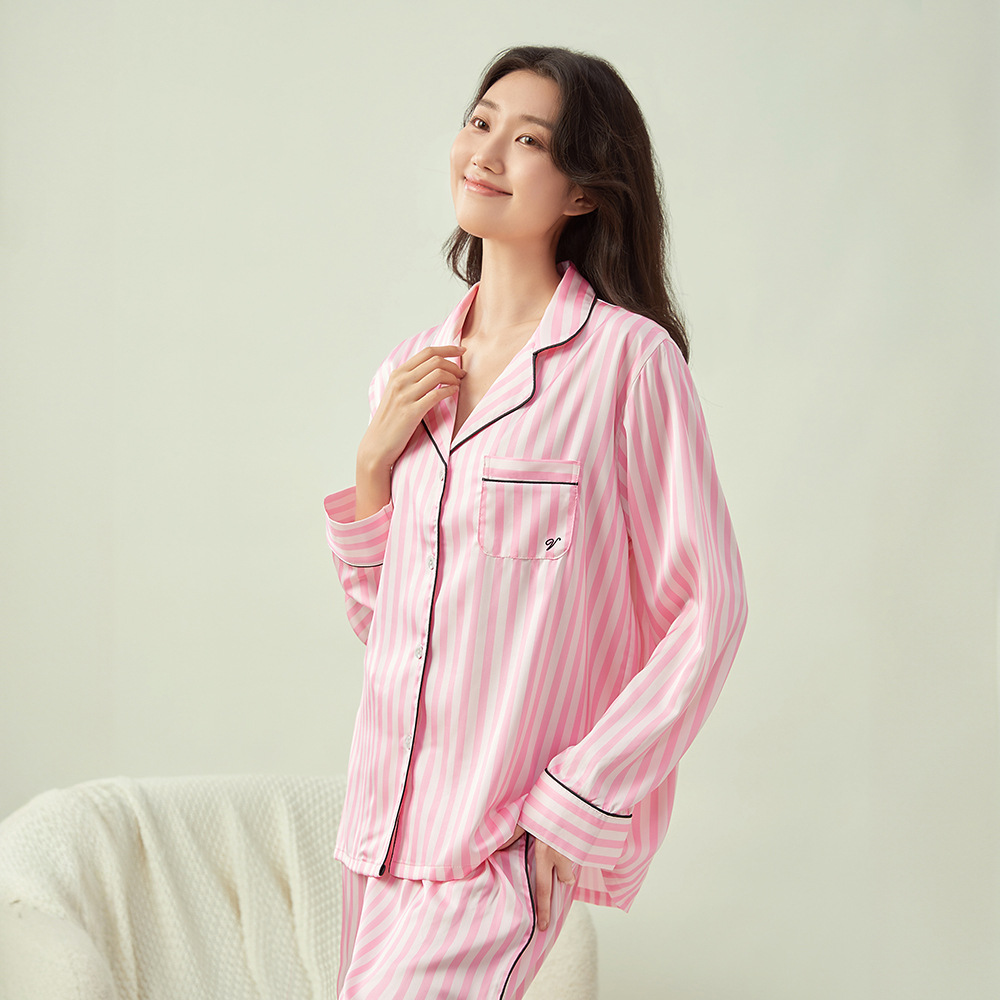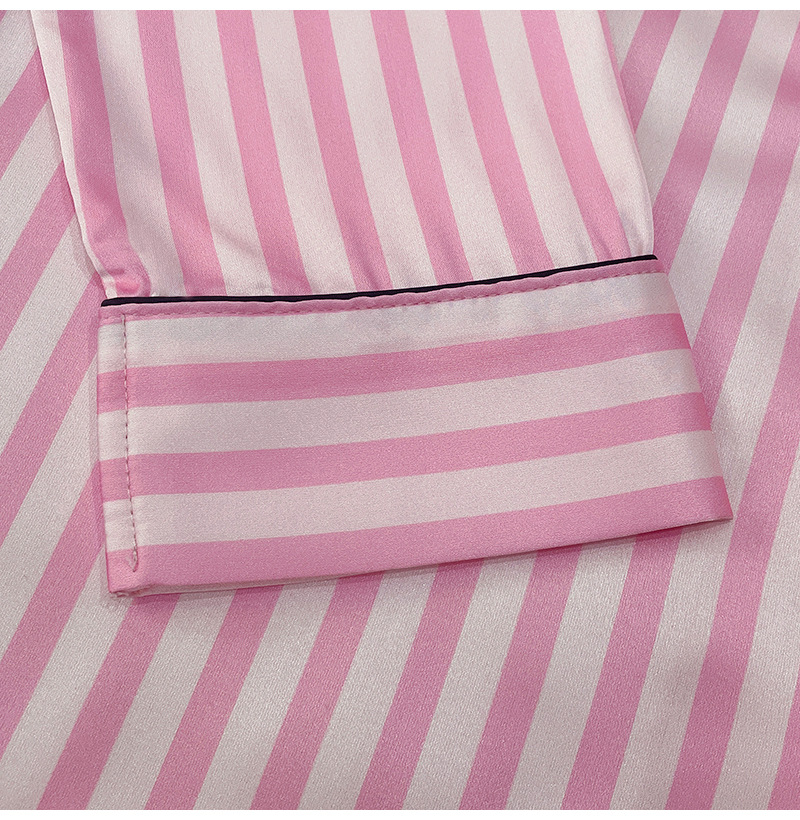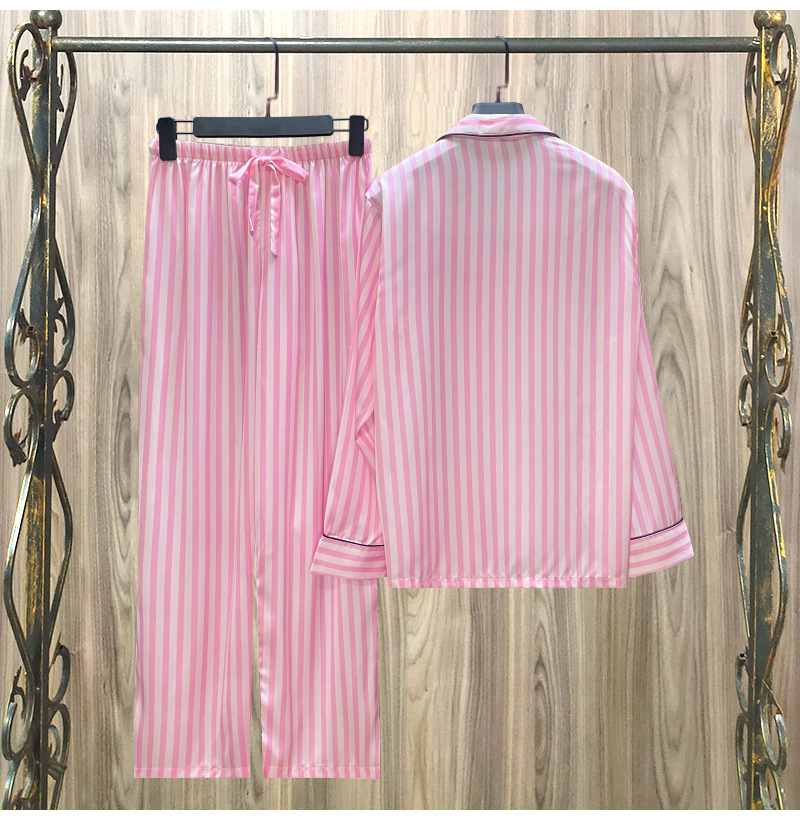 비밀 새 옷깃 긴 소매 핑크 줄무늬 아이스 실크 파자마 여성 Пижама 홈 세트