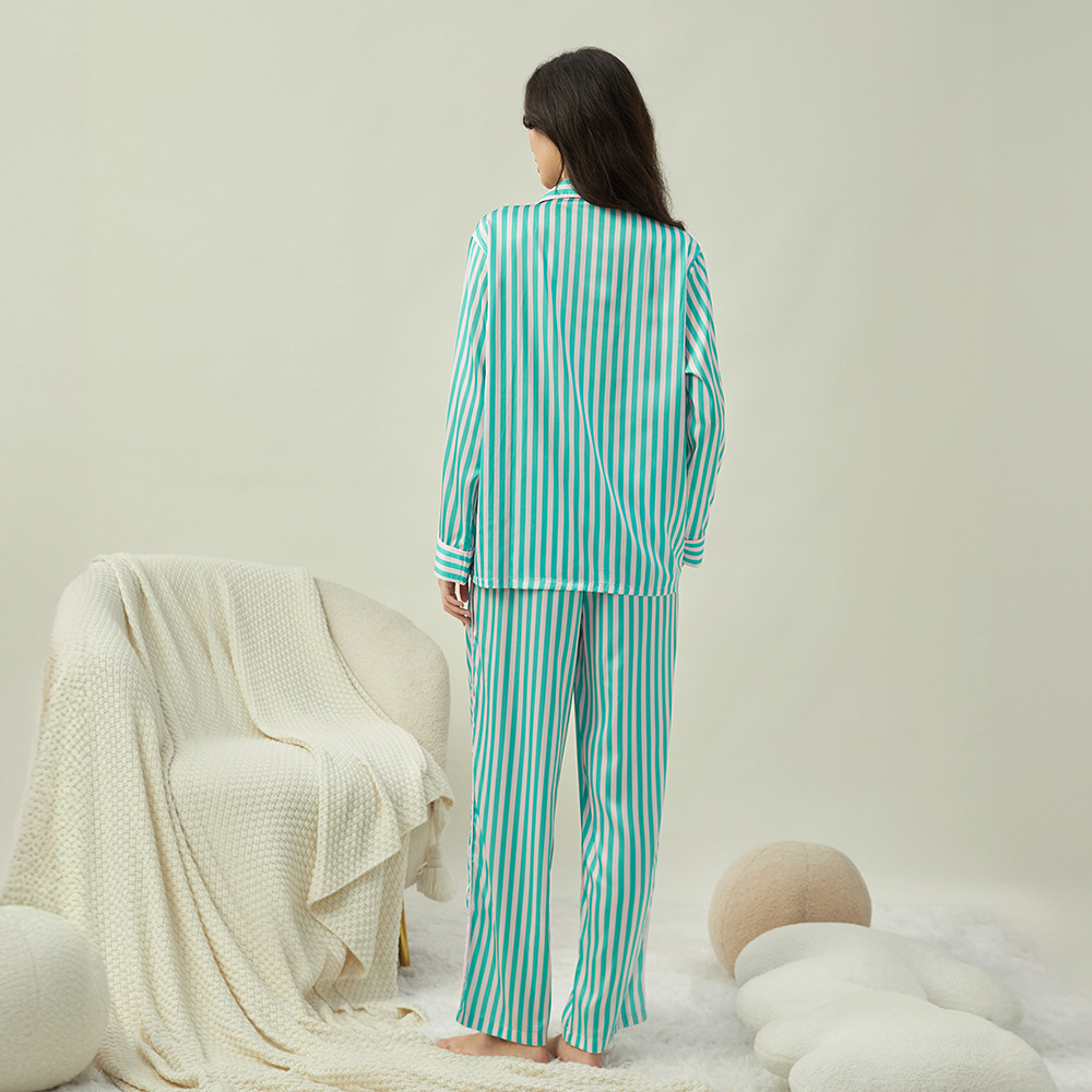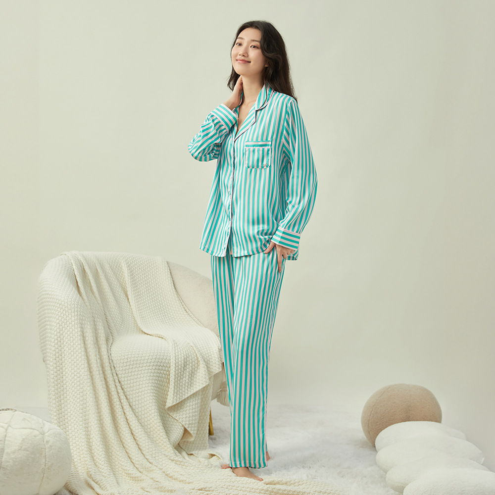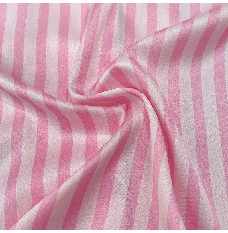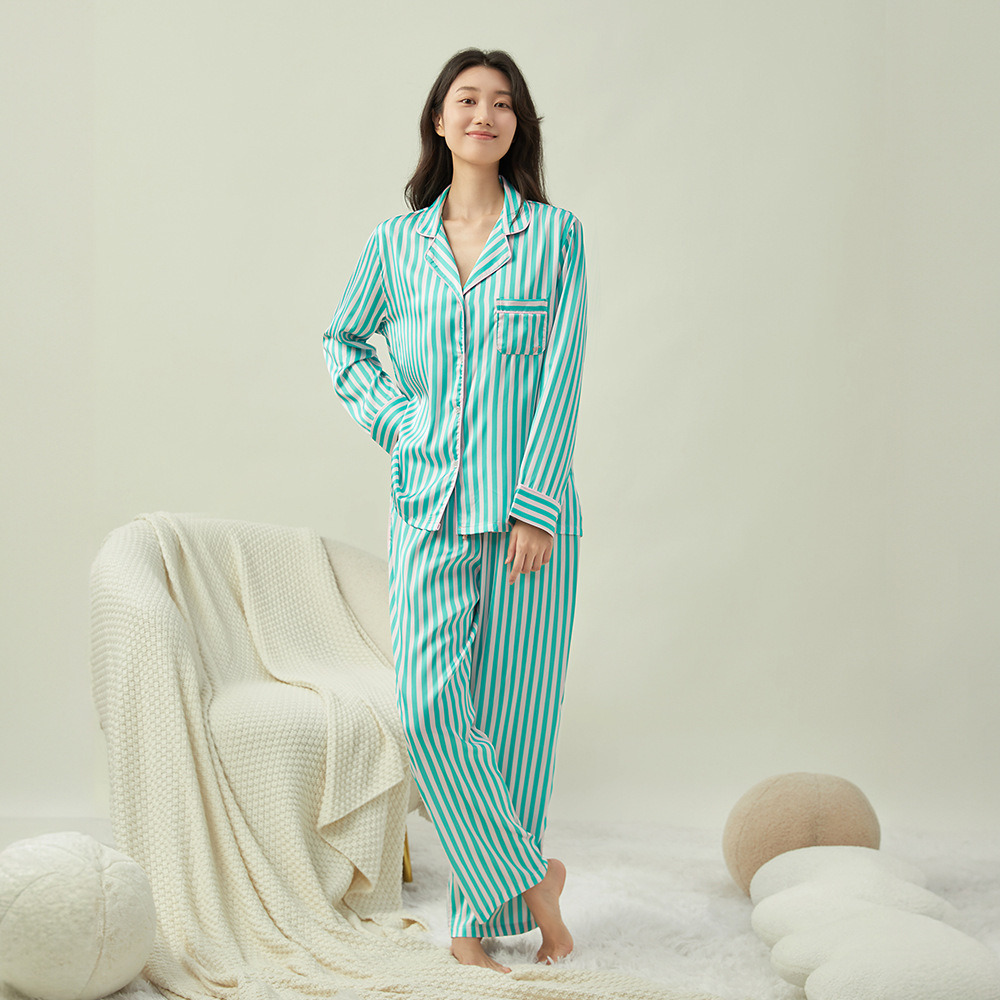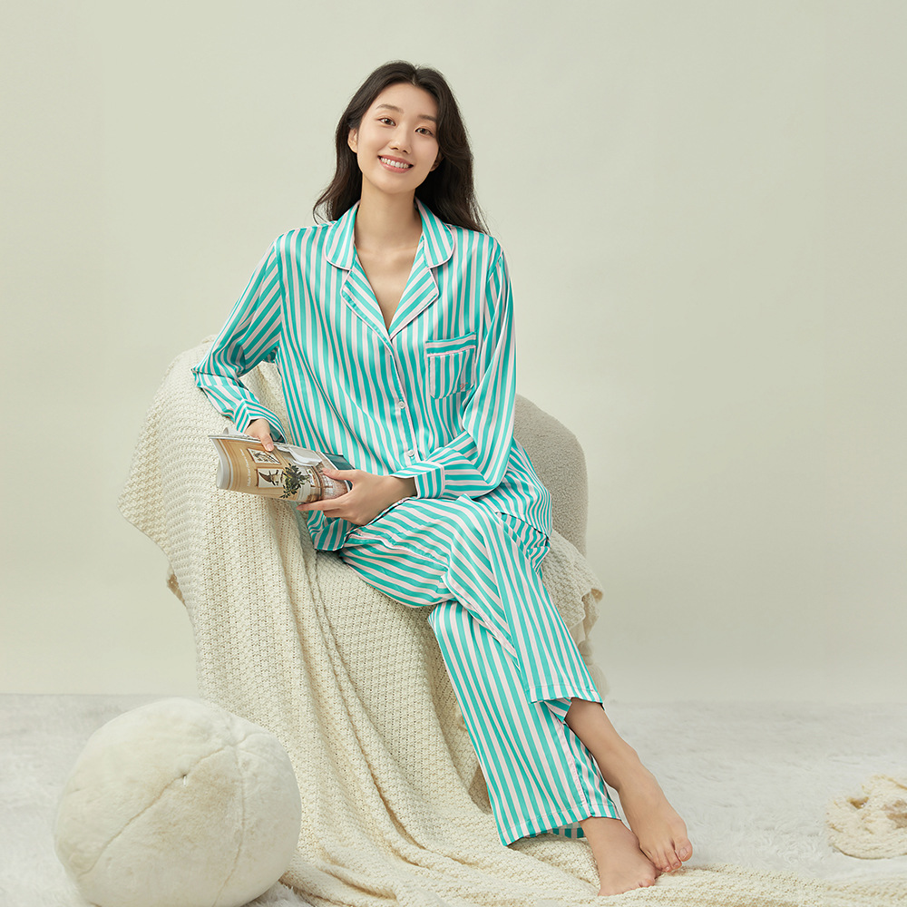 비밀 새 옷깃 긴 소매 핑크 줄무늬 아이스 실크 파자마 여성 Пижама 홈 세트