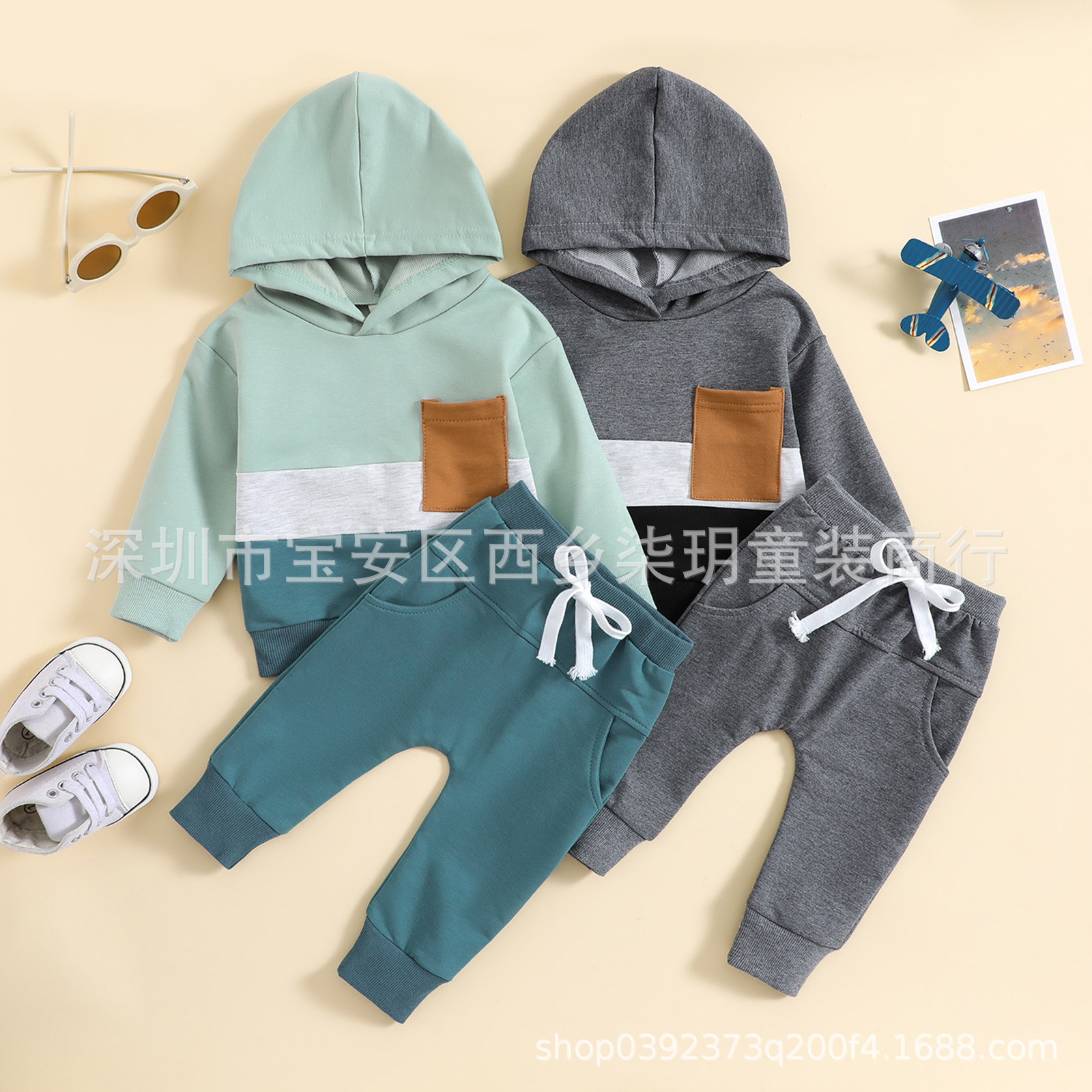 크로스 보더 가을 어린이 l 유행 후드 스웨터 세트 유럽과 미국 색상 매칭 긴 소매 바지 소년 캐주얼 투피스 세트스토어 가기