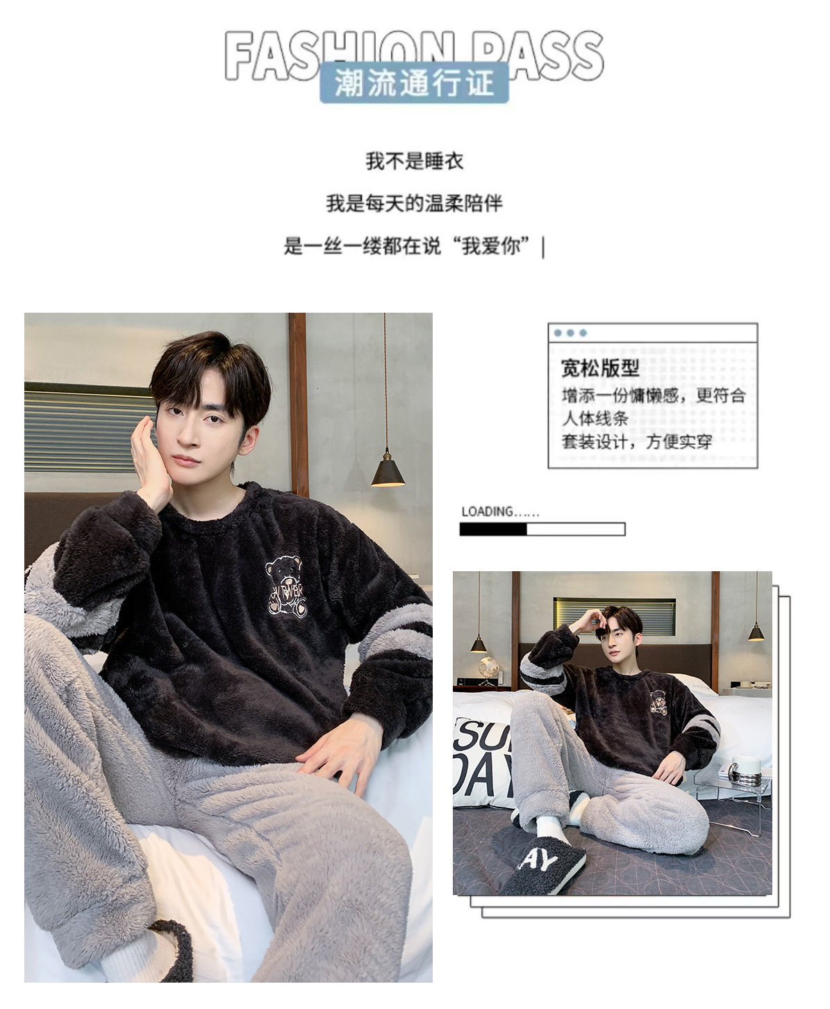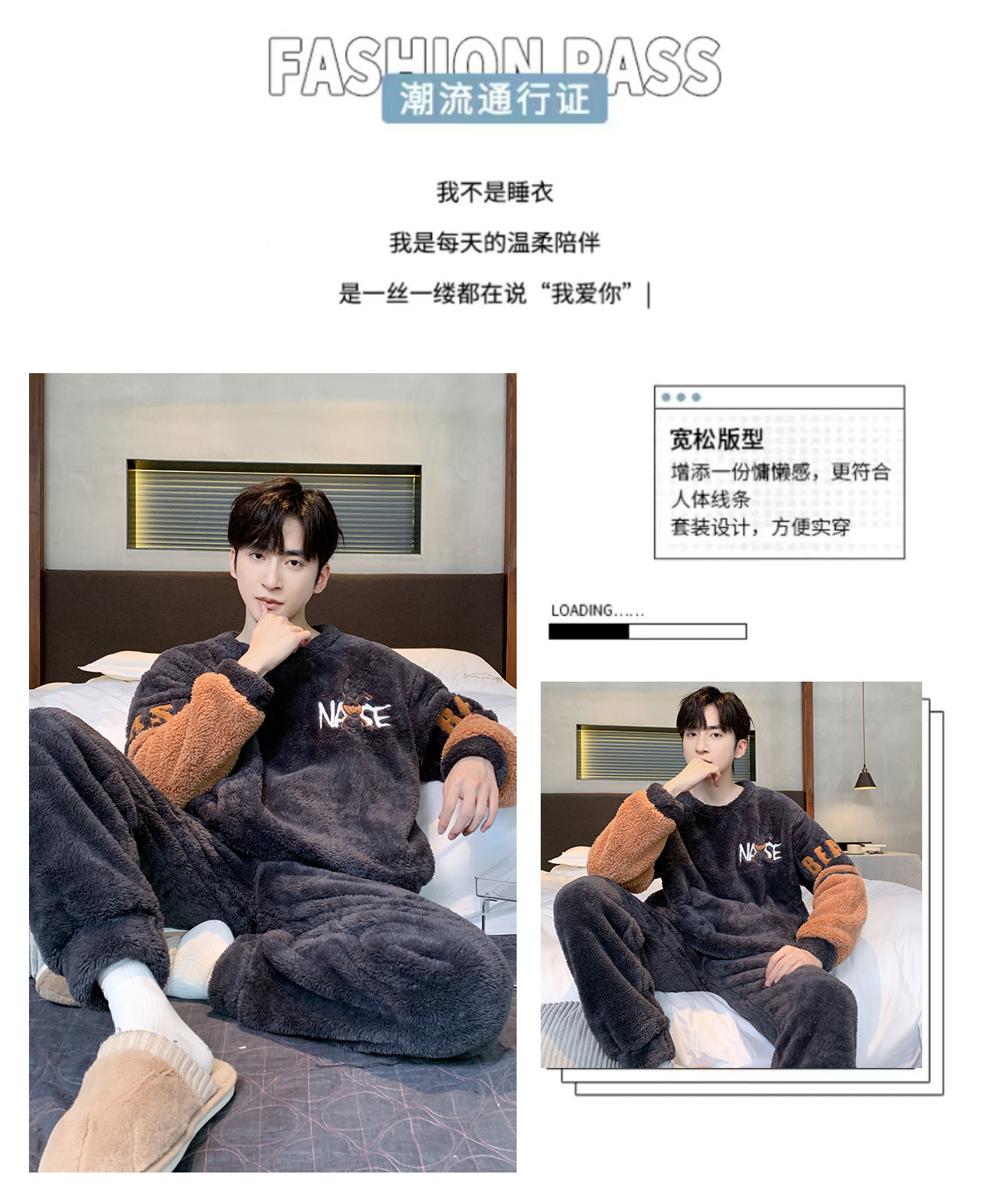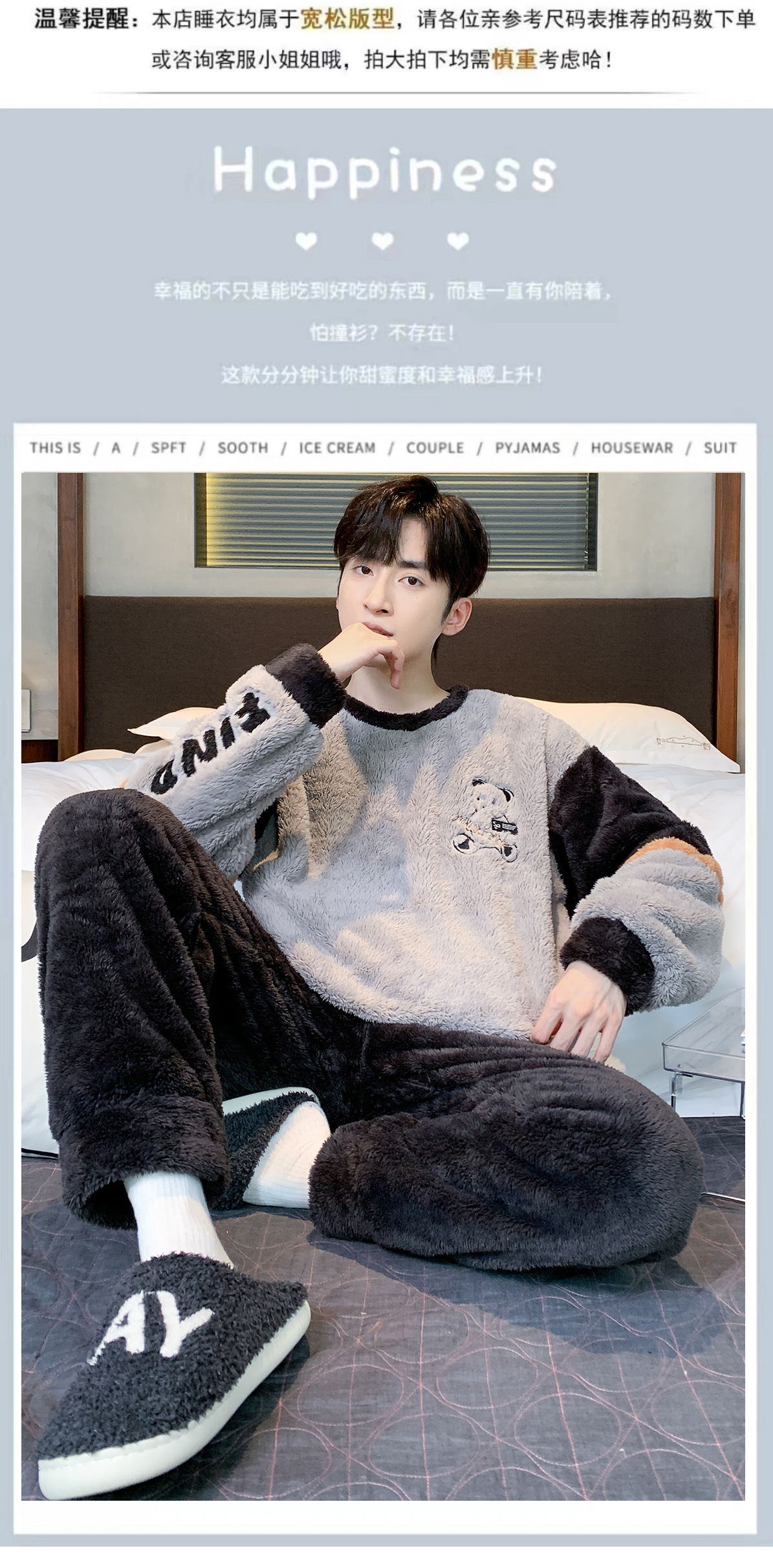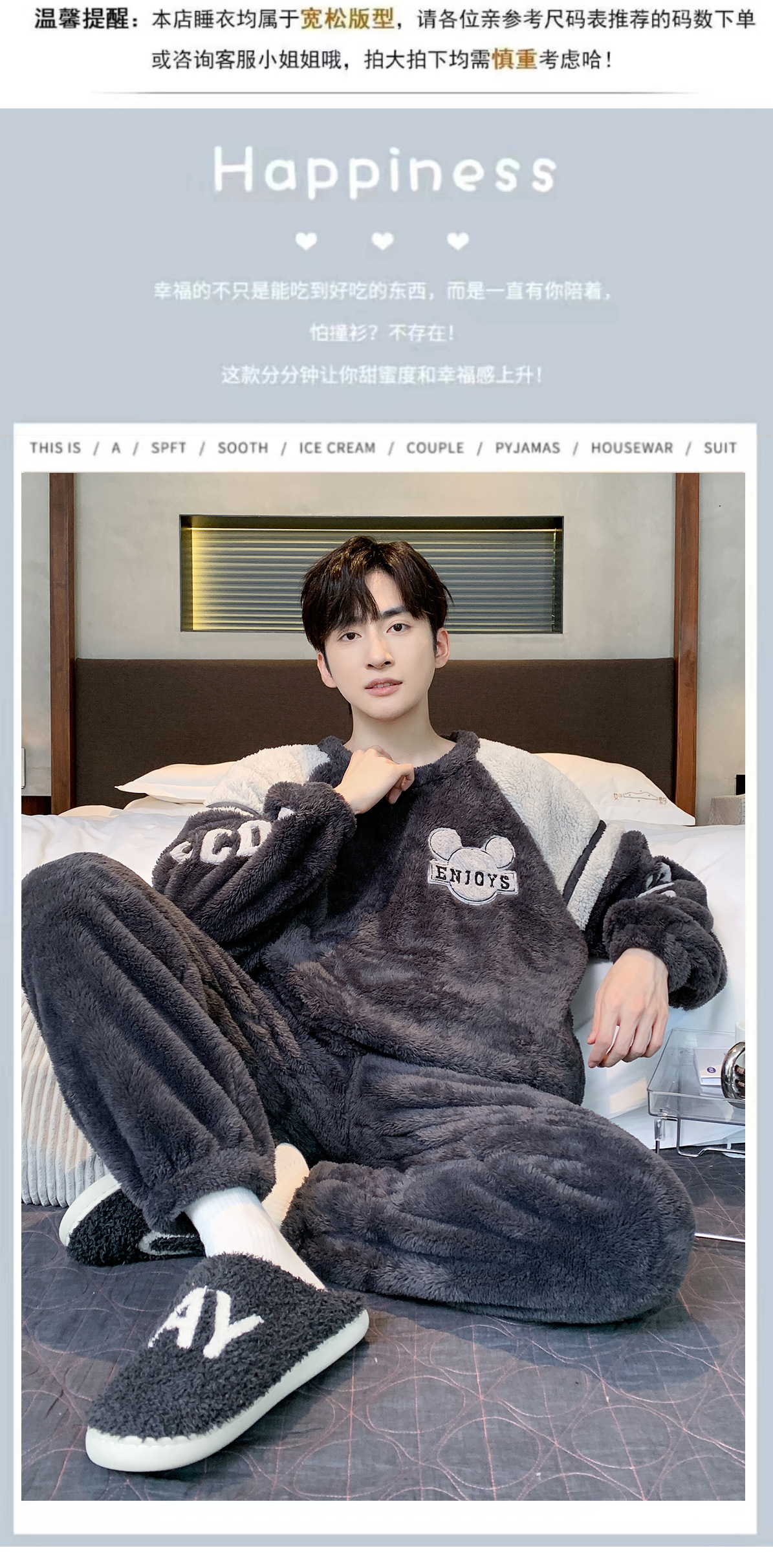 산호 양털 잠옷 남자의 가을과 겨울 기모 두꺼운 세트 남자의 한국식 라운드 넥 플란넬 남성용 따뜻한 가정 의류스토어 가기