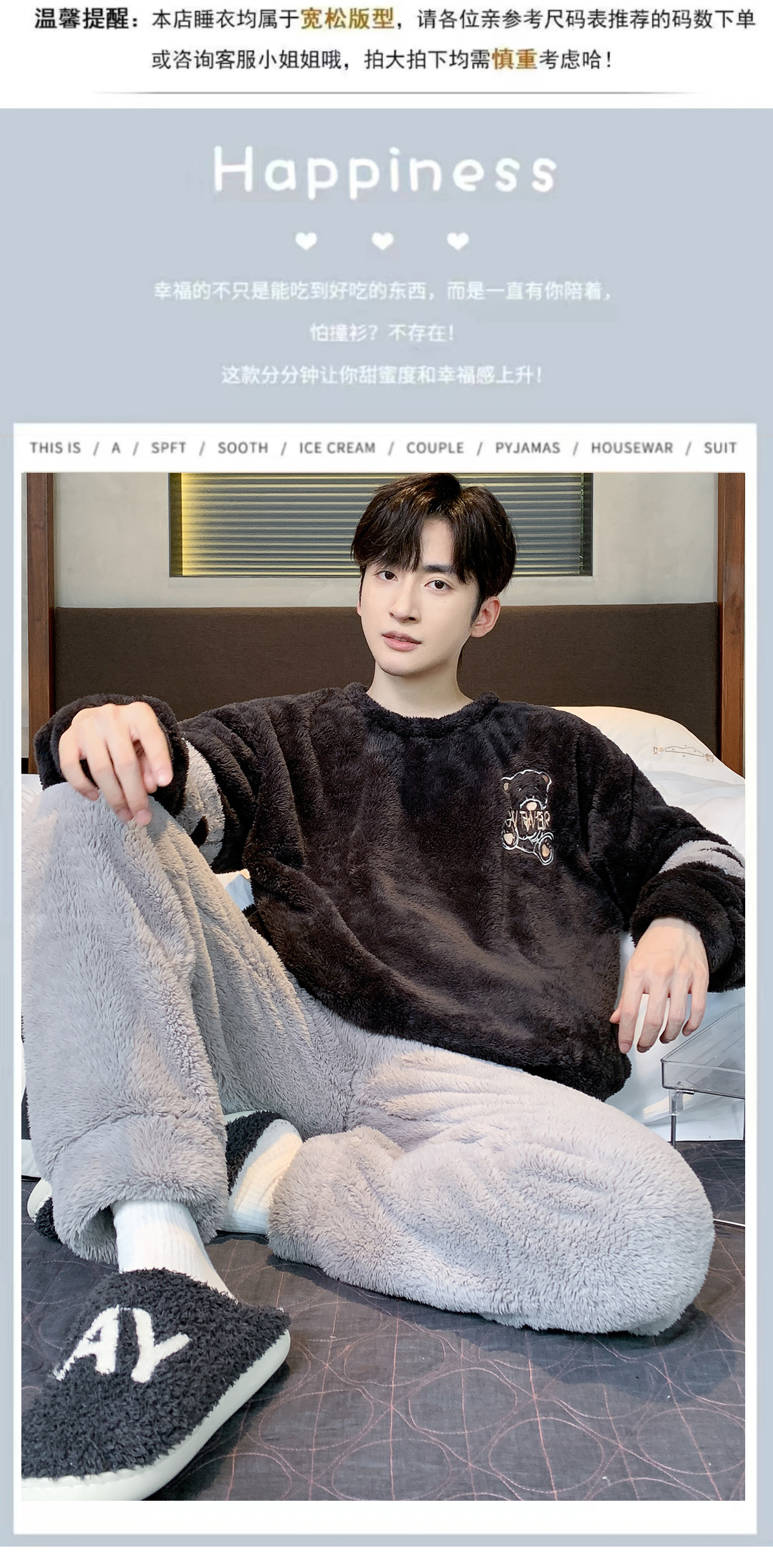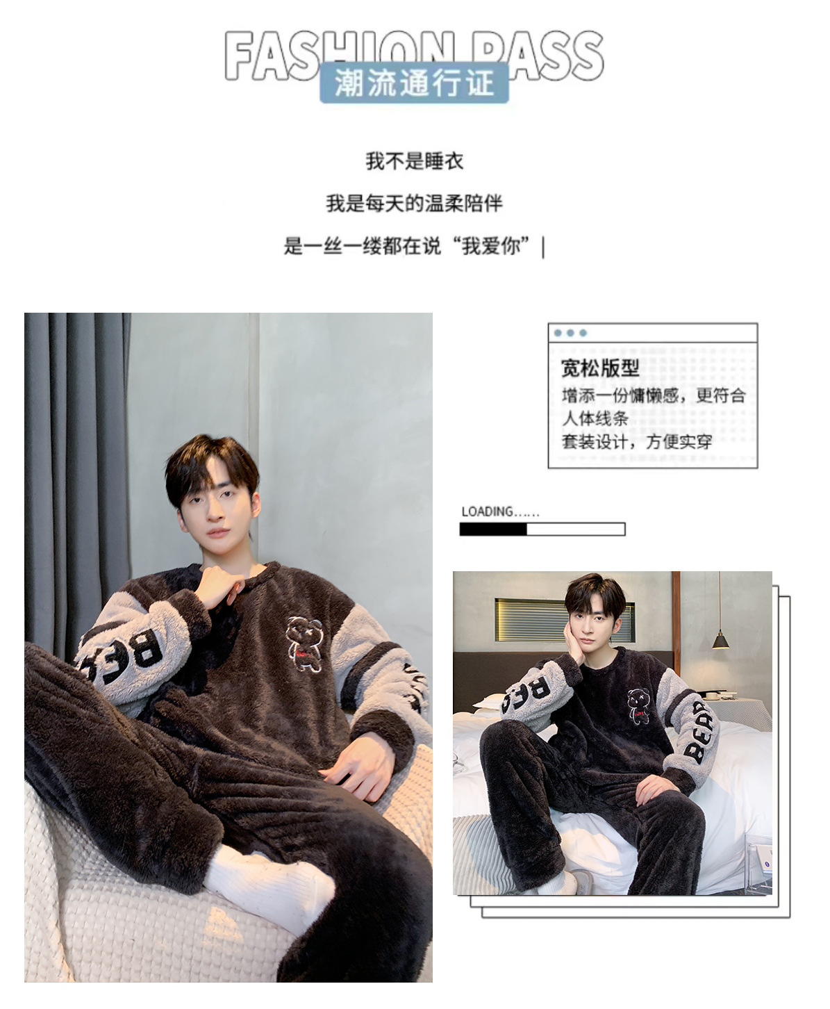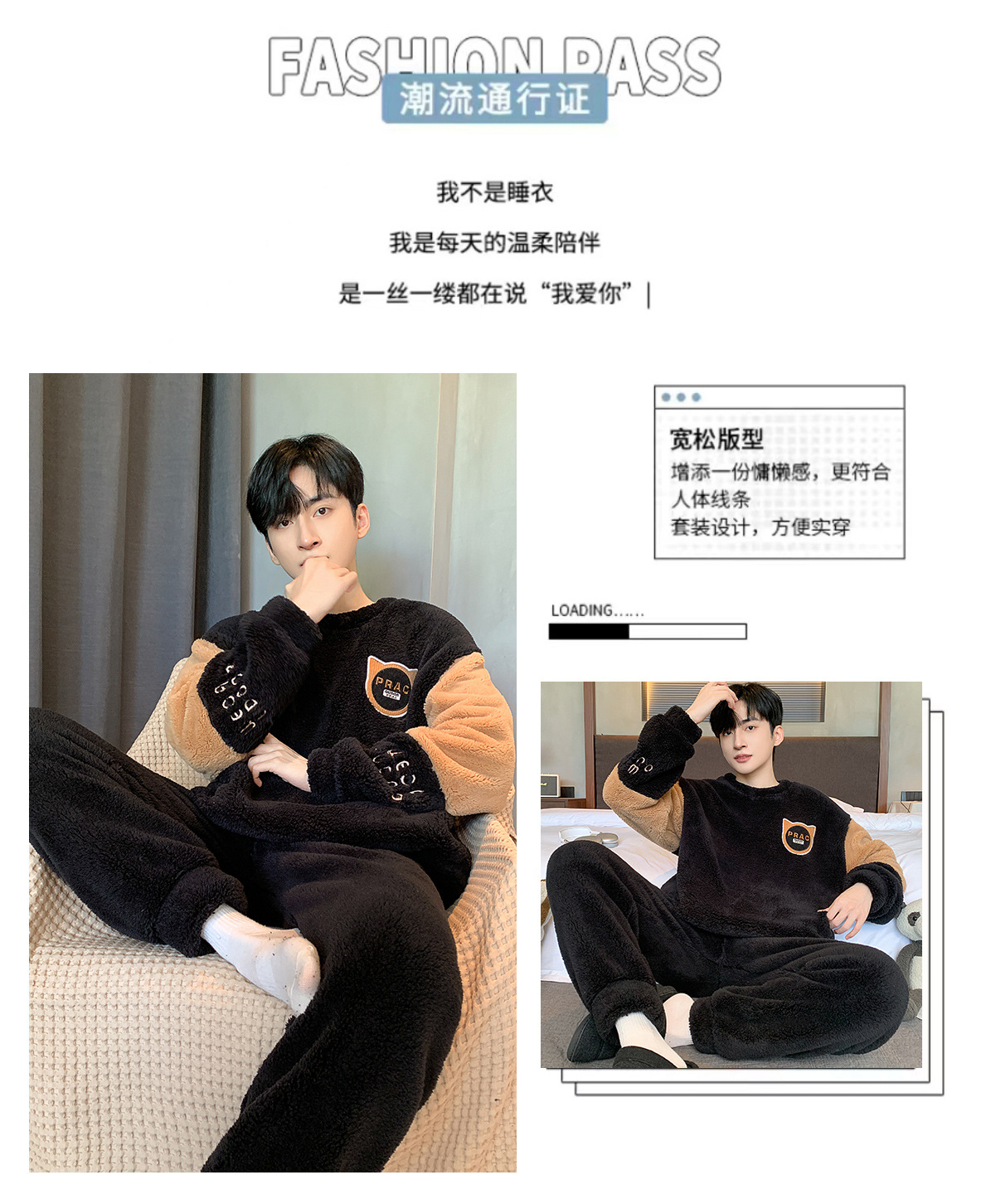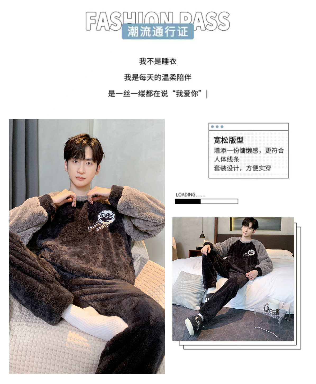 산호 양털 잠옷 남자의 가을과 겨울 기모 두꺼운 세트 남자의 한국식 라운드 넥 플란넬 남성용 따뜻한 가정 의류스토어 가기