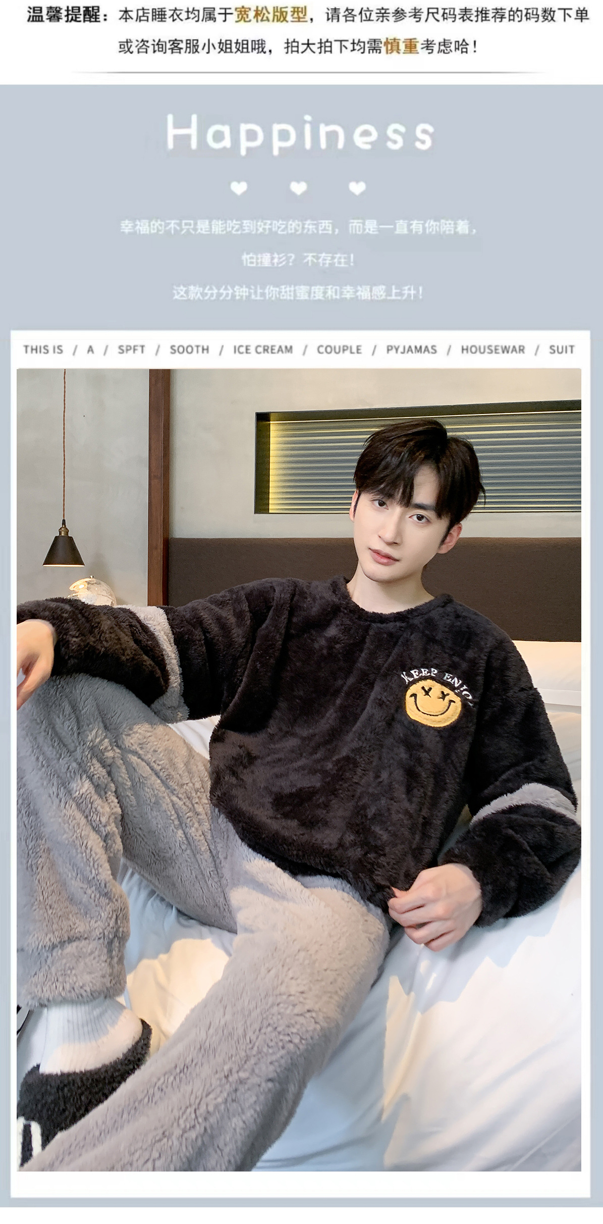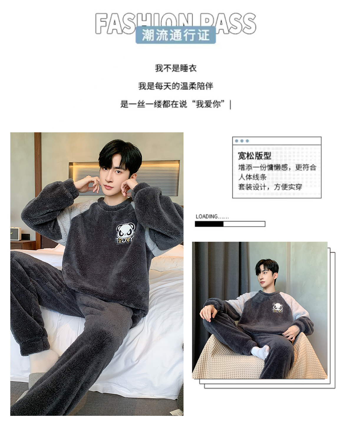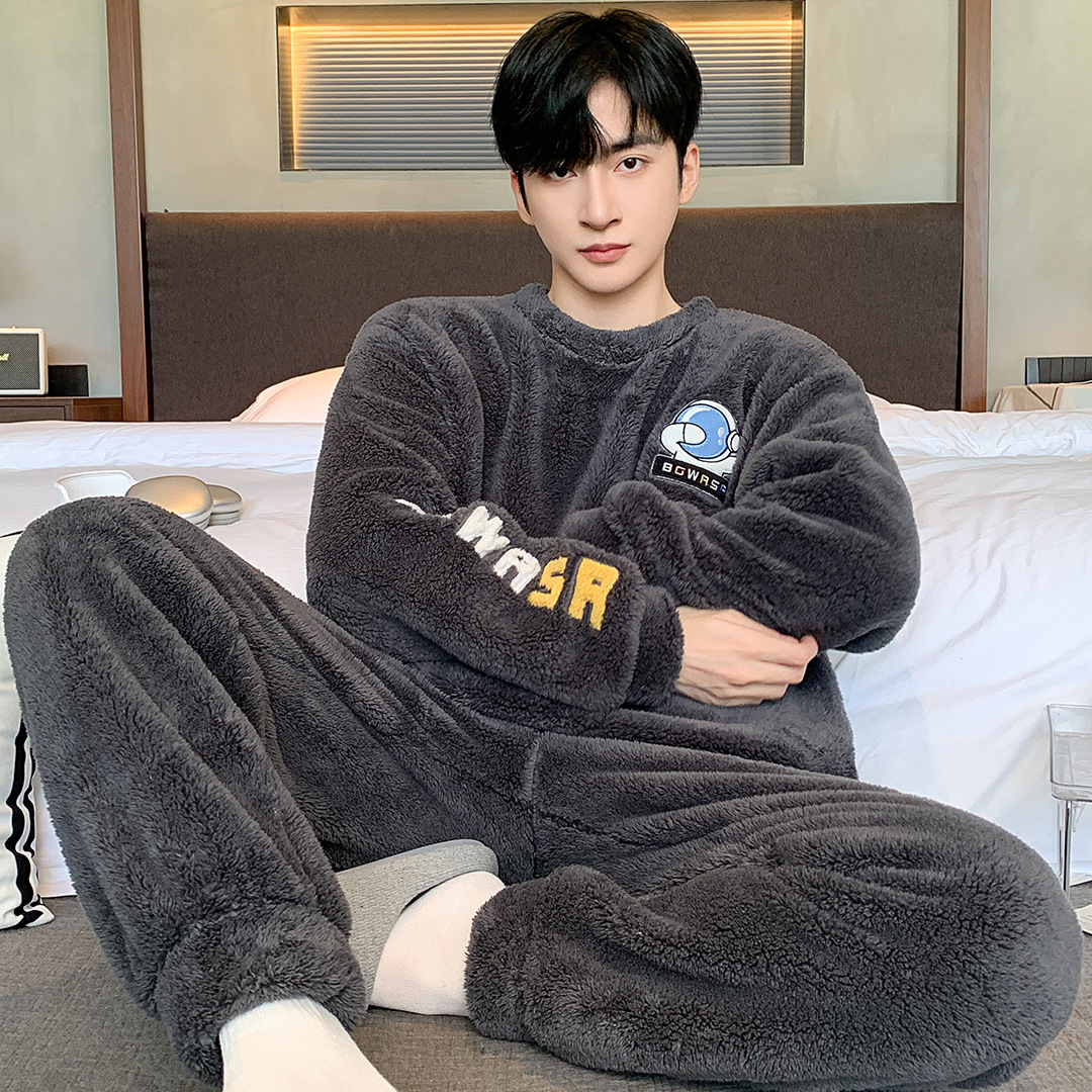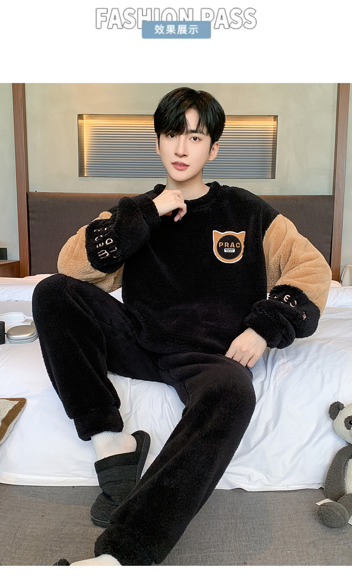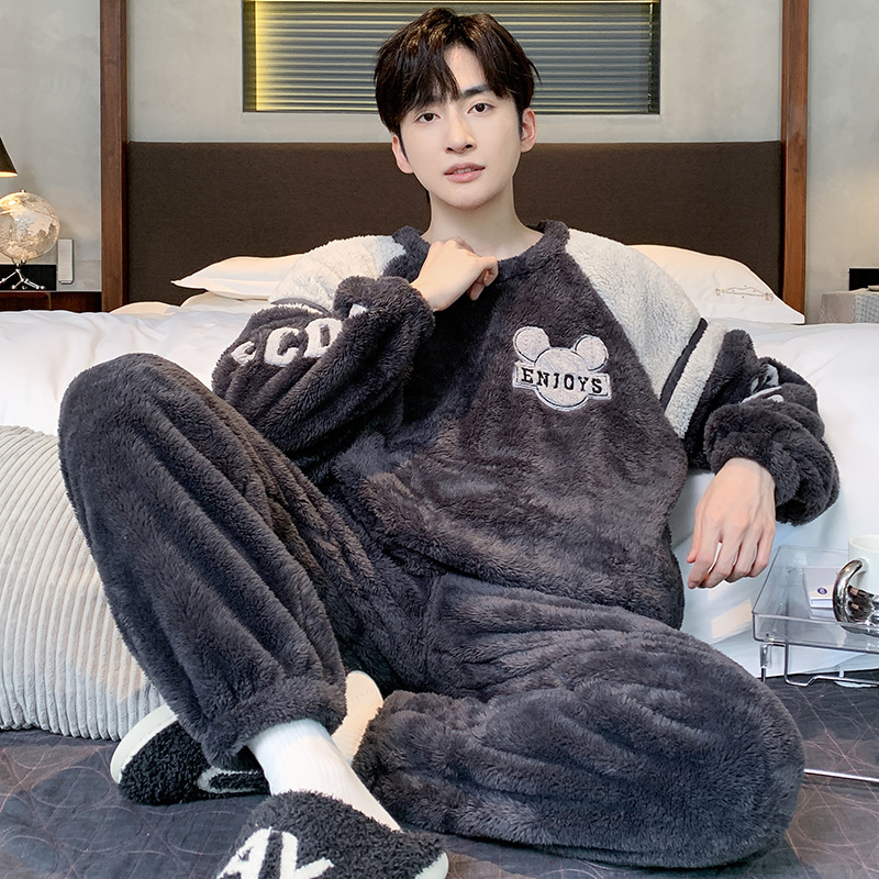 산호 양털 잠옷 남자의 가을과 겨울 기모 두꺼운 세트 남자의 한국식 라운드 넥 플란넬 남성용 따뜻한 가정 의류스토어 가기