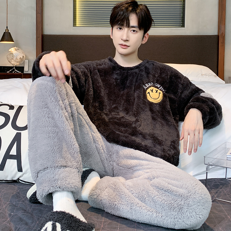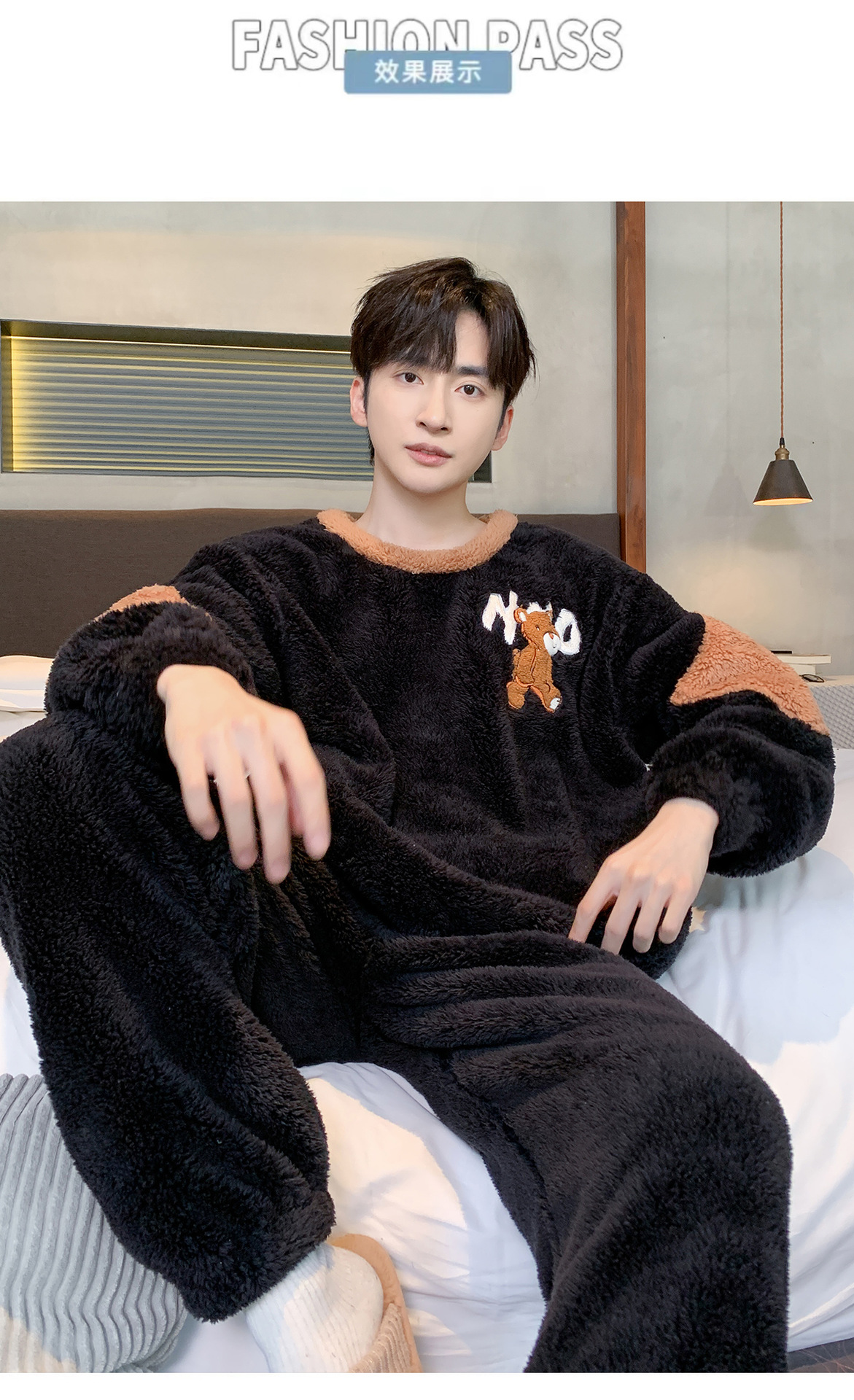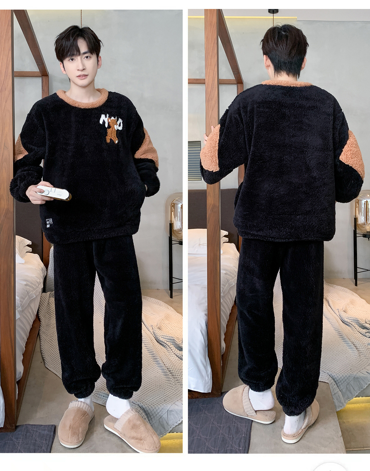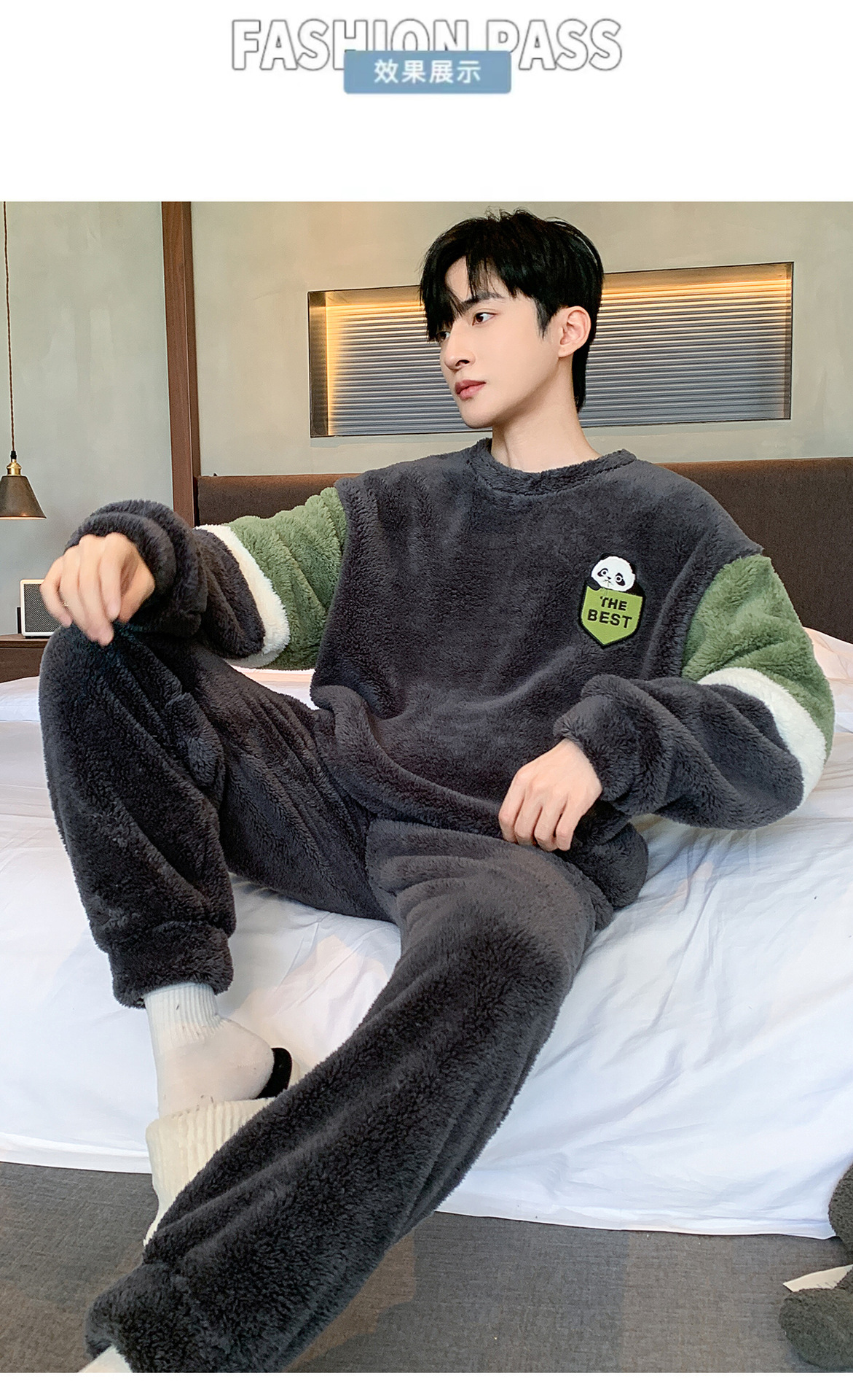 산호 양털 잠옷 남자의 가을과 겨울 기모 두꺼운 세트 남자의 한국식 라운드 넥 플란넬 남성용 따뜻한 가정 의류스토어 가기