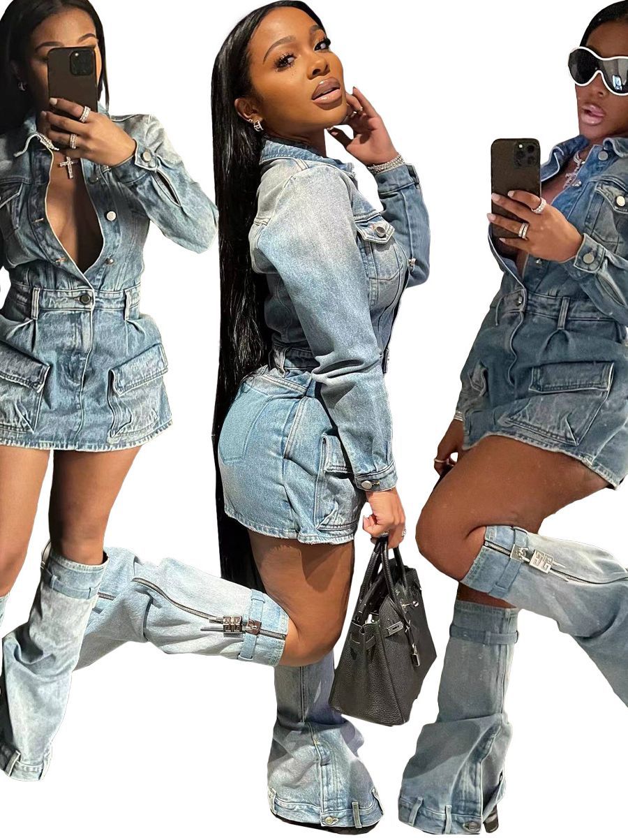NY8150 아마존 유럽과 미국 여성 섹시한 멀티 포켓 세탁 데님 원피스 3 피스 세트 (바지 다리 포함)스토어 가기