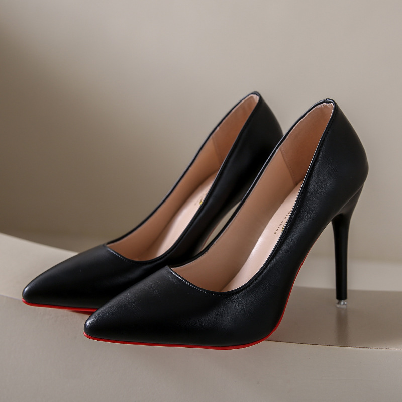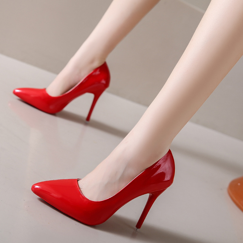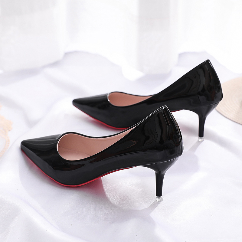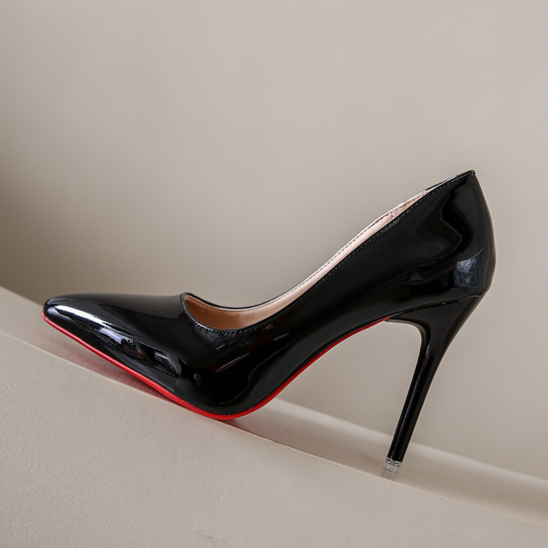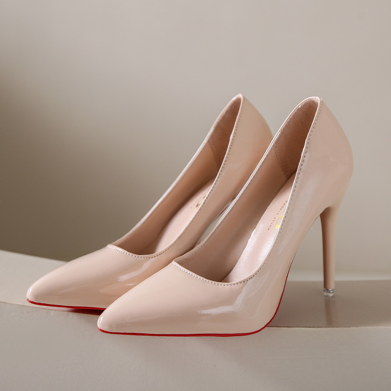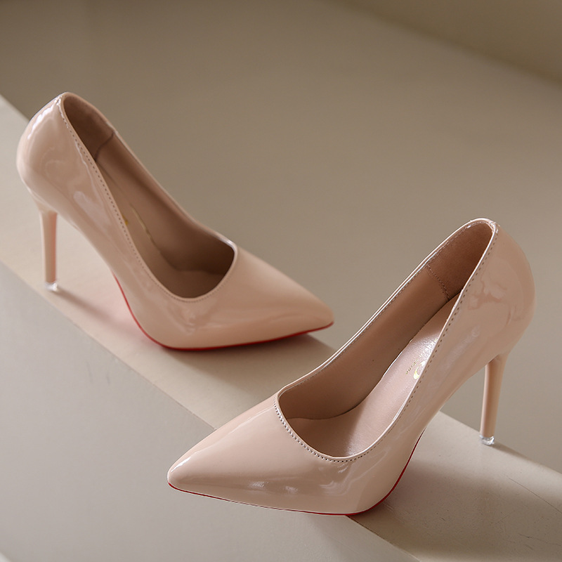 유럽과 미국 스타일 심플 얕은 입 슬리밍 얇은 굽 여성 신발 2023 봄 새로운 누드 뾰족한 에나멜 가죽 하이힐 신발스토어 가기