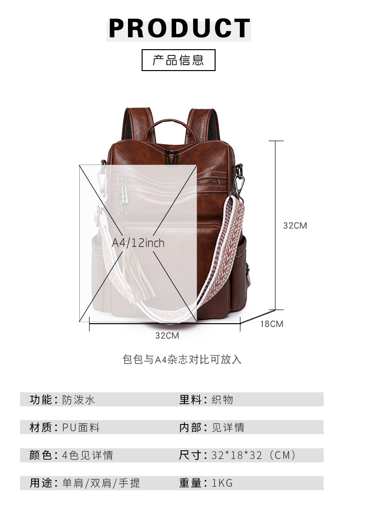 产品搭配一条加宽单肩带,5CM宽度,全编织工艺,同产品后背肩带下部配色呼应;