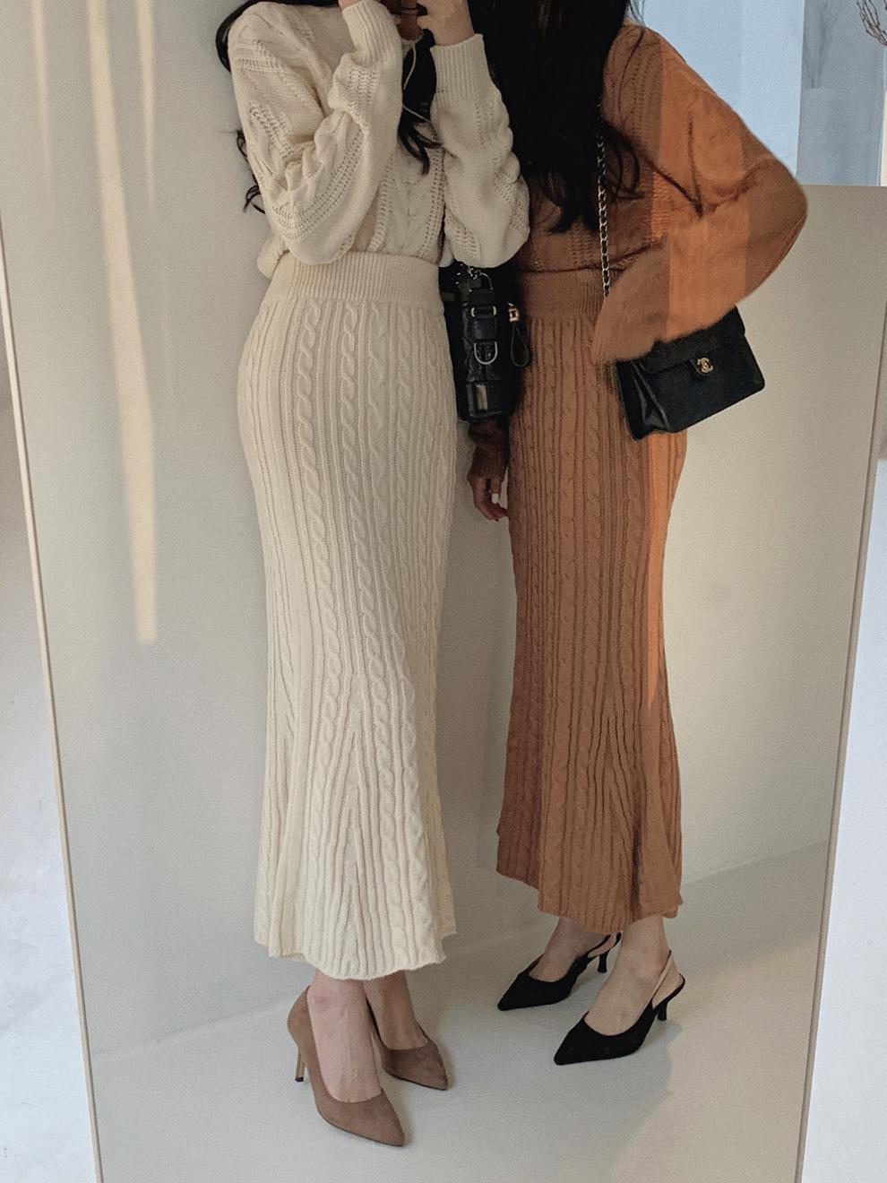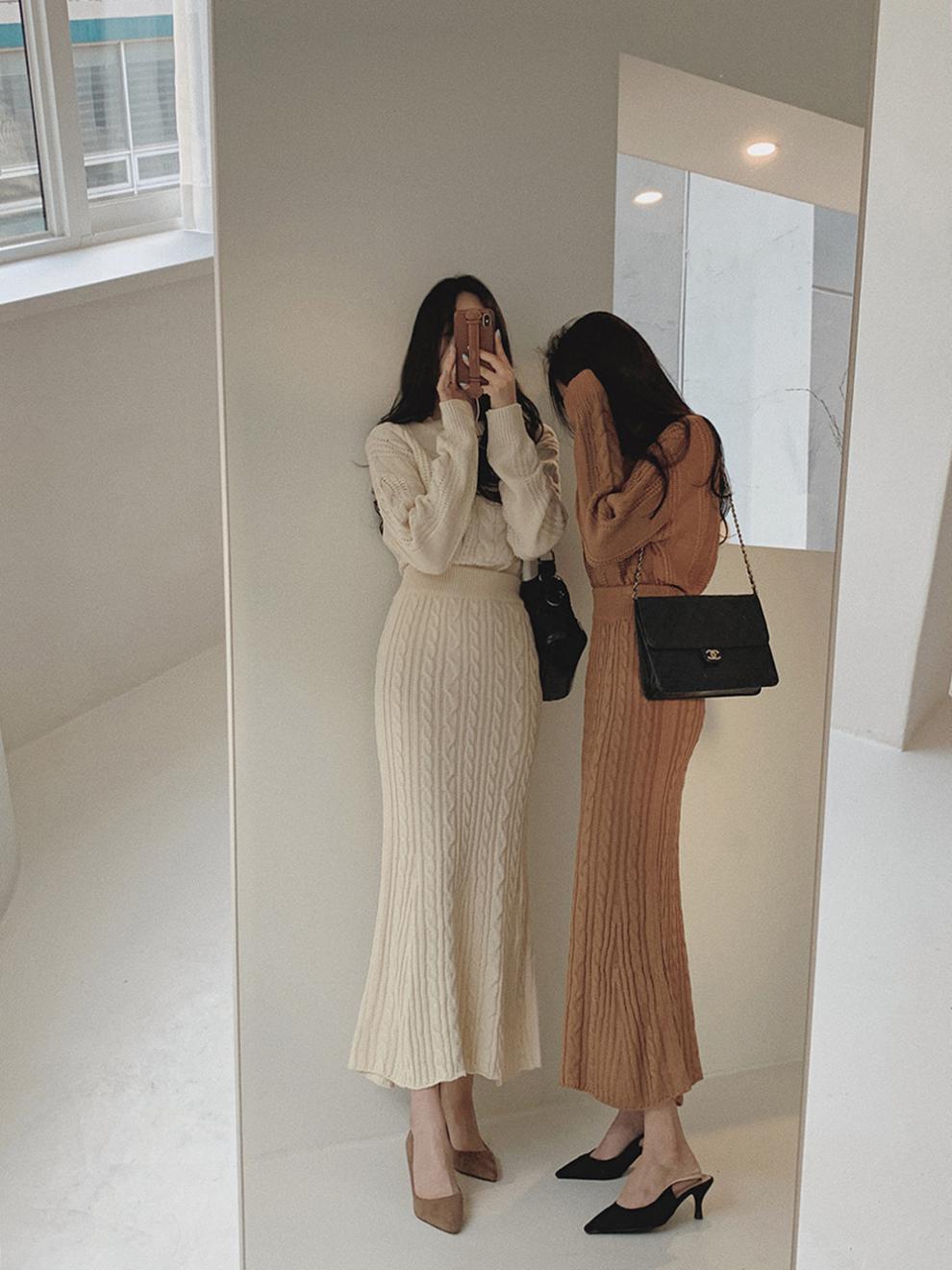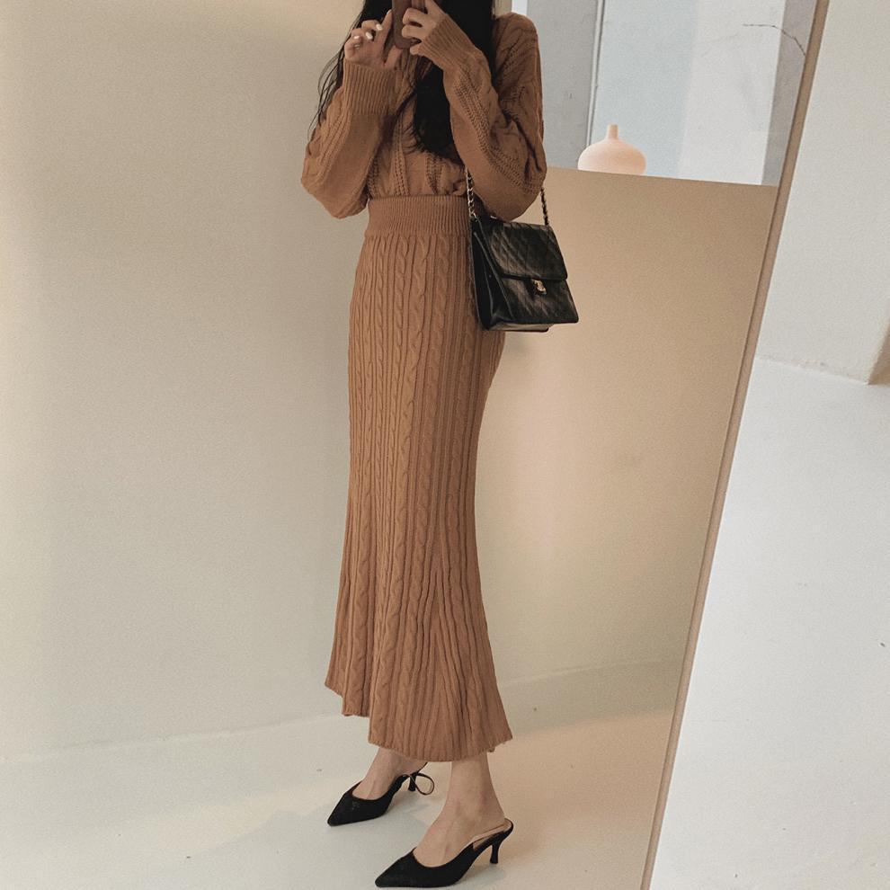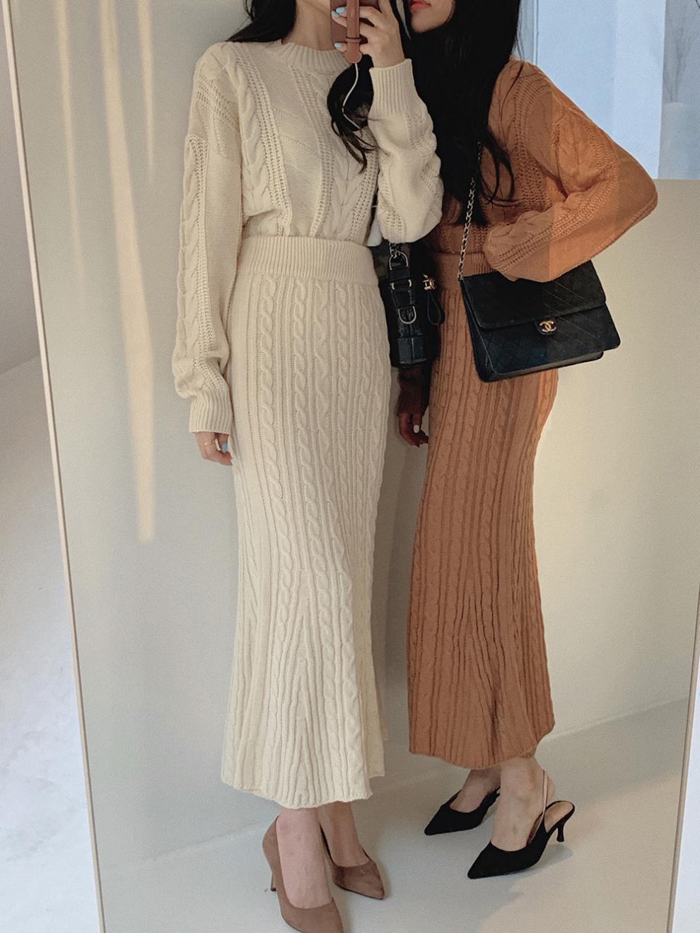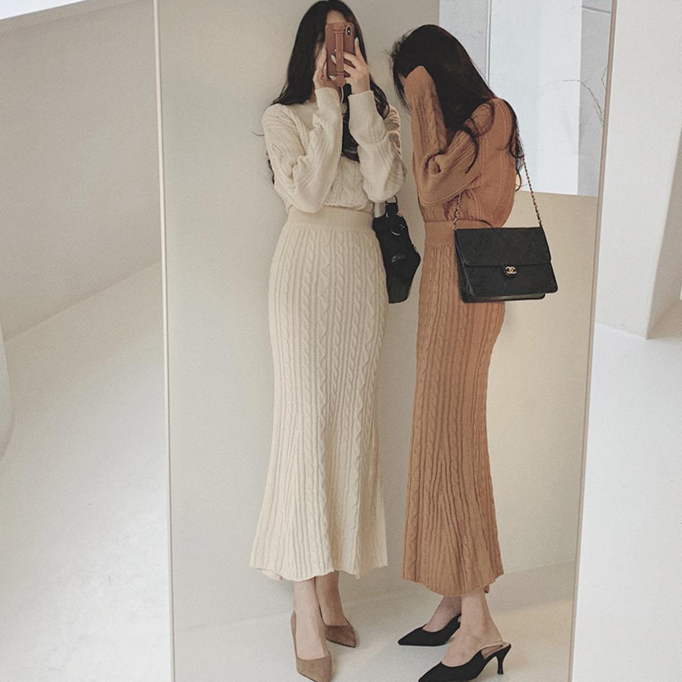 한국풍 시크한 가을 겨울 활용도 높은 트렌디한 루즈핏 스웨터 상의+니트 머메이드 스커트 투피스 세트스토어 가기