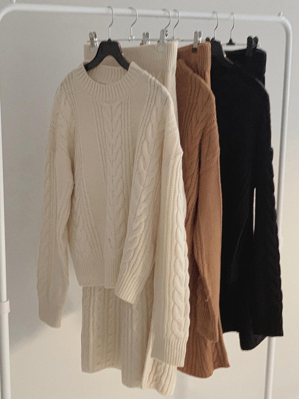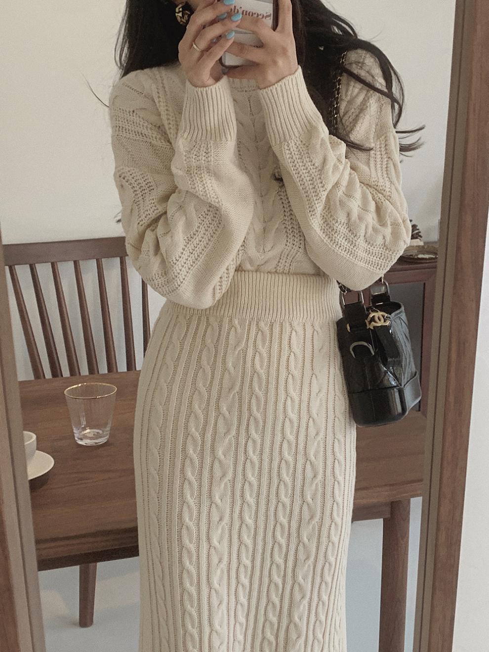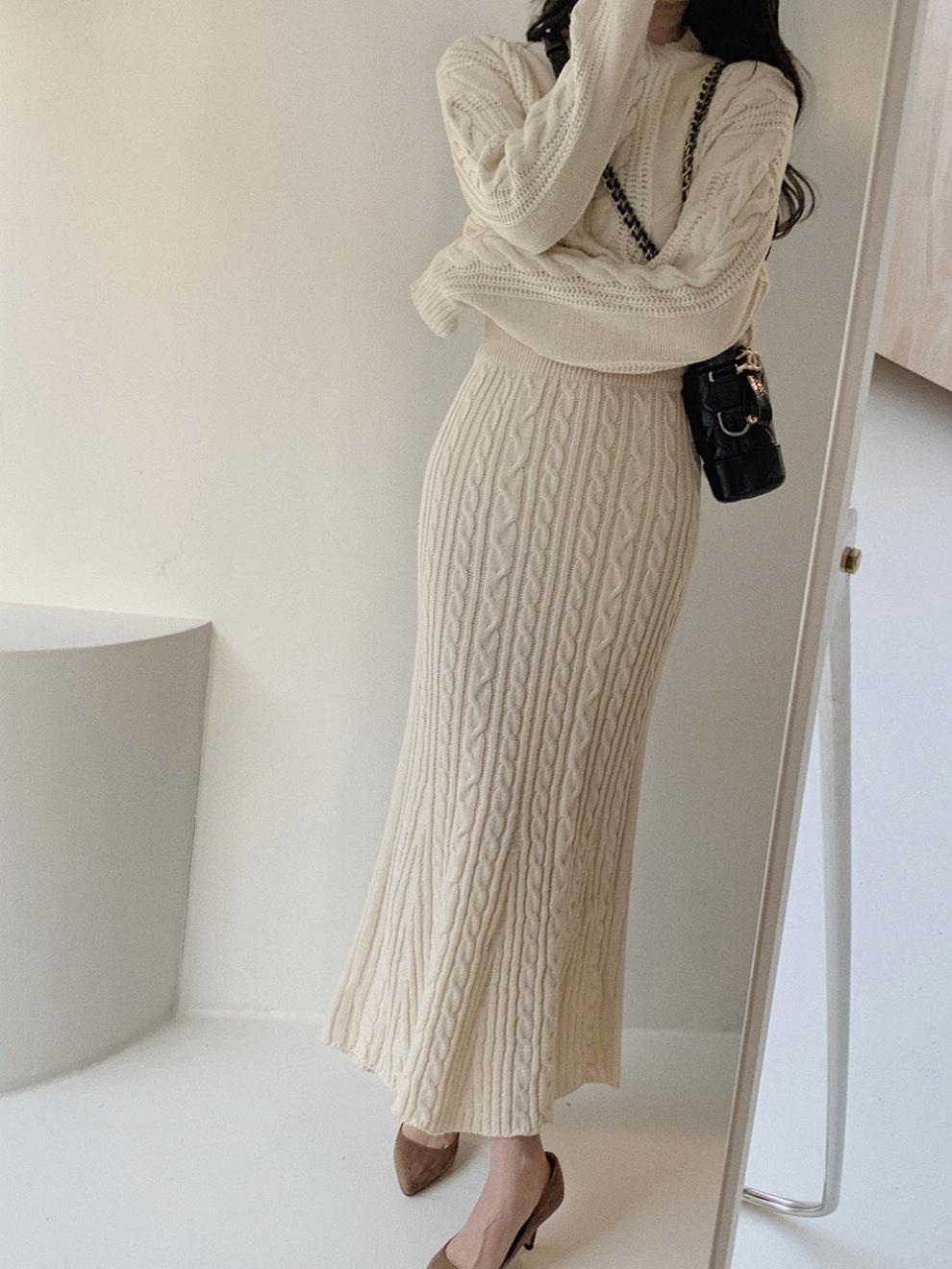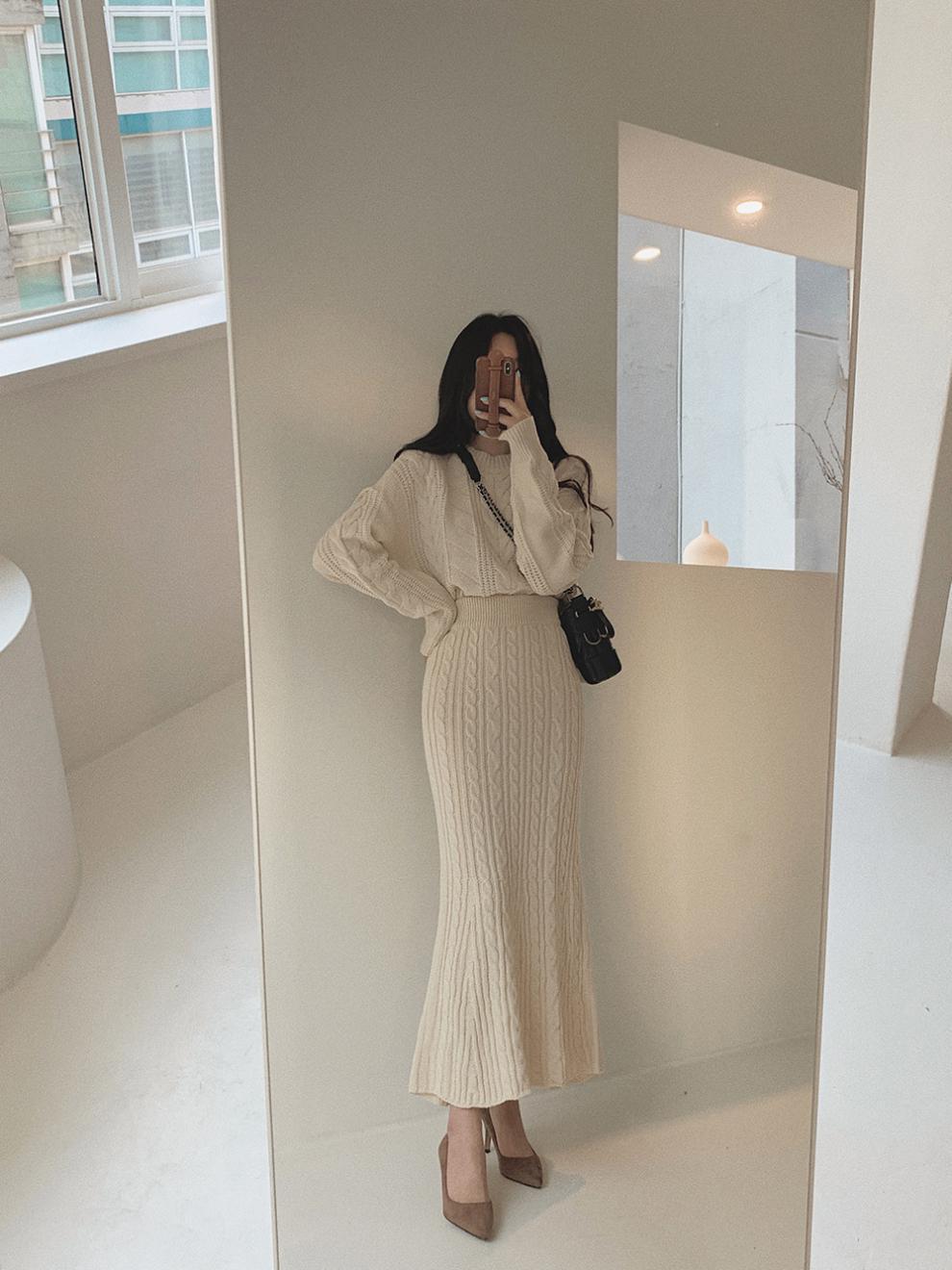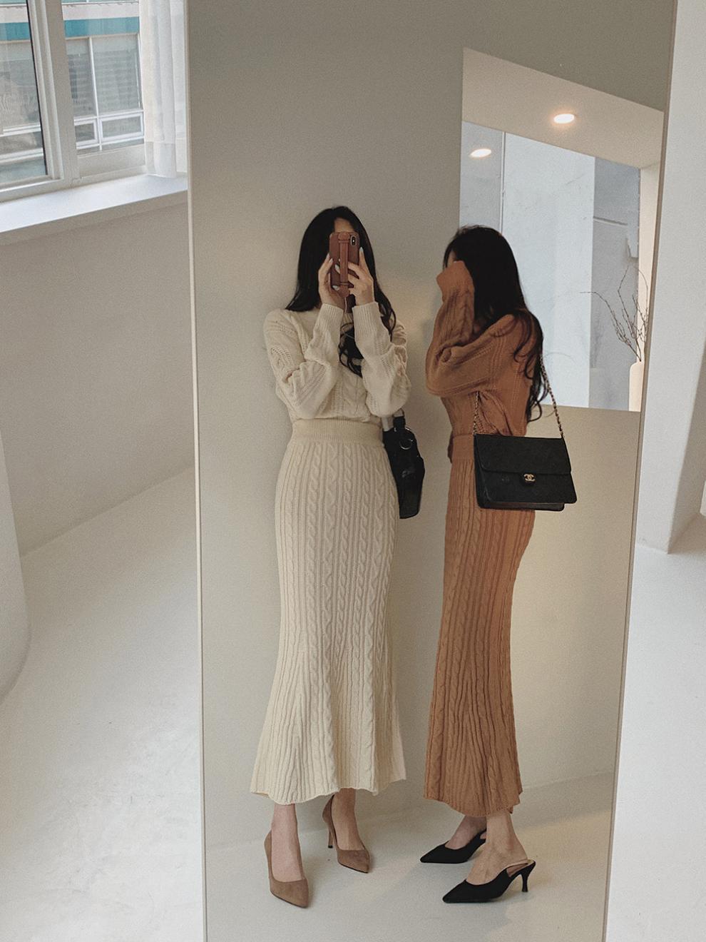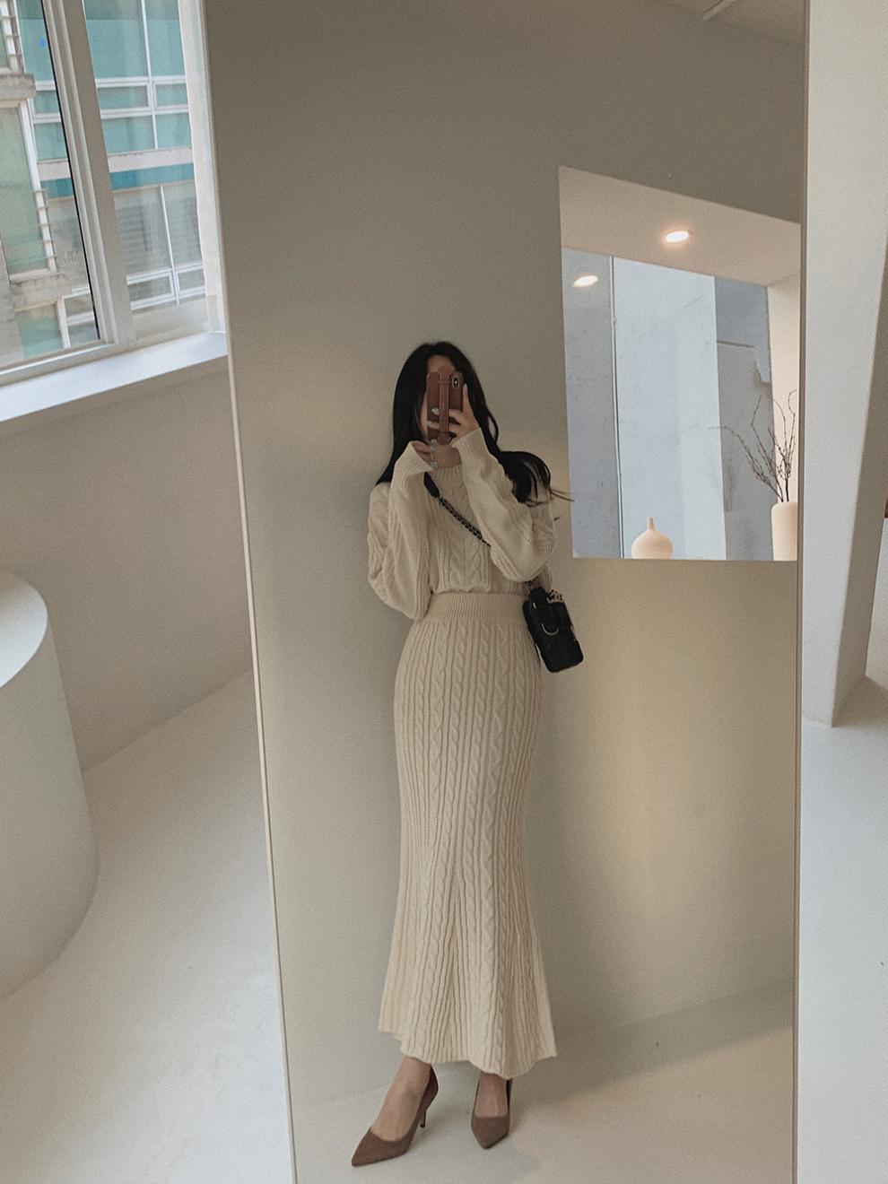 한국풍 시크한 가을 겨울 활용도 높은 트렌디한 루즈핏 스웨터 상의+니트 머메이드 스커트 투피스 세트스토어 가기