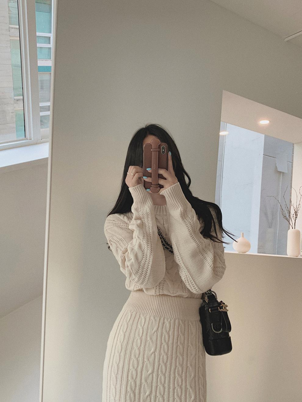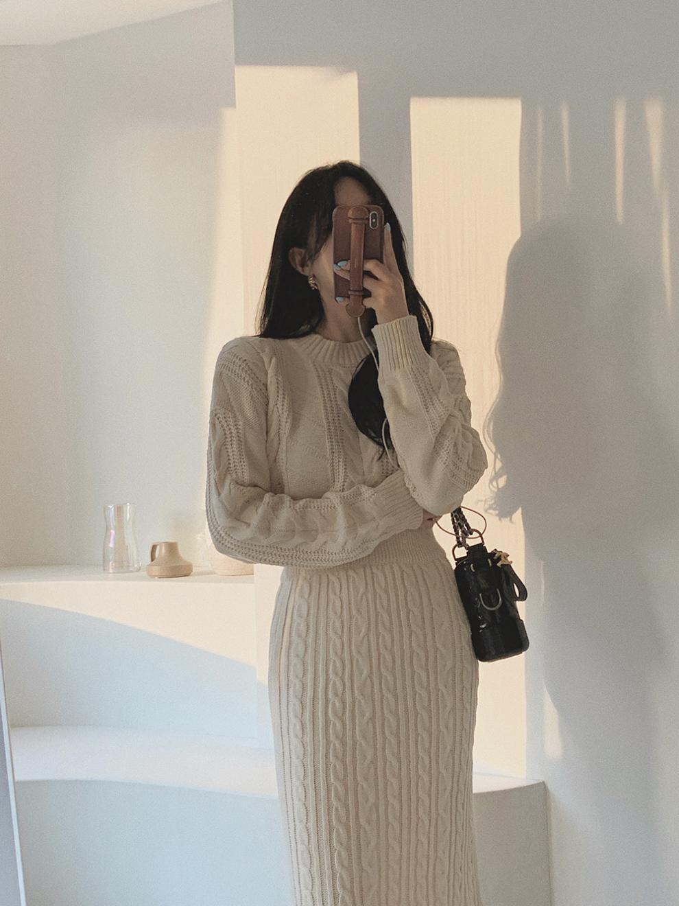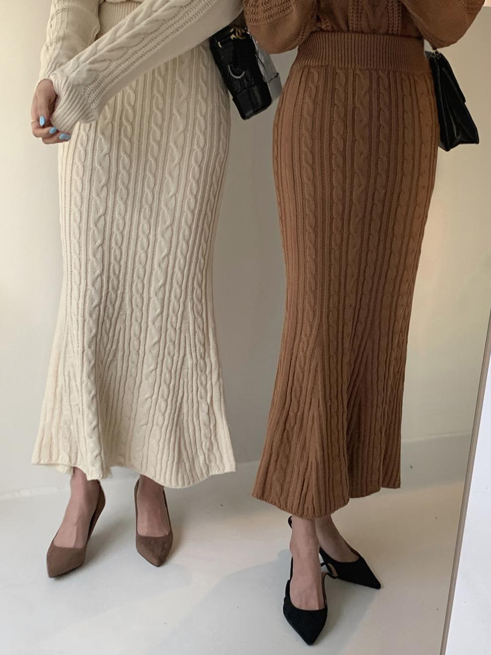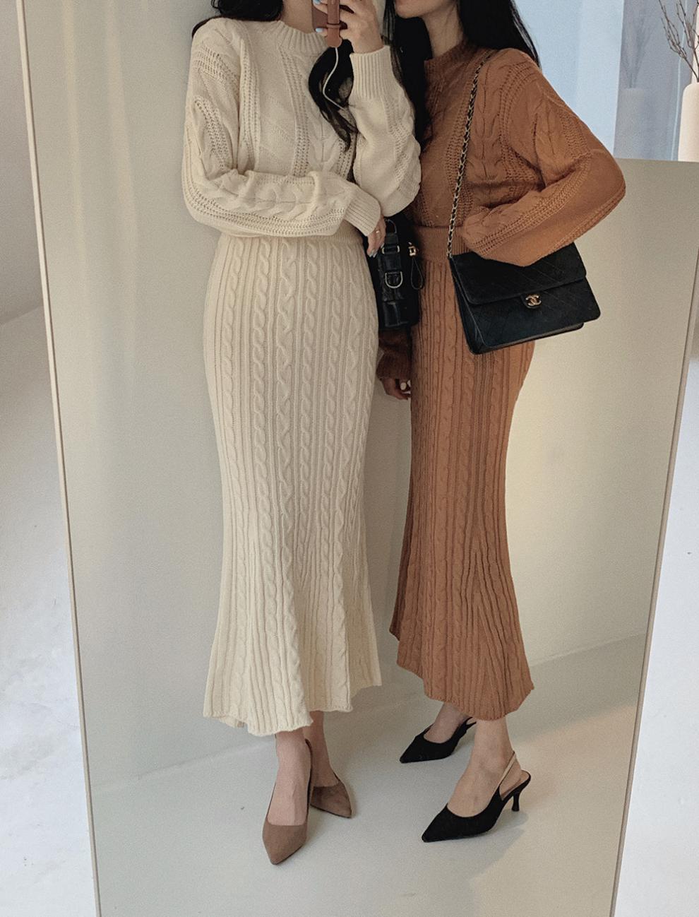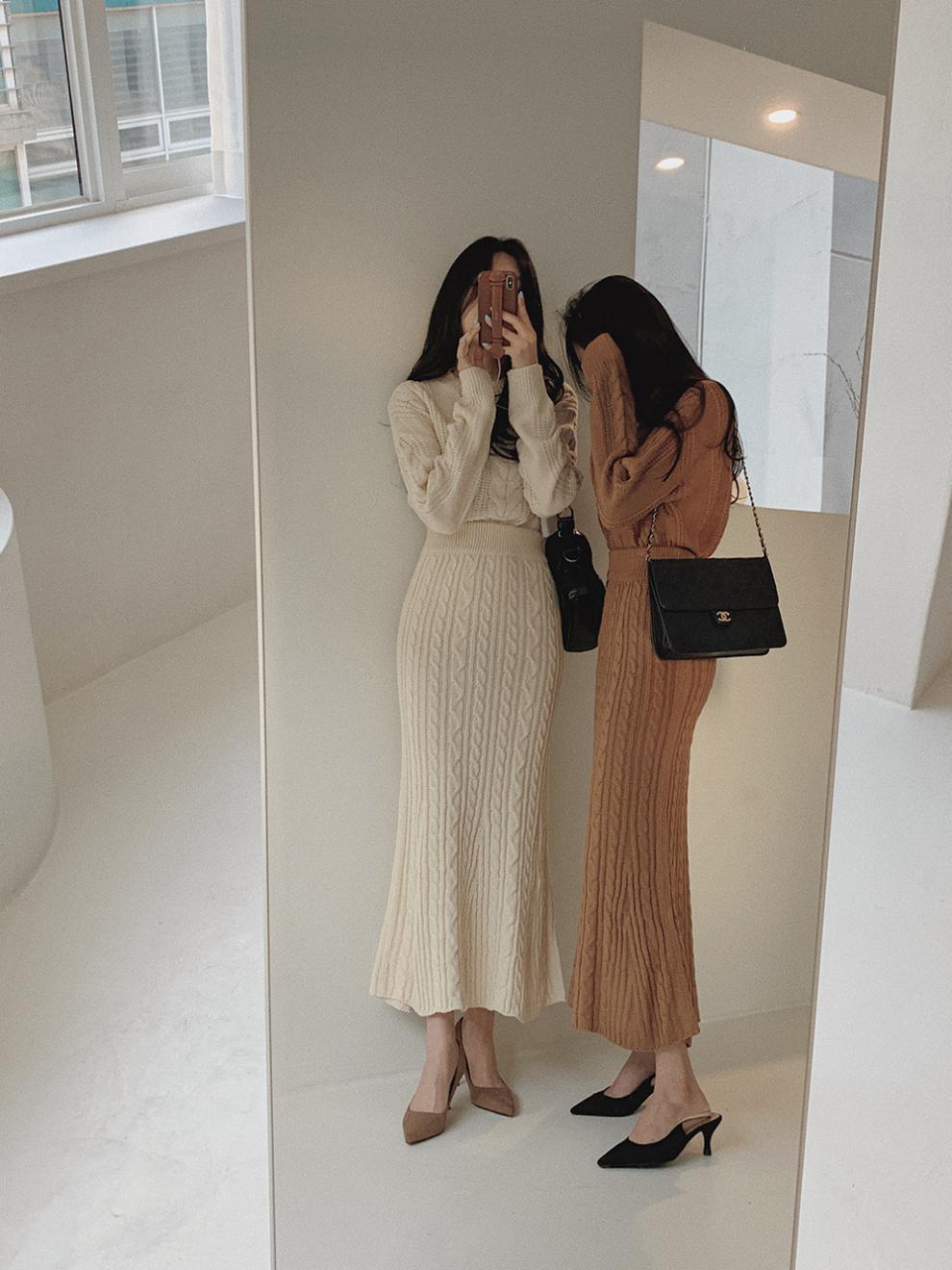 한국풍 시크한 가을 겨울 활용도 높은 트렌디한 루즈핏 스웨터 상의+니트 머메이드 스커트 투피스 세트스토어 가기